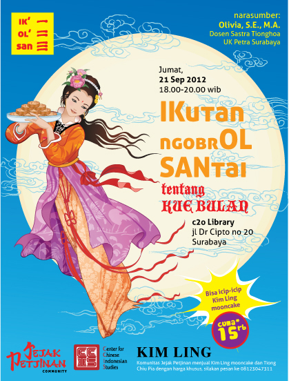 Library's collection Library's IT development CancelIkutan ngobrol santai tentang Kue Bulan dengan narasumber Olivia, S.E., M.A, dosen Sastra Tiongjoa Universitas Kristen Petra Surabaya tanggal 21 September 2012. Acara IK OL SAN ini bukan acara diskusi atau seminar yang serius, selalu ada ruang untuk ngobrol santai tentang apa saja, selalu