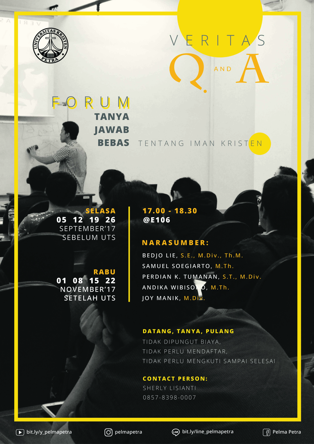 Library's collection Library's IT development CancelPusat Kerohanian UK Petra mengadakan acara tanya jawab iman kristen. Forum tanya jawab ini diadakan setiap hari Selasa dan Rabu pada bulan September dan Oktober 2017. Bertempat di ruang E.106 pada pukul 17.00 - 18.30.