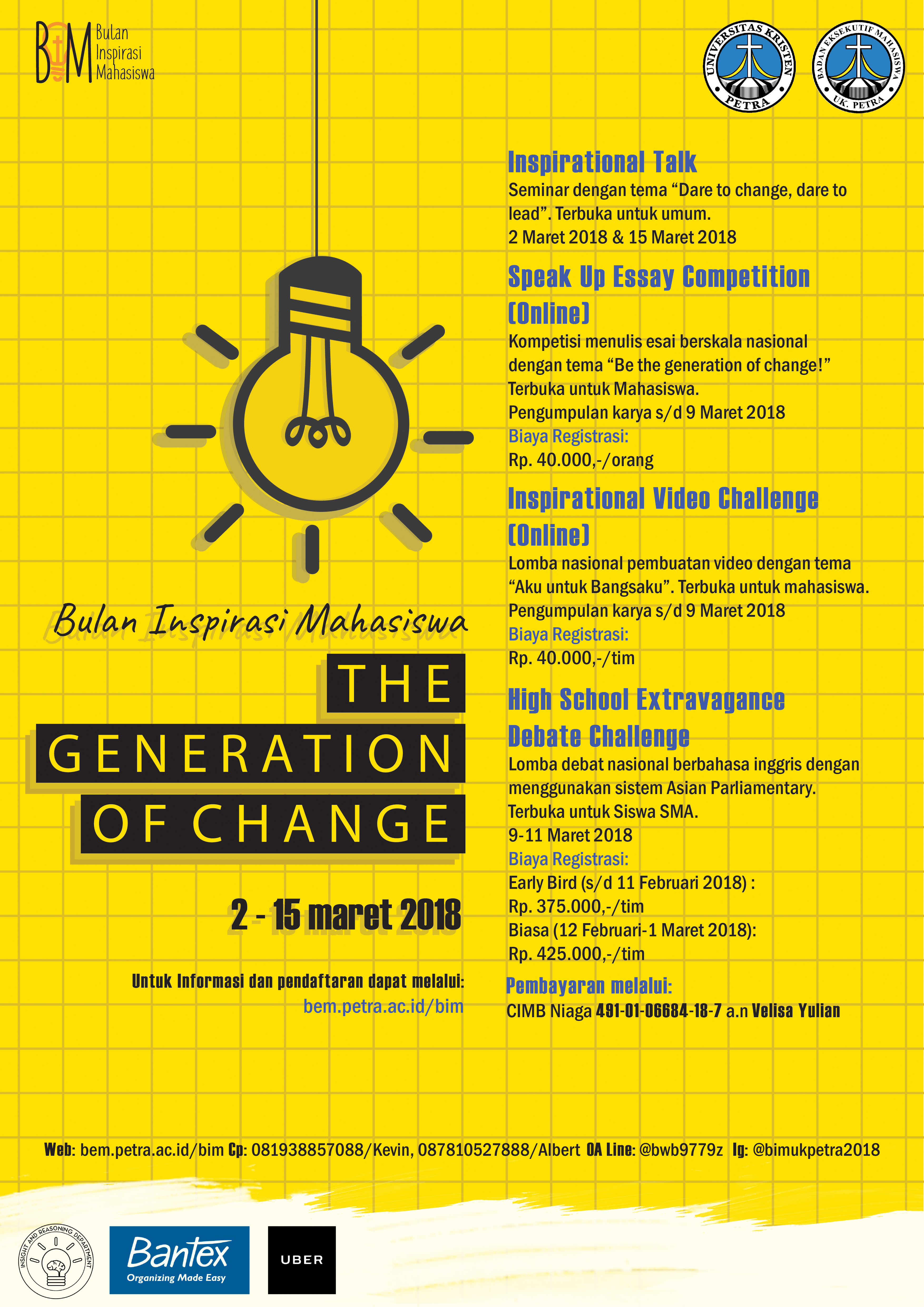 Library's collection Library's IT development CancelBadan Eksekutif Mahasiswa UK Petra, mengadakan acara yang bernama Bulan Inspirasi Mahasiswa (The Generation of change). Dalam acara ini terdapat beberapa kegiatan yang bisa diikuti peserta, seperti seminar, lomba menulis, lomba membuat video, dan lomba debat. Rangkaian kegiatan ini dilaksanakan pada 2-15 Maret 2018. Untuk informasi dan pendaftaran dilihat di bem.petra.ac.id/bim