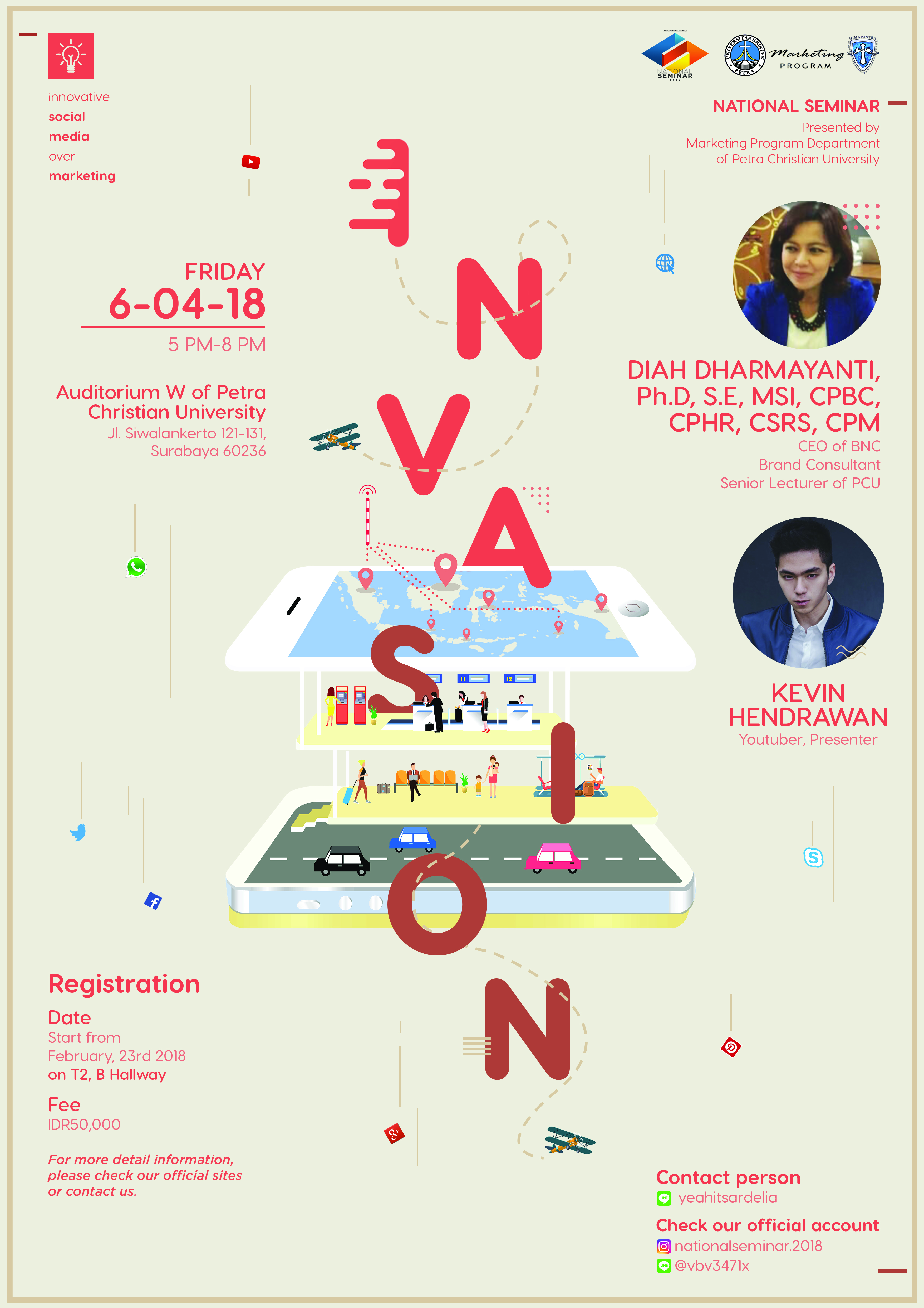 Library's collection Library's IT development CancelManajemen Pemasaran Universitas Kristen Petra Surabaya mengadakan seminar yang bertema Invasion. Dengan mendatangkan narasumber Diah Dharmayanti dan Kevin Hendrawan acara ini diadakan pada tanggal 06 April 2018. Bertempat di Auditorium UK Petra Surabaya.
