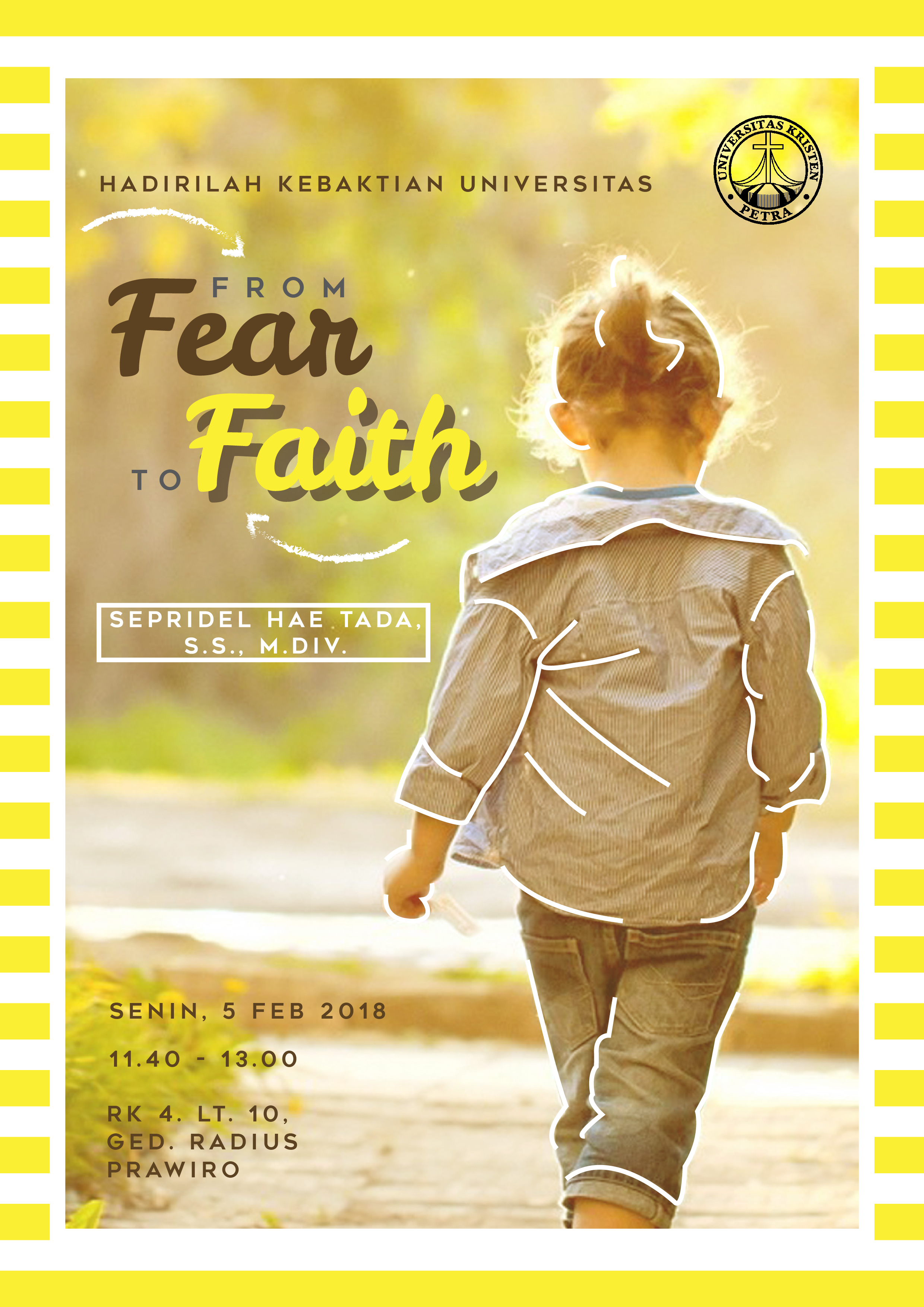 Library's collection Library's IT development CancelUniversitas Kristen Petra Surabaya melalui Pusat Kerohanian, mengundang seluruh civitas UK Petra untuk hadir dalam kebaktian universitas yang bertemakan From Fear to Faith dengan pengkhotbah Spridel Hae Tada. Kebaktian ini diadakan pada 5 Februari 2018 bertempat di RK IV lantai 10 gedung lantai 10.