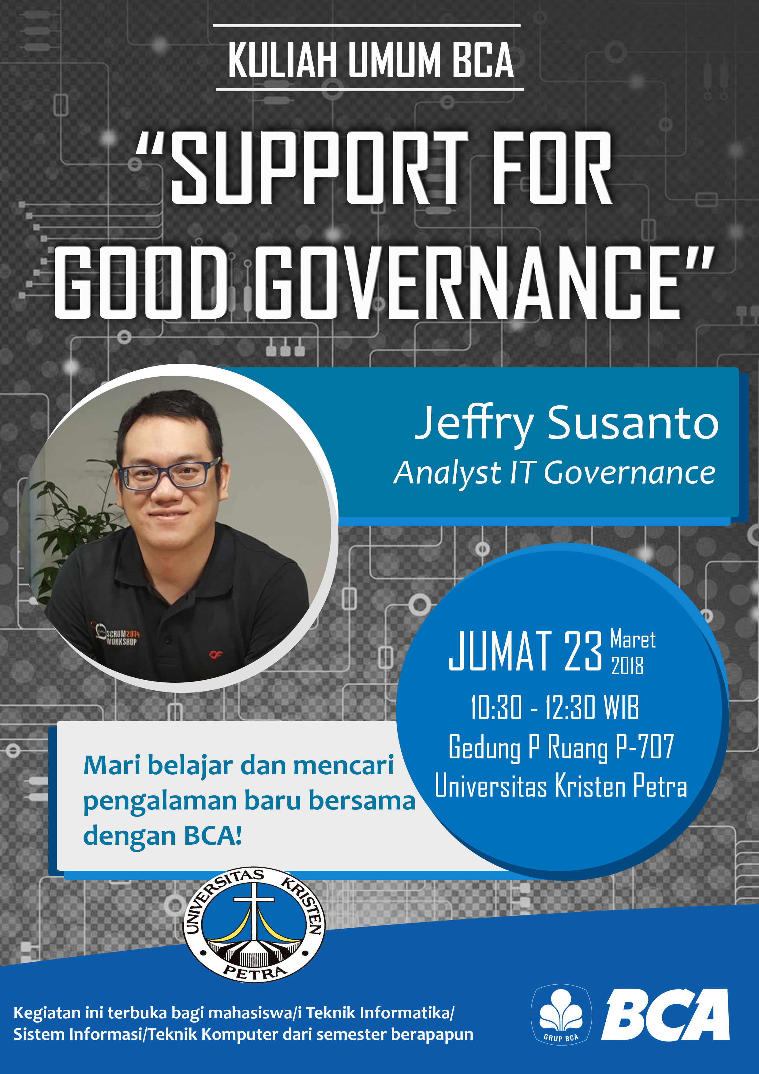 Library's collection Library's IT development CancelProgram Studi Teknik Informatika Univwersitas Kristen Petra Surabaya pada tanggal 23 Maret 2018 mengadakan kuliah umum BCA dengan topik "Support for good governance", dengan narasumber Jeffrey Susanto. Acara ini diselenggarakan di gedung P.707.