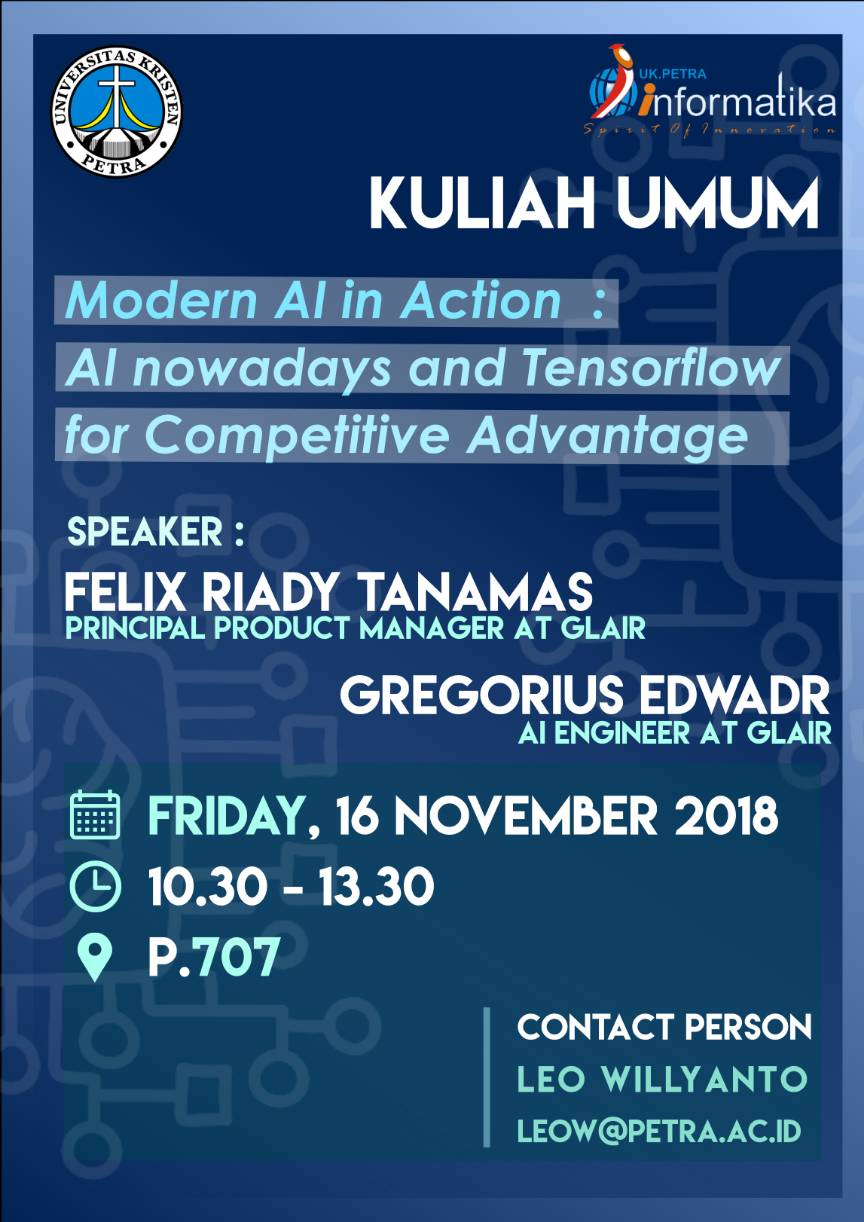 Library's collection Library's IT development CancelProgram Studi Teknik Informatika Universitas Kristen Petra Surabaya, pada tanggal 16 November 2018 mengadakan acara kuliah tamu dengan tema: "Modern AI in action". Dengan narasumber bapak Felix Riady Tanamas dan bapak Gregorius Edward. Bertempat di gedung P.707 pukul 10.30 -13.30 WIB.
