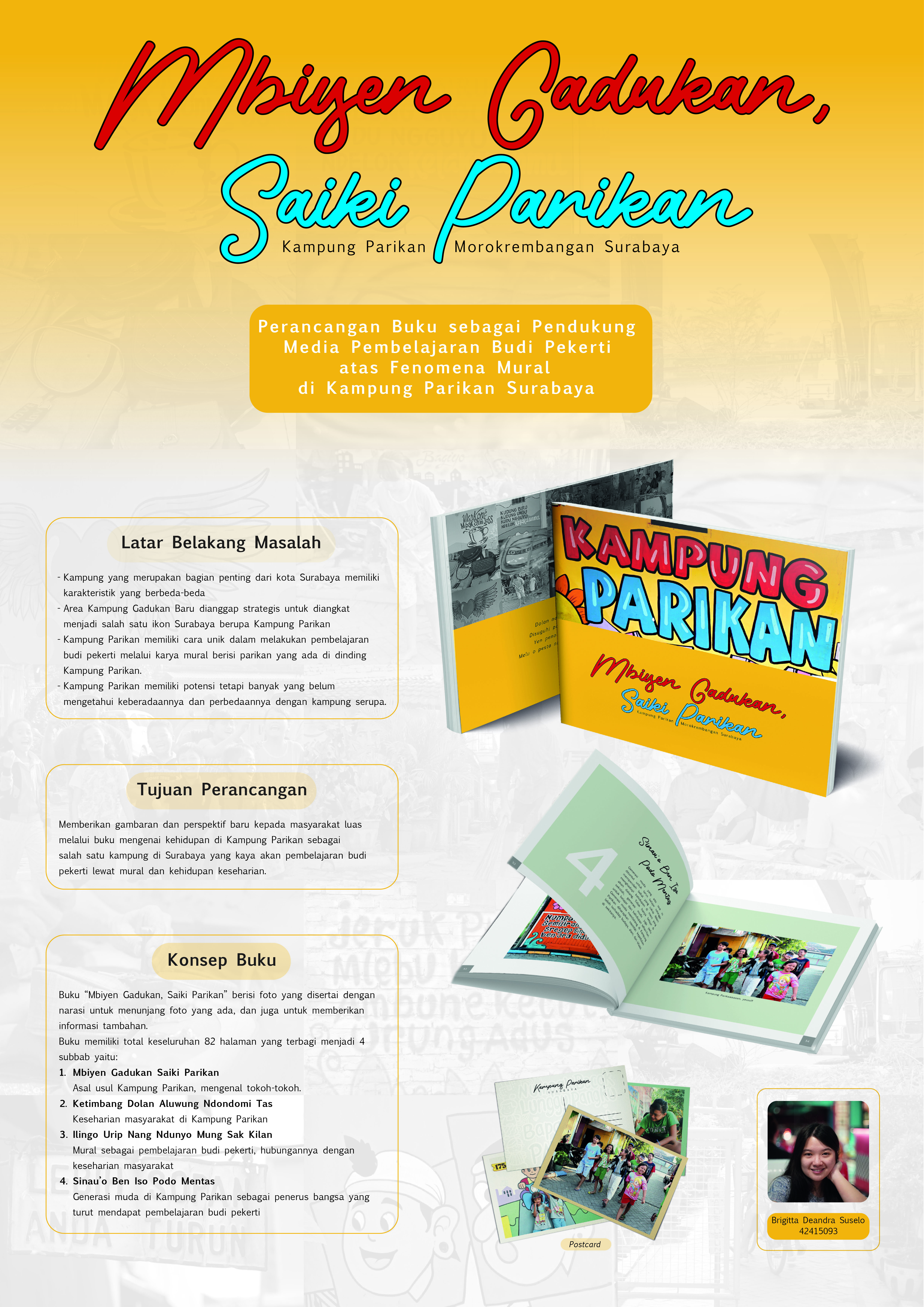 Library's collection Library's IT development CancelKampung Parikan atau yang dahulu lebih dikenal sebagai Kampung Gadukan Baru merupakan sebuah kampung yang terletak pada bagian kota Surabaya Utara. Terletak di dekat Kali Bosem dan terlihat dari jalan tol Perak-Pandaan lokasi Kampung Parikan dianggap strategis untuk diangkat menjadi salah satu ikon di Surabaya. Konsep kampung warna-warni saat ini sudah banyak diaplikasikan ke kampung-kampung seluruh Indonesia, yang membedakan Kampung Parikan dengan kampung lainnya yaitu adanya mural parikan yang di dalamnya terdapat pembelajaran tentang nilai-nilai budi pekerti dan relasi masyarakat. Perancangan ini dibuat dengan tujuan menciptakan perspektif baru mengenai kehidupan di Kampung Parikan yang kaya akan pembelajaran budi pekerti, baik dari mural maupun kehidupan keseharian masyarakatnya melalui media buku yang berisi foto dokumentasi dan informasi penunjang.
