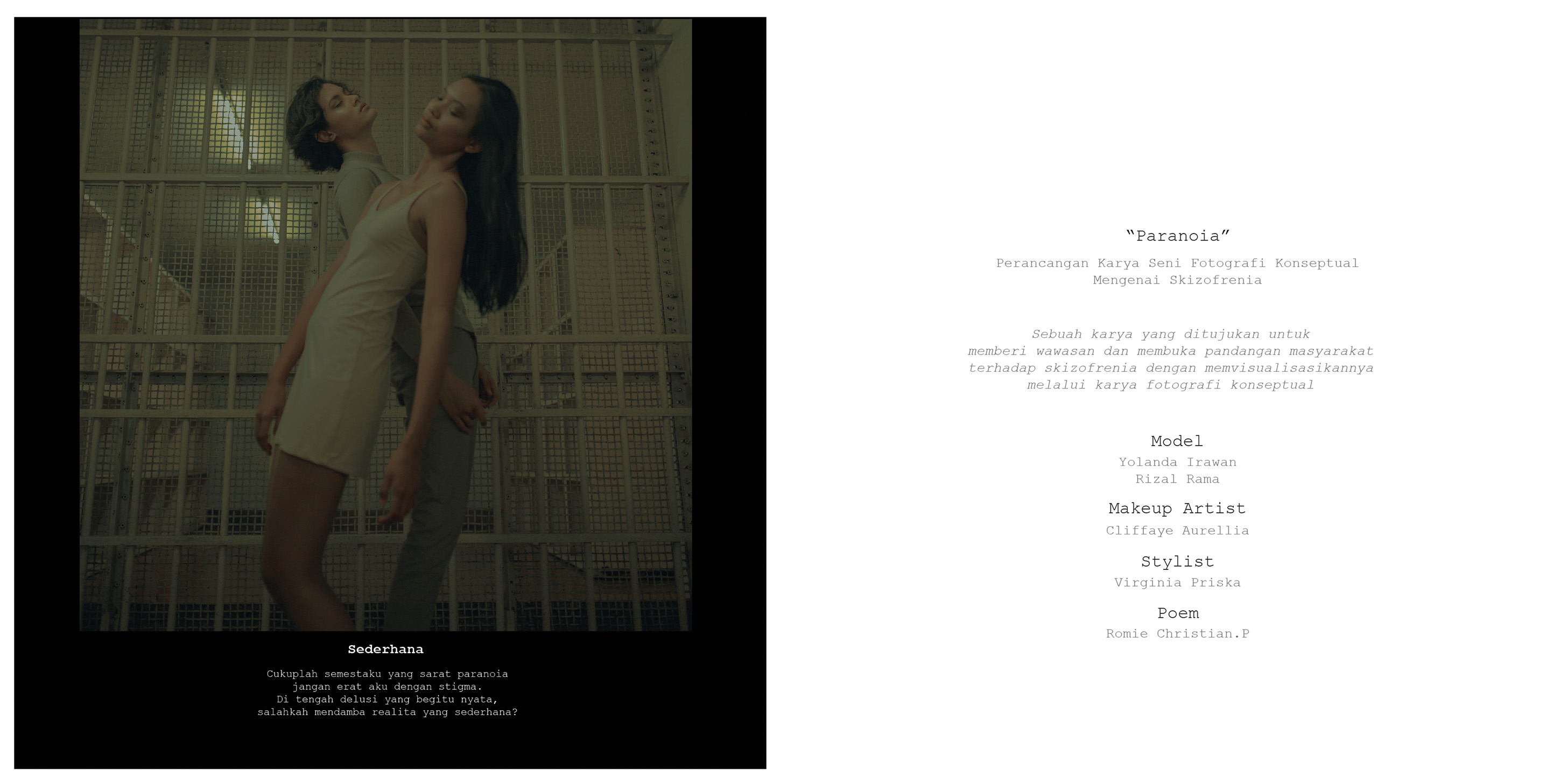 Library's collection Library's IT development CancelSkizofrenia merupakan gangguan otak yang rumit, kronis, parah, dan melumpuhkan yang terjadi pada sekitar 1% dari seluruh orang dewasa secara global. Namun, sampai saat ini pemahaman masyarakat mengenai gangguan jiwa serta keterbelakangan mental sangat minim. Melalui media fotografi sebagai sarana komunikasi secara visual, perancangan ini diharapkan dapat memberikan wawasan dan menyebarkan awareness mengenai skizofrenia terhadap masyarakat.