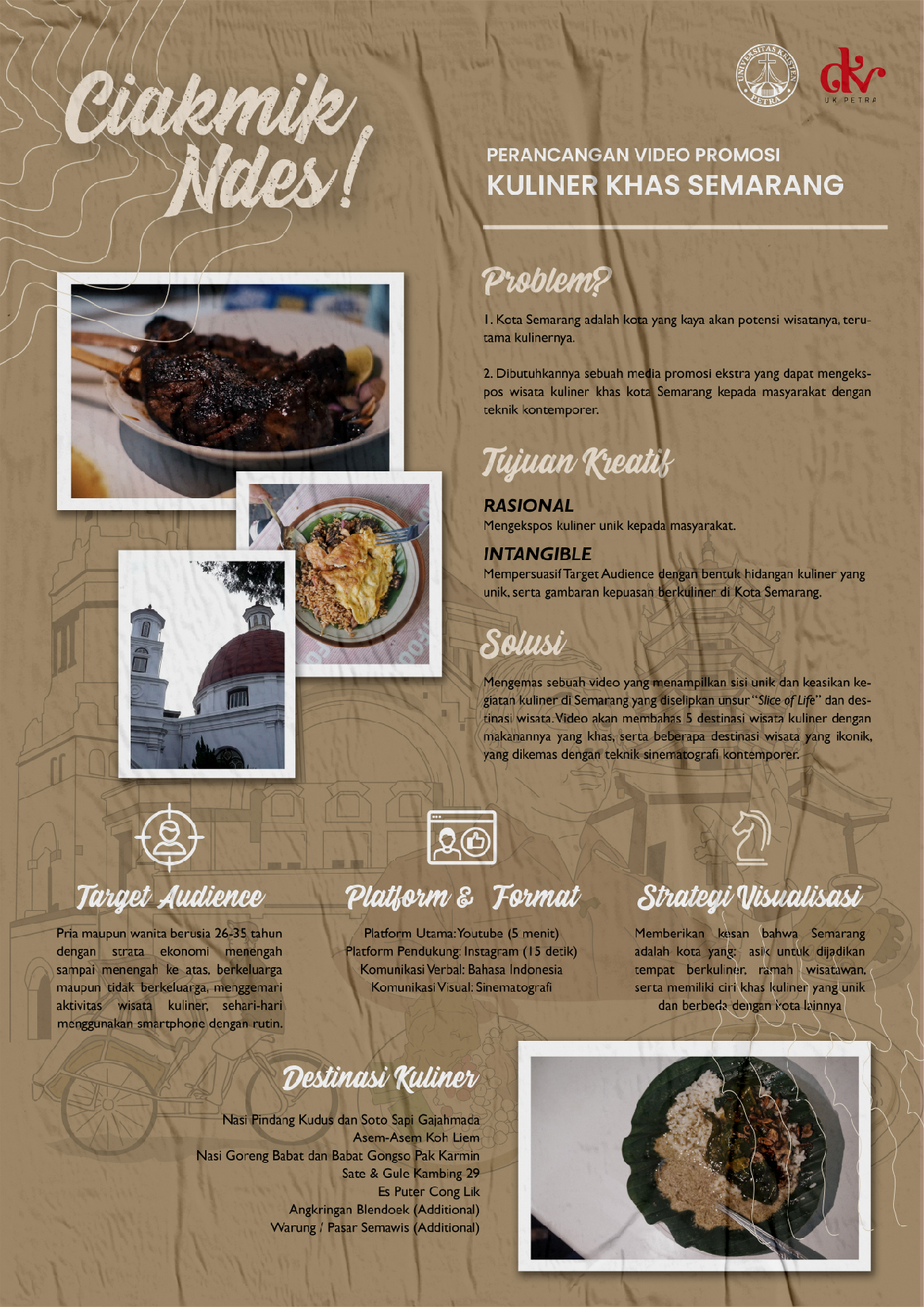 Library's collection Library's IT development CancelMelalui media Audio Visual berupa video promosi, maka diharapkan mampu mengekspos dan memperkenalkan kuliner khas kota Semarang dan juga suasana kepuasan berkulinernya lewat cuplikan gambar dan juga suara. Atas pemikiran inilah maka dibuatlah perancangan tugas akhir ini. Mengangkat tema kuliner Semarang yang berasal dari Jawa Tengah, maka dimulailah pembuatan proyek ini dengan bertumpu pada tahap-tahap pelaksanaan sebuah perancangan karya video digital yang terstruktur dan terkonsep. Mengutamakan konsep video, sudut pengambilan gambar, pewarnaan (color grading), editing dan finishing dengan visual effect tulisan sebagai informasi pendukung adalah garis besar konsep yang akan dihasilkan. Dikemas dalam satu kesatuan video promosi, maka dihasilkanlah satu karya audio visual yang diharapkan dapat menjadi suatu bentuk karya cipta seni yang menarik dalam format DVD, MPEG, MOV, WMA untuk secara langsung maupun tidak langsung dapat mendukung promosi wisata kuliner kota Semarang. Karya ini diharapkan dapat menjadi salah satu pemicu semangat, ajang pembuktian dan pengetahuan kepada masyarakat luas.