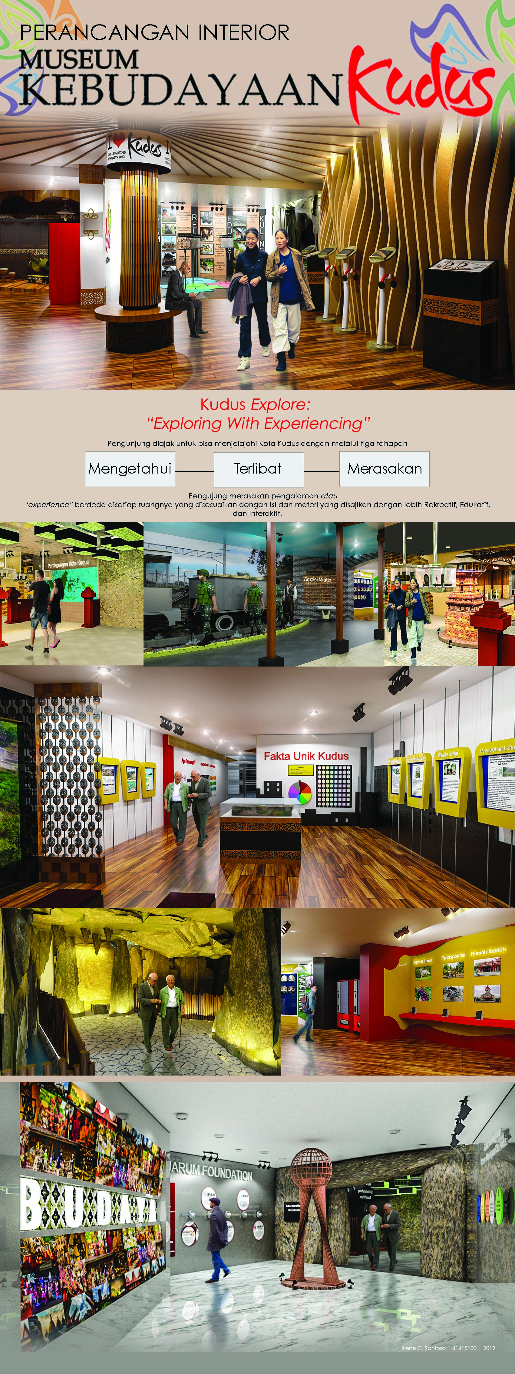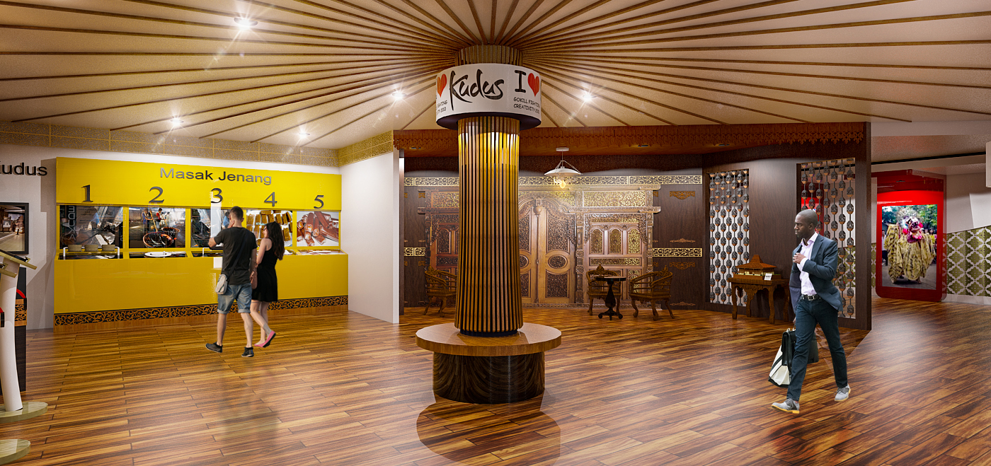 Library's collection Library's IT development CancelKudus dikenal sebagai daerah yang memiliki banyak rekam sejarah dan budaya, namun masih belum ada wadah yang mampu menaungi dan merepresentatifkan Kabupaten Kudus secara keseluruhan. Museum tematik yang ada masih bersifat konvensional. Oleh sebab itu Museum Kebudayaan Kudus dibuat dengan tampilan yang rekreatif, edukatif, interaktif. Metode yang dilakukan dengan menggunakan Metode Design Thinking dengan menggunakan tiga tahapan, yaitu Inspiration, Ideate, Implementation. Konsep perancangan Museum Kebudayaan Kudus adalah “Kudus Explore : Exploring and Experiencing”. Konsep ini menjadikan inovasi tampilan museum yang baru, dengan memberikan pengalaman pengunjung untuk menikmati perjalanan menjelajahi Kabupaten Kudus. Pengalaman terhadap pancaindera diterapkan dalam perancangan. Pengunjung diajak untuk bisa mengetahui, terlibat dan merasakan suasana dari Kabupaten Kudus.
