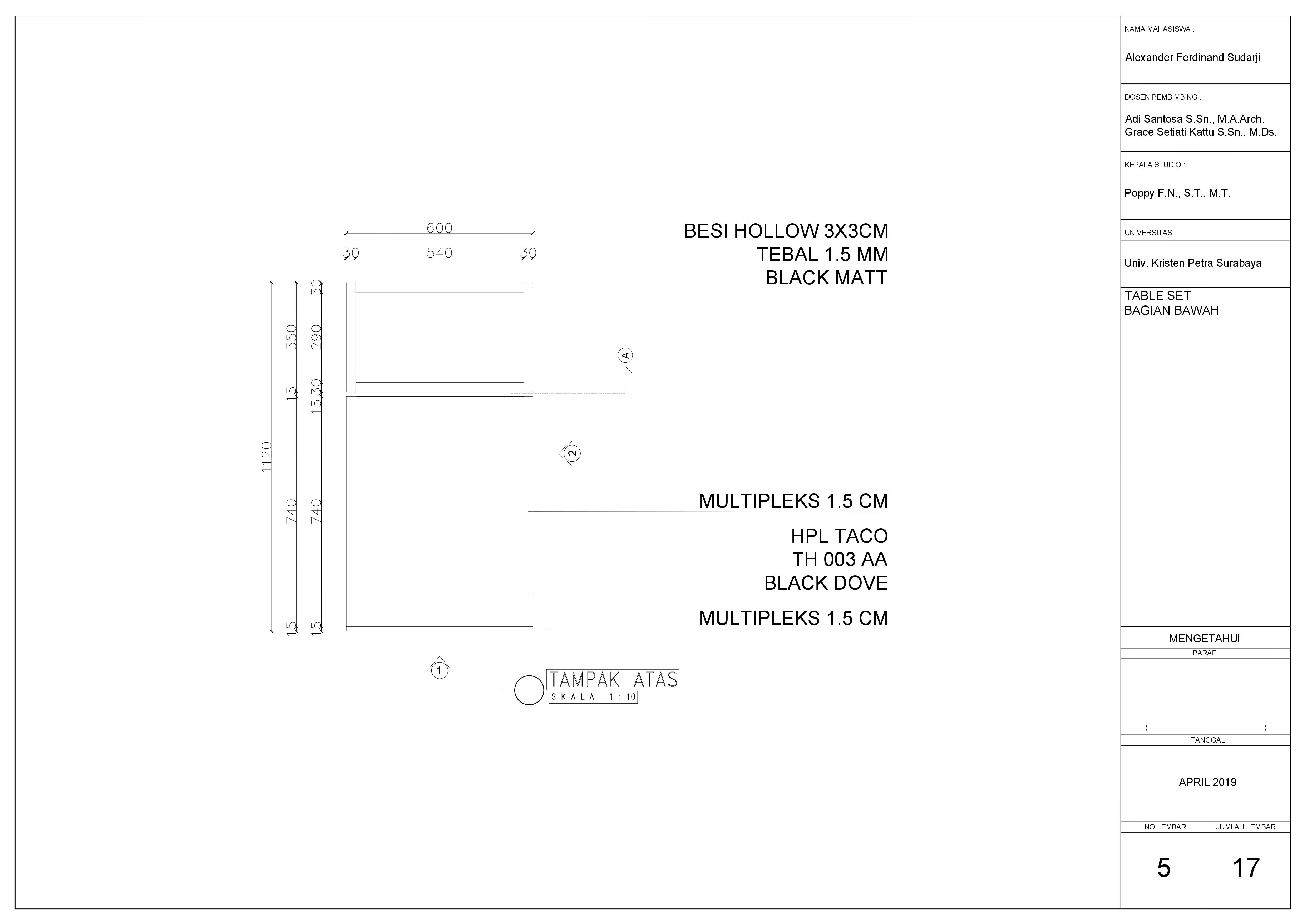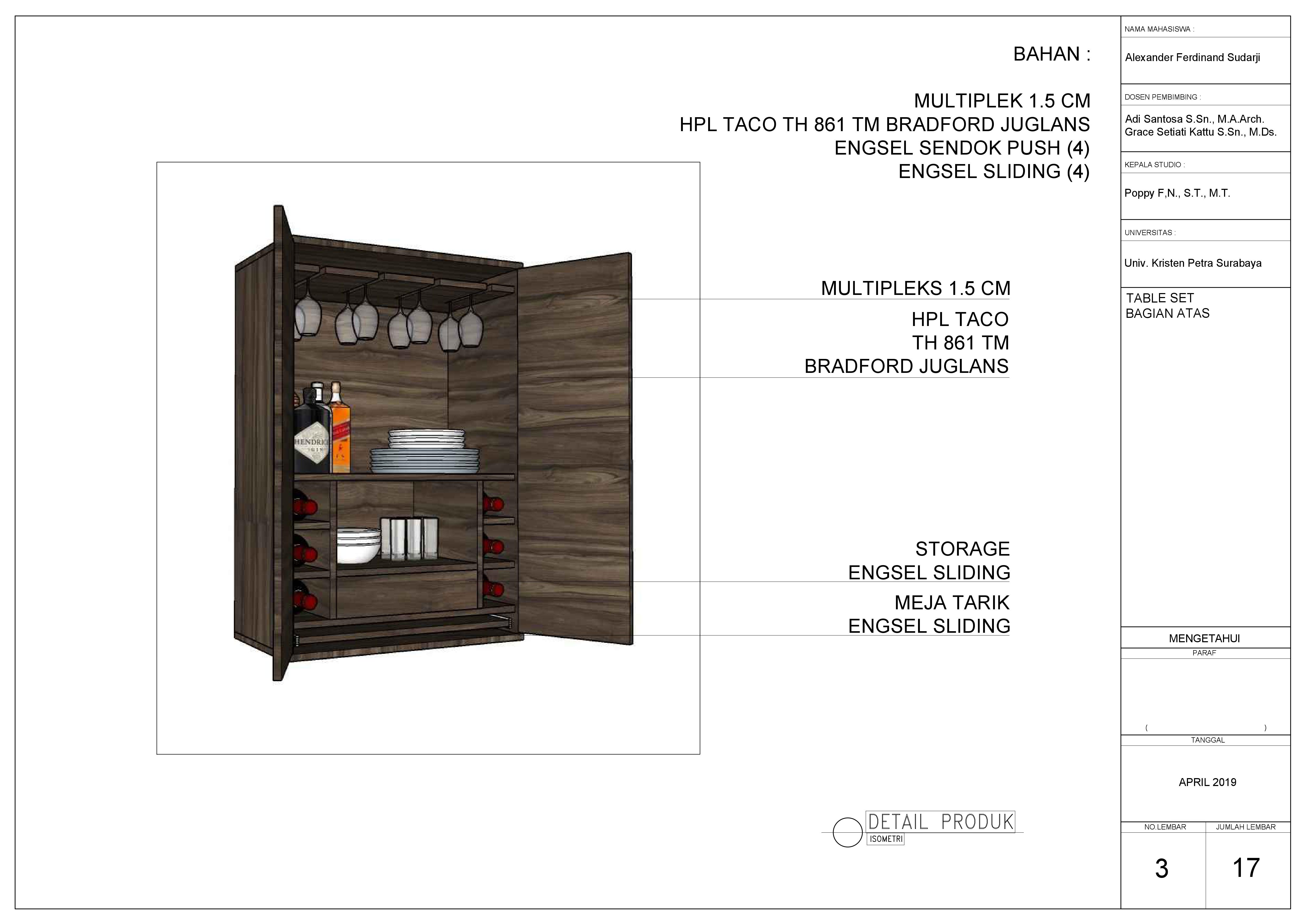 Library's collection Library's IT development CancelDalam perancangan ini, perancang ingin mencari alternatif desain dalam membuat table set dengan kontruksi yang berbeda. Salah satu alternatif kontruksi adalah kontruksi folding karena pertambahan penduduk yang begitu pesat membuat lahan untuk hunian menjadi sempit dan mahal sehingga membuat masyarakat golongan menengah ke bawah lebih memilih hunian yang kecil seperti apartemen. Melihat keadaan itu perancang ingin merancang sebuah furnitur yang menggunakan kontruksi folding yang dapat mengatasi tempat dengan ruang hunian yang terbatas, perancang mulai mencari informasi-informasi yang berkaitan dengan furnitur folding seperti kelebihan, kelemahan, cara mengolah dan sebagainya. Dengan informasi-informasi tersebut perancang mulai membuat konsep perancangan dan dari konsep tersebut terciptalah desain table set multifungsi dengan kontruksi folding yang dapat menjawab masalah perancangan yang ada.