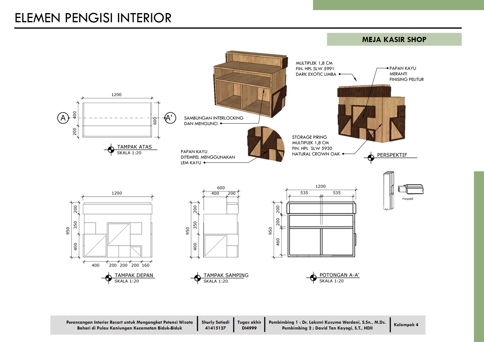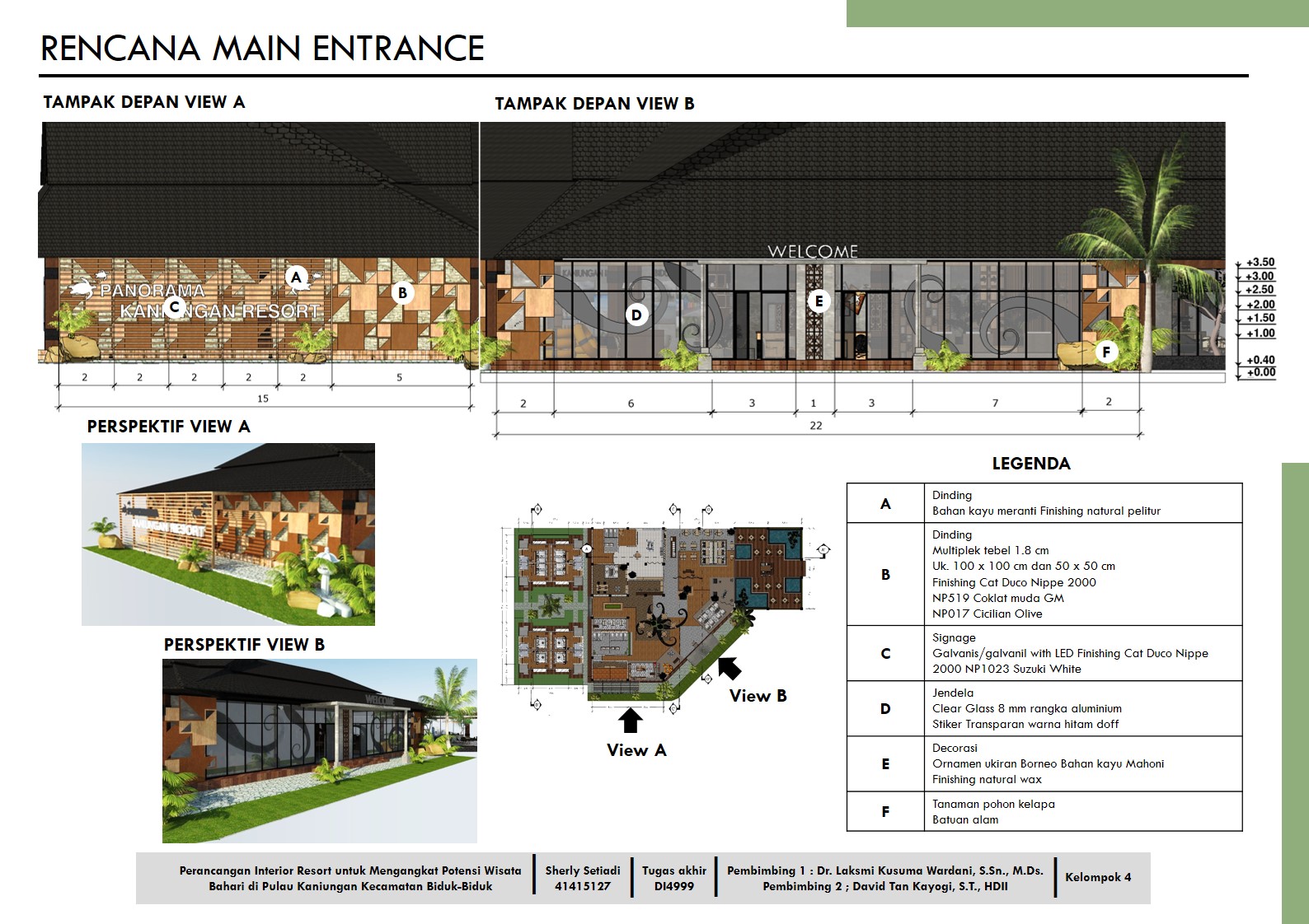 Library's collection Library's IT development CancelPulau Kaniungan adalah sebuah pulau yang terletak di ujung Pesisir Selatan Berau, Kecamatan Biduk-Biduk yang memiliki keindahan alam yang tidak kalah menariknya dengan pulau lain yang ada di Indonesia. Pulau ini masih baru keberadaannya sehingga belum banyak dikenal oleh para wisatawan dan kebutuhan penginapan yang masih sedikit. Melalui perancangan interior resort hotel ini menjadi wadah untuk mendukung berkembangnya dan mengangkat potensi wisata bahari di Kecamatan Biduk-Biduk khususnya di Pulau Kaniungan sehingga mampu memenuhi kebutuhan akomodasi penginapan dan menarik minat wisatawan untuk datang dan lebih mengenal wisata yang ada di Biduk-Biduk. Pada perancangan ini memiliki beberapa tahapan desain yaitu understand, observe, point of view, ideation, ideate, prototype, test, story telling, pilot dan business model yang disebut sebagai design thinking sehingga hasil perancangan yang diperoleh adalah penerapan konsep alam dengan ornamen bunga pakis khas Borneo dan ciri khas lingkungan alam yang ada di Pulau Kaniungan agar dapat menampilkan identitas atau karakter resort hotel sekaligus menjawab kebutuhan pengguna dan menarik minat wisatawan untuk berkunjung ke Pulau Kaniungan. Adapun hasil dari perancangan ini berupa layout, gambar kerja dan perspektif serta media promosi berupa x-banner, presentation board, brosur dan katalog.