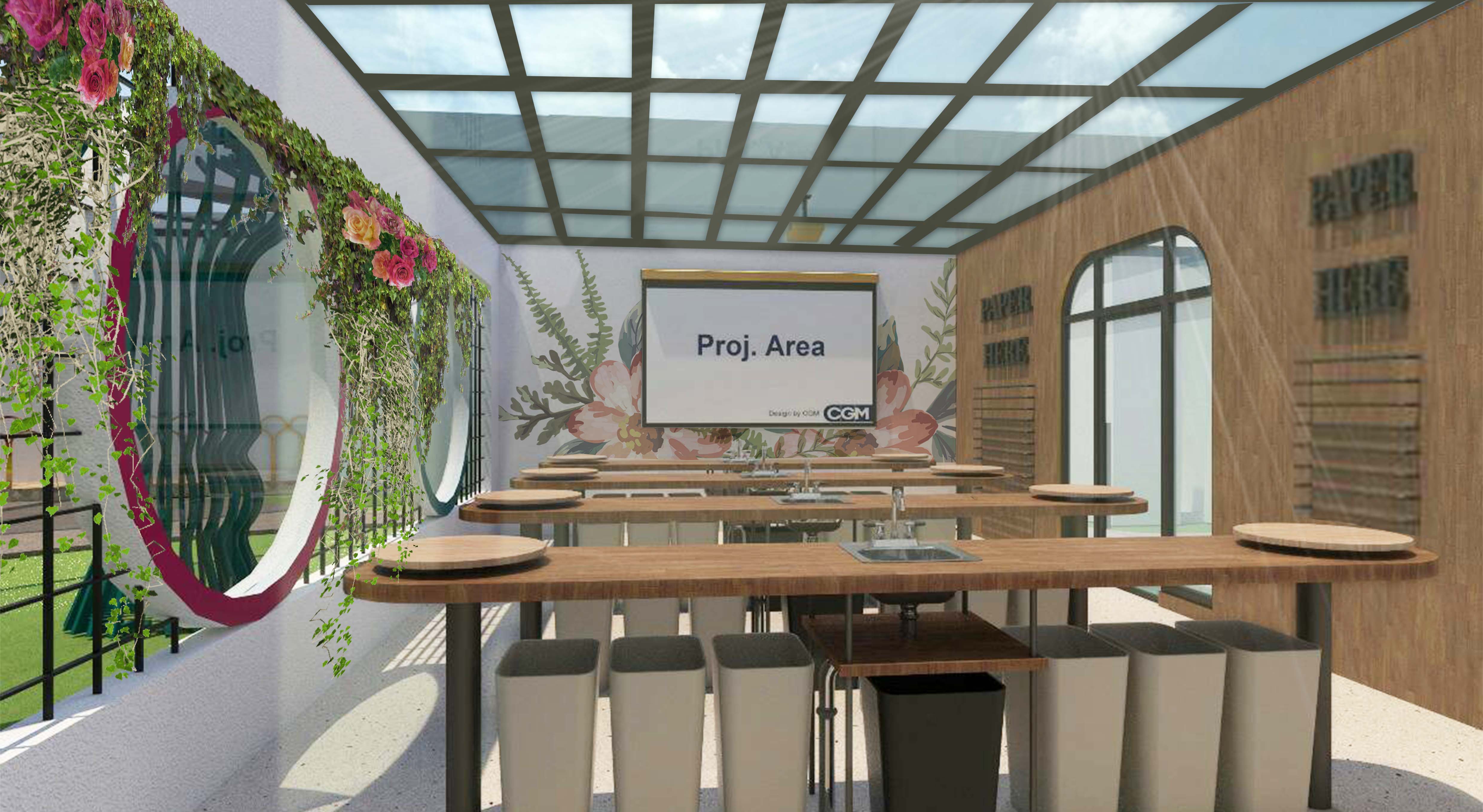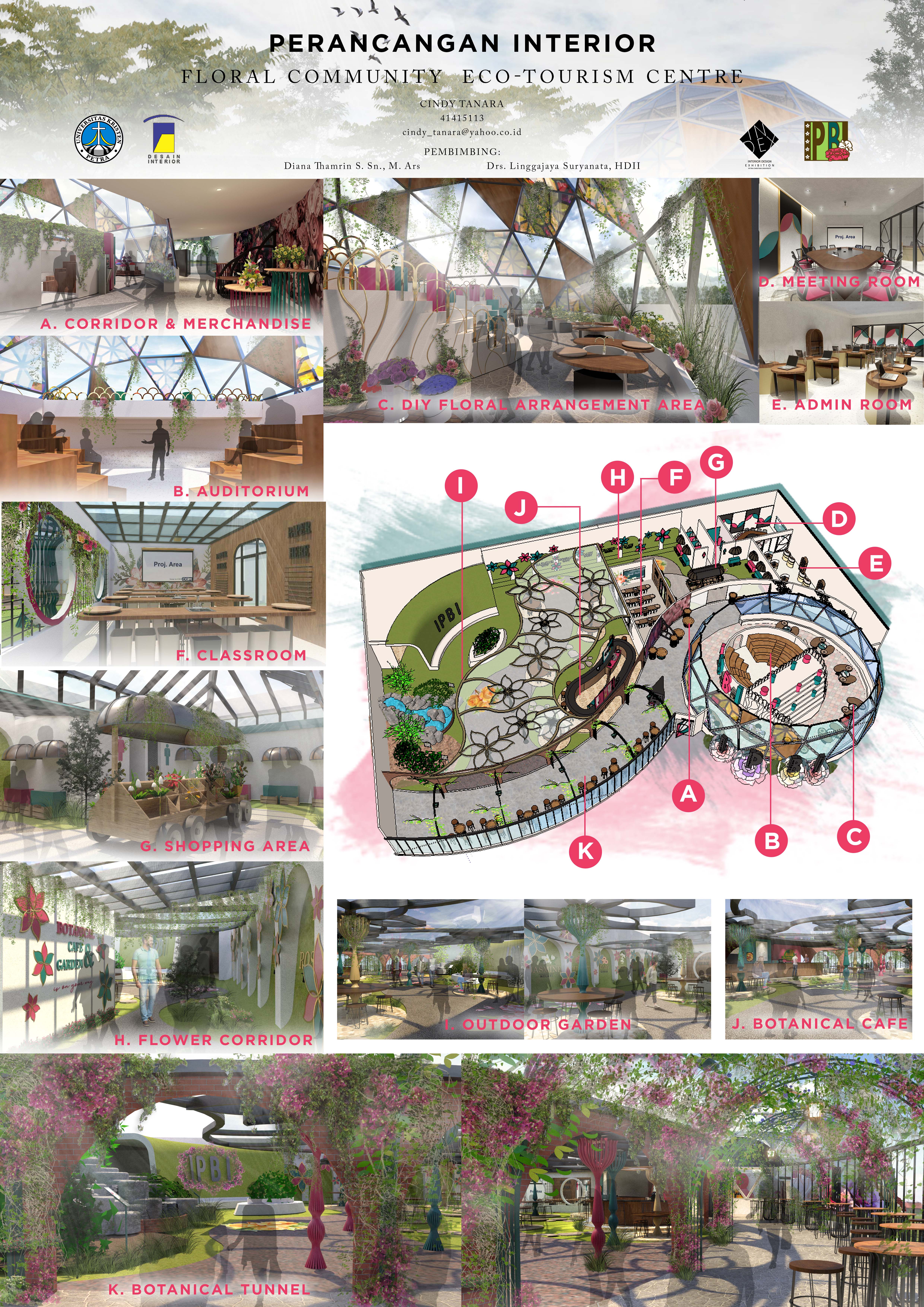 Library's collection Library's IT development CancelKomunitas IPBI (Ikatan Perangkai Bunga Indonesia) merupakan sebuah komunitas yang merangkul seluruh pecinta bunga di Indonesia, namun sayang nya komunitas tersebut belum memiliki wadah tetap untuk melaksanakan kegiatan komunitas. Tujuan perancangan ini adalah memberikan wadah yang memenuhi kebutuhan sosialisasi dan rekreasi bagi masyarakat pecinta bunga dan mengoptimalkan kegiatan antar anggota komunitas IPBI. Metode perancangan yang digunakan dalam perancangan ini melalui tahapan Understand, Observe, Point of View, Ideate, Prototype, dan Test. Hasil perancangan ini adalah sebuah Interior Floral Community and Eco Tourism Centre dengan konsep Regeneration. Elemen interior dan perabot dirancang untuk menstimulisasi para pecinta bunga terutama generasi milenial untuk bersosialisasi, berkoordinasi dan berekreasi bersama. Sasaran perancangan diharapkan membentuk pola kegiatan yang bermanfaat bagi para pecinta bunga di Surabaya.