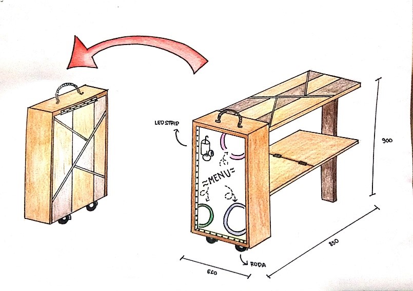 Library's collection Library's IT development CancelKegiatan market, bazar, ataupun sejenisnya merupakan salah satu cara yang efektif bagi para pengusaha untuk memperluas usaha mereka. Maka dari itu diperlukan produk yang menunjang aktivitas penjualan yang efektif juga. Berdasarkan survei, mengikuti kegiatan pameran ataupun bazaar menjadi tantangan yang harus dihadapi karena waktu dan ukuran area yang disediakan terbatas sesuai dengan ketentuan penyelengara. Oleh Karena itu, dibutuhkan desain untuk memecahkan masalah melalui lima metode perancangan milik Kembel yang terdiri dari empathize (langkah mencari permasalahan), define (proses perumusan masalah), ideate (langkah perancangan untuk menjawab permasalahan), define (proses perumusan masalah), prototype (proses perwujudan hasil perancangan), dan test (menilai hasil rancangan dalam menjawab permasalahan). Solusi desain tersebut adalah menciptakan perabot yang praktis dalam bentuk flatpack untuk mempermudah pelaku usaha dalam beraktivitas dan mengeluarkan biaya yang tidak banyak.
