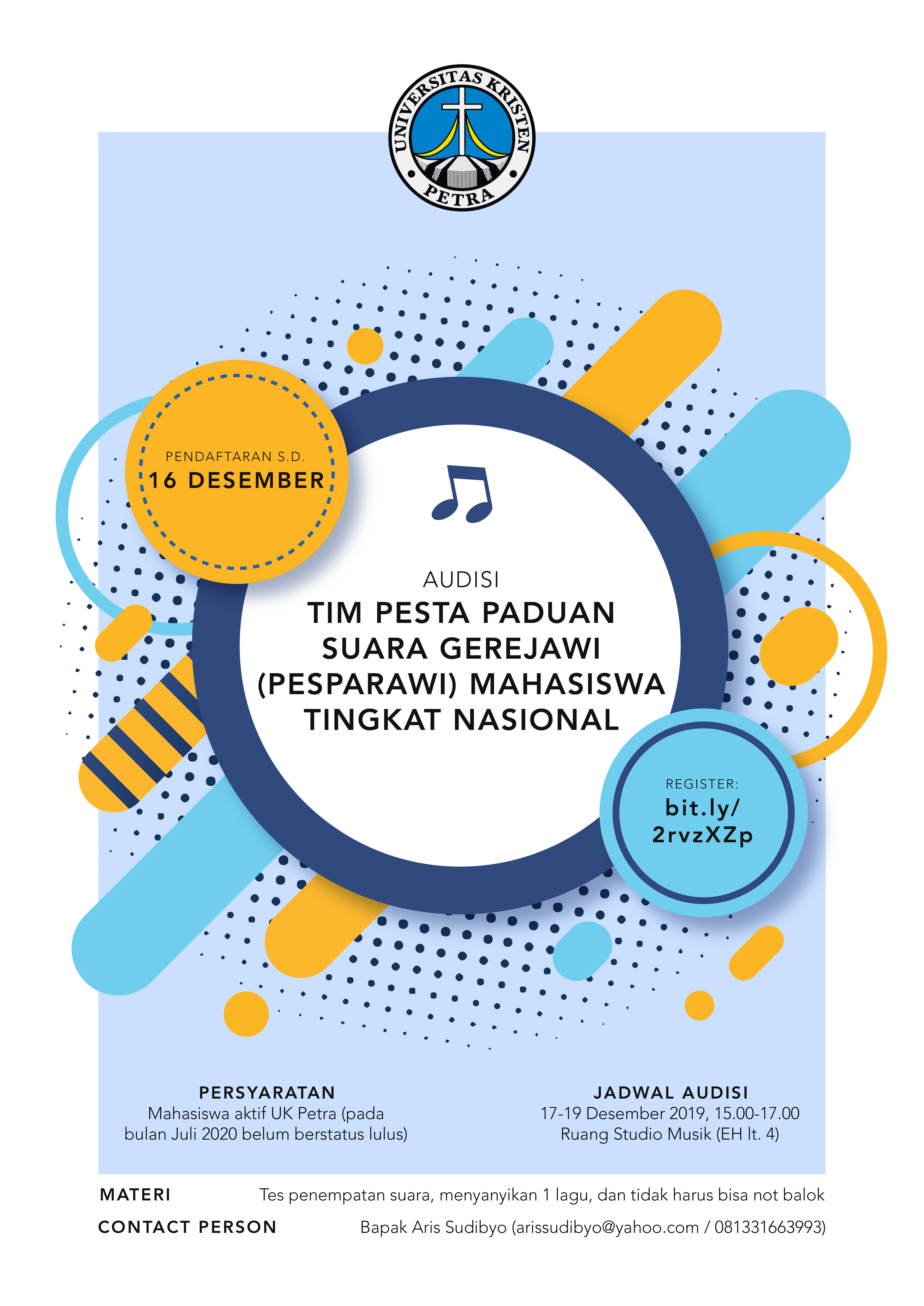Library's collection Library's IT development CancelUK Petra membuka kesempatan kepada mahasiswa UK Petra, untuk bergabung dalam tim paduan suara UK Petra. Tim ini dipersiapkan untuk kegiatan Pesparawi 2020 tingkat Nasional. Pendaftaran untuk audisi dibuka pada tanggal 16 Desember 2019.