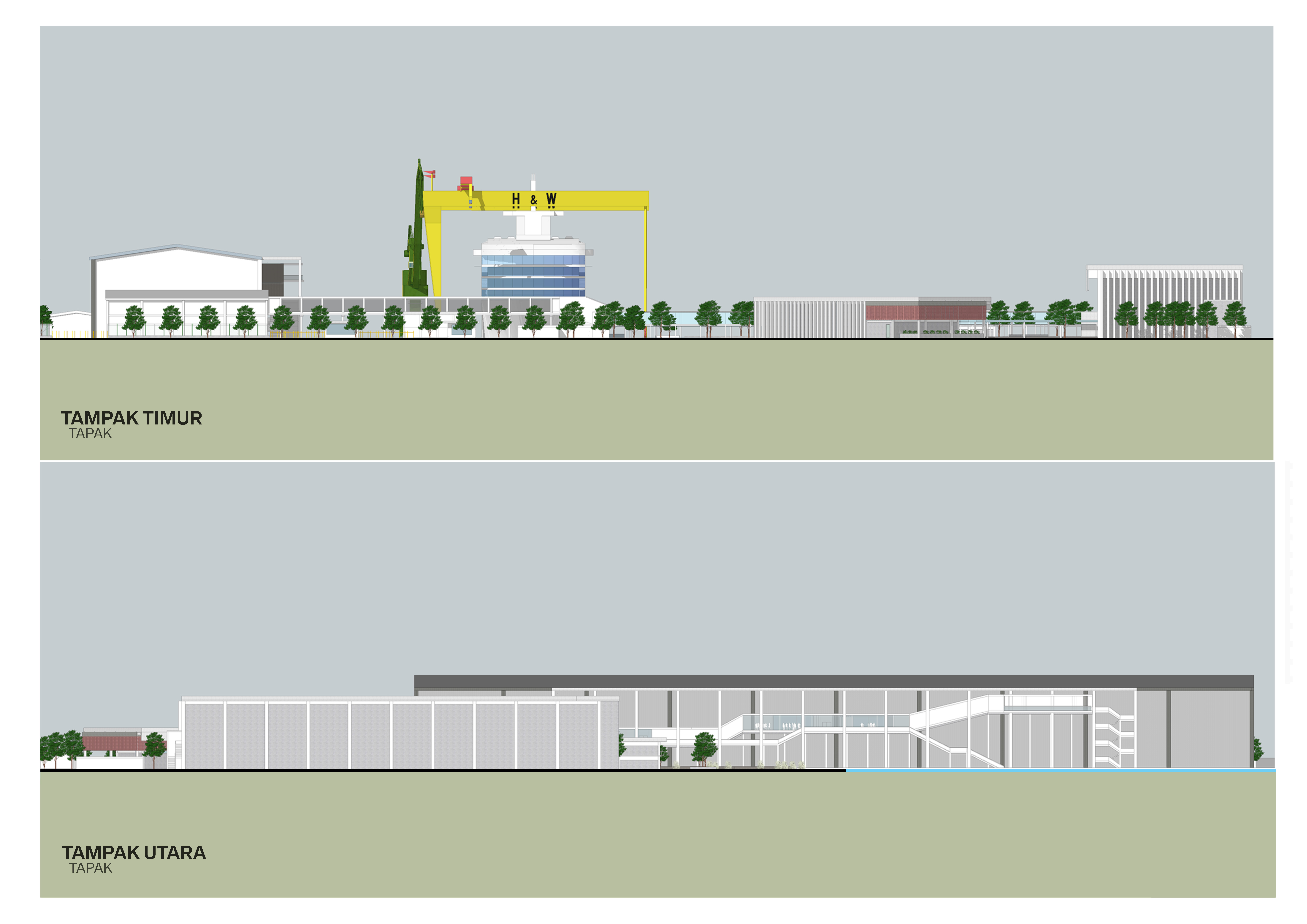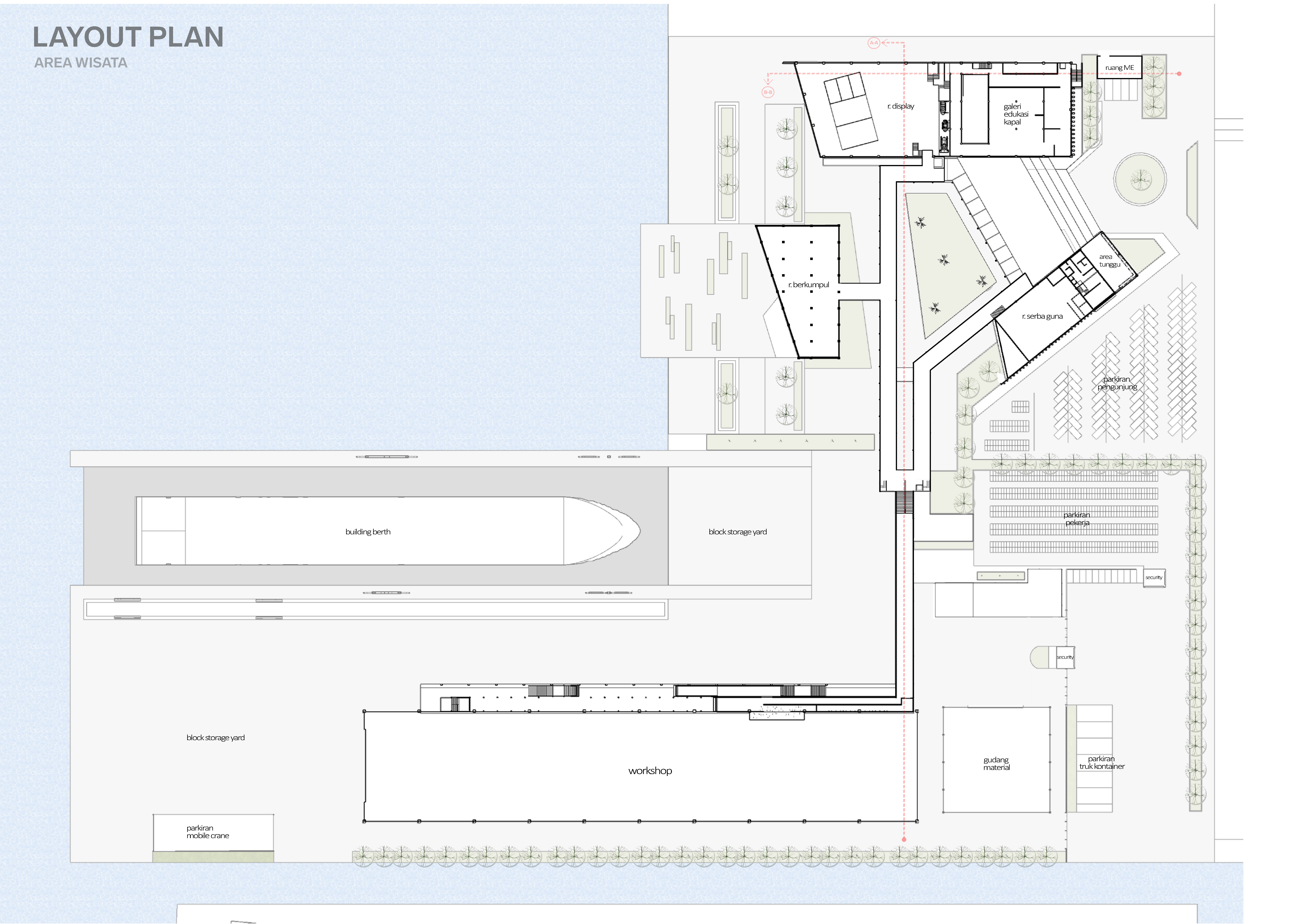 Library's collection Library's IT development CancelFasilitas Wisata dan Edukasi Pembuatan Kapal Pesiar di Batam merupakan fasilitas wisata industri yang bertujuan untuk mengembangkan sektor pariwisata di Batam. Fasilitas ini terbagi menjadi 2 area yaitu area wisata dan area industri, dimana area wisata terdapat fasilitas seperti galeri kapal pesiar, restoran dan souvenir, sedangkan di area industri terdapat fasilitas jembatan eduwisata bengkel sebagai konektivitas antara area wisata dengan area industrinya. Masalah desain dari perancangan ini adalah membedakan sirkulasi dan aktivitas antara pengunjung dan pekerja galangan dalam memperhatikan kenyamanan dan keamanan kedua pengguna. Konsep perancangannya adalah merancang sebuah fasilitas industri yang bersifat inklusif, dimana pengunjung bisa bersirkulasi dan melihat proses kerja tanpa mengganggu kelancaran pekerjaan galangan. Pendekatan yang digunakan dalam perancangan proyek ini adalah pendekatan sistem yang secara khusus mempertimbangkan pemisahan sistem sirkulasi dan aktivitas pengunjung wisata dengan pekerja galangan.