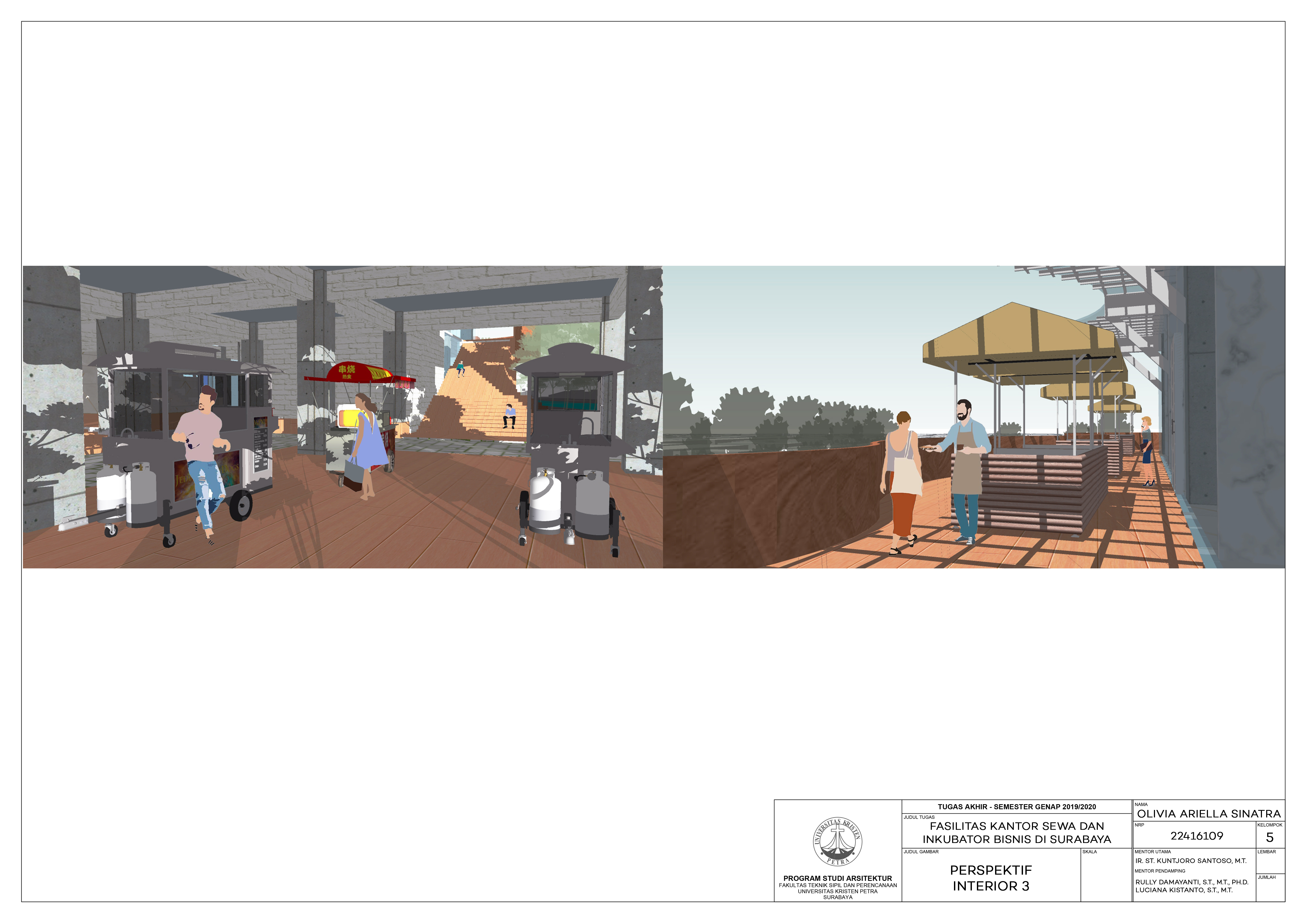 Library's collection Library's IT development CancelFasilitas Kantor Sewa dan Inkubator Bisnis di Surabaya ini merupakan fasilitas yang dibuat untuk memfasilitasi calon pengusaha start-up di Surabaya agar mendapat bimbingan yang sesuai kebutuhan sehingga, siap untuk terjun di dunia bisnis sesungguhnya. Fasilitas ini bertujuan untuk menampung pengusaha yang sukses pada bidang bisnis untuk menyalurkan kewajiban Corporate Social Responsibility (CSR) dengan cara memberikan bimbingan untuk usaha rintisan lainnya. Fasilitas ini mewadahi dari proses bimbingan, produksi, maupun penjualan produk pada fasilitas retail yang disediakan. Fasilitas ini tidak hanya mendukung ekonomi penggunanya, namun dapat mendukung perekonomian sekitarnya dengan cara menyediakan ruang pusat perbelanjaan untuk pedagang sekitar site agar dapat berjualan dengan nyaman sehingga menjadi jembatan yang menghubungkan interaksi calon pelaku usaha dengan masyarakat di Surabaya.