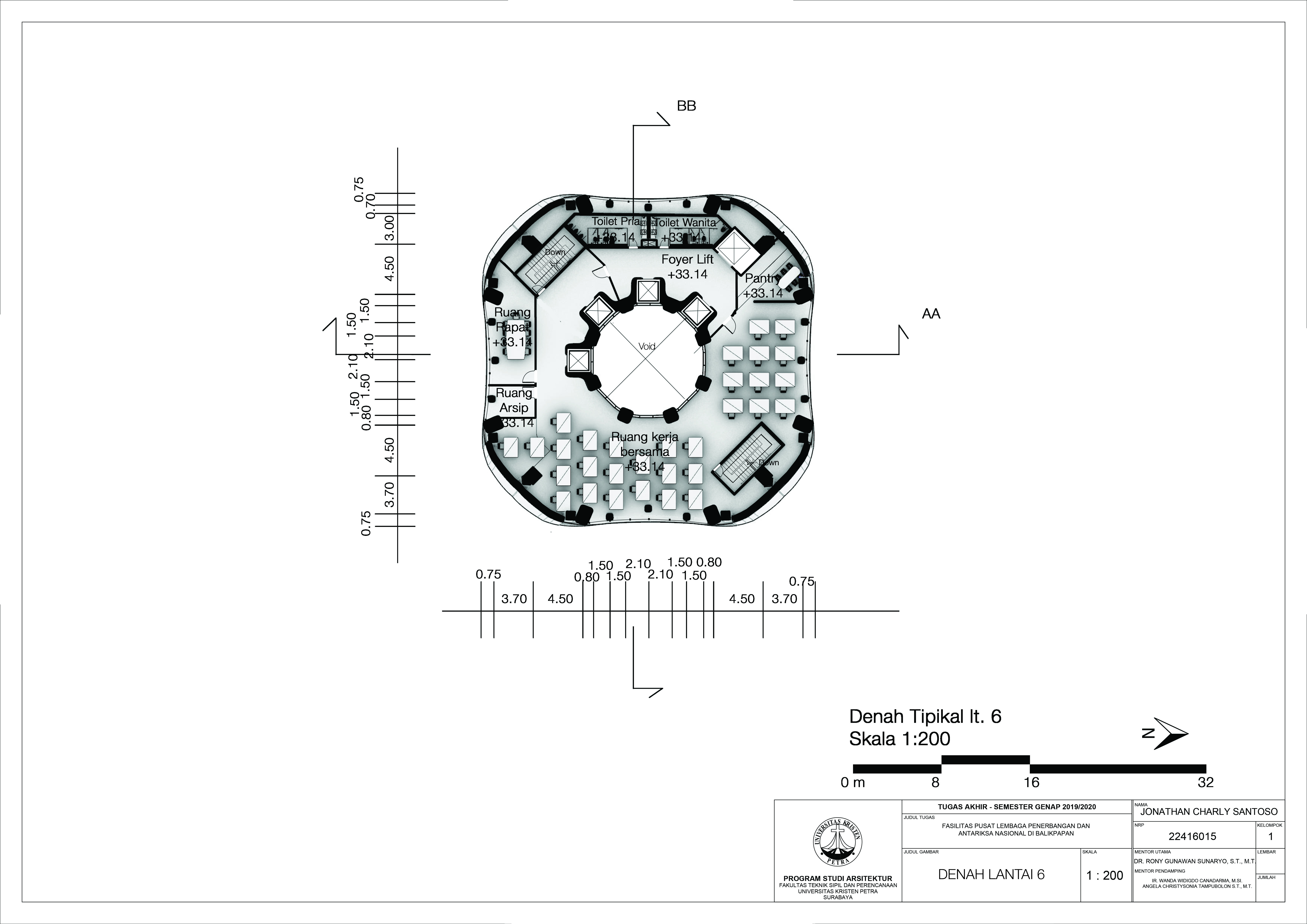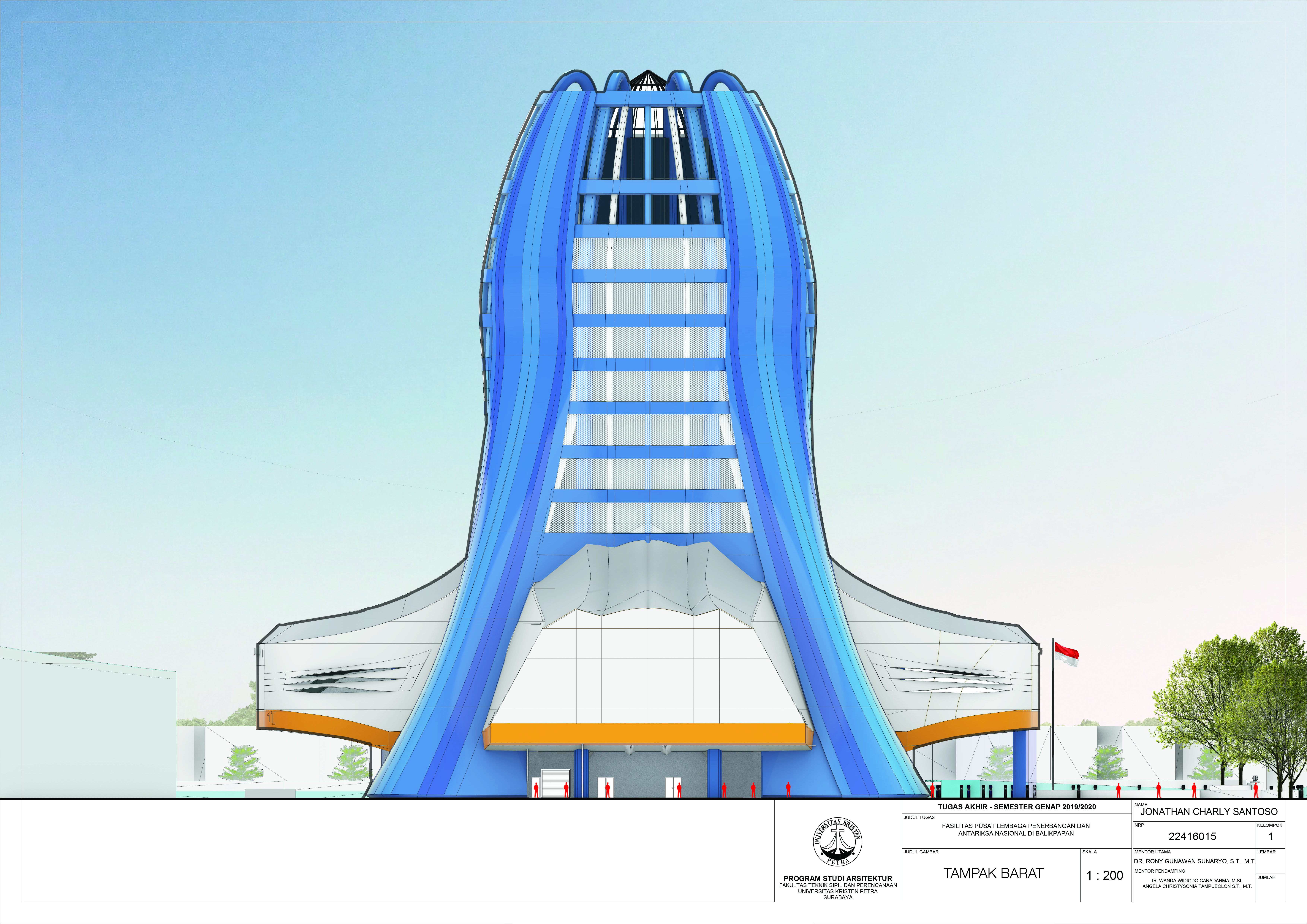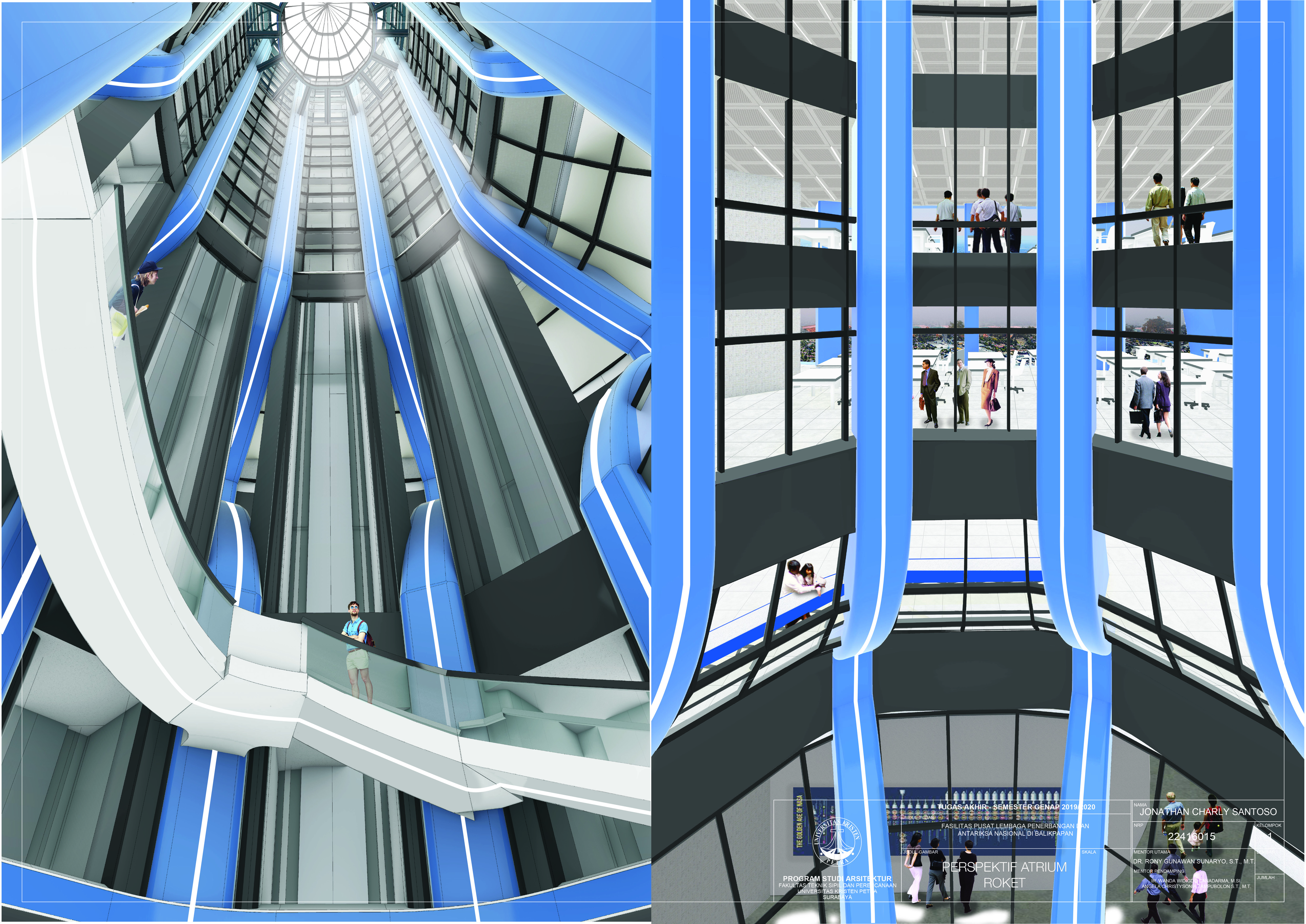 Library's collection Library's IT development CancelFasilitas Pusat Lembaga Penerbangan dan Antariksa Nasional adalah fasilitas bagi LAPAN dalam mewujudkan visi bidang antariksa yang digagas presiden. Potensi integrasi yang mampu dilakukan, adalah integrasi antara tipologi kantor yang privat dan fungsi publik. LAPAN yang merupakan lembaga yang kurang dikenal publik, diharapkan melalui bangunan ini dapat menjadi awal pengenalan terhadap publik. Permasalahan perwujudan visi Indonesia dan persepsi sosial terhadap LAPAN, dipercaya dapat dipecahkan dengan pendekatan simbolik. Tiga parameter dalam simbolisme yaitu Sebagai pembuktian negara dalam ilmu pengetahuan, Mewujudkan visi dalam bidang antariksa, dan pembahasaan yang mudah dipahami oleh publik. Dari parameter tersebut simbolisme roket dipilih. Dengan metode membedah anatomi roket, ditemukan tiga bagian utama yaitu: kepala sebagai tempat astronot, badan sebagai tempat mesin yang bekerja, dan output sebagai hasil kerja roket. Siluet roket meluncur sebagai pembahasaan tangible bentuk bangunan yang sesuai dengan anatomi roket. Warna biru sebagai warna lembaga menjadi warna utama pada fasad dan struktur utama bangunan. Pembahasaan roket secara literal dibahasakan dalam void atrium yang berbentuk roket dengan skala yang masif. Void atrium juga berfungsi sebagai penyalur cahaya dari skylight ke fungsi di sekitarnya di tiap lantai. Sistem struktur yang terinspirasi dari roket diterapkan pada bagian badan dan kepala dengan menggunakan sistem struktur tube. Sedangkan area podium menggunakan rangka kolom balok mengakomodasi kantilever. Pendalaman karakter ruang difokuskan pada fungsi publik dengan tema yang berbeda. Area edukasi publik dengan karakter yang berbeda diharapkan dapat memberikan pengalaman bidang antariksa secara bervariatif.