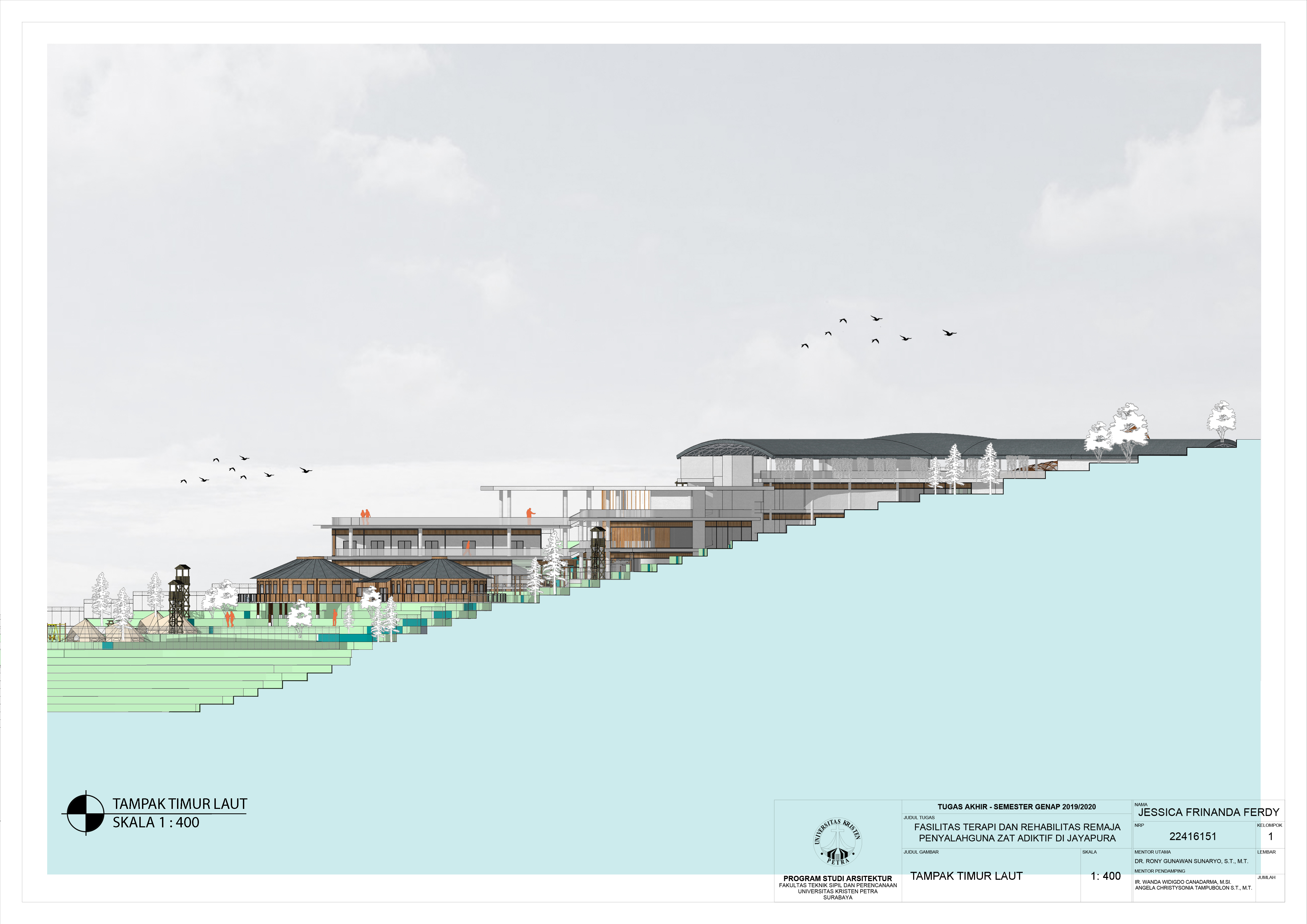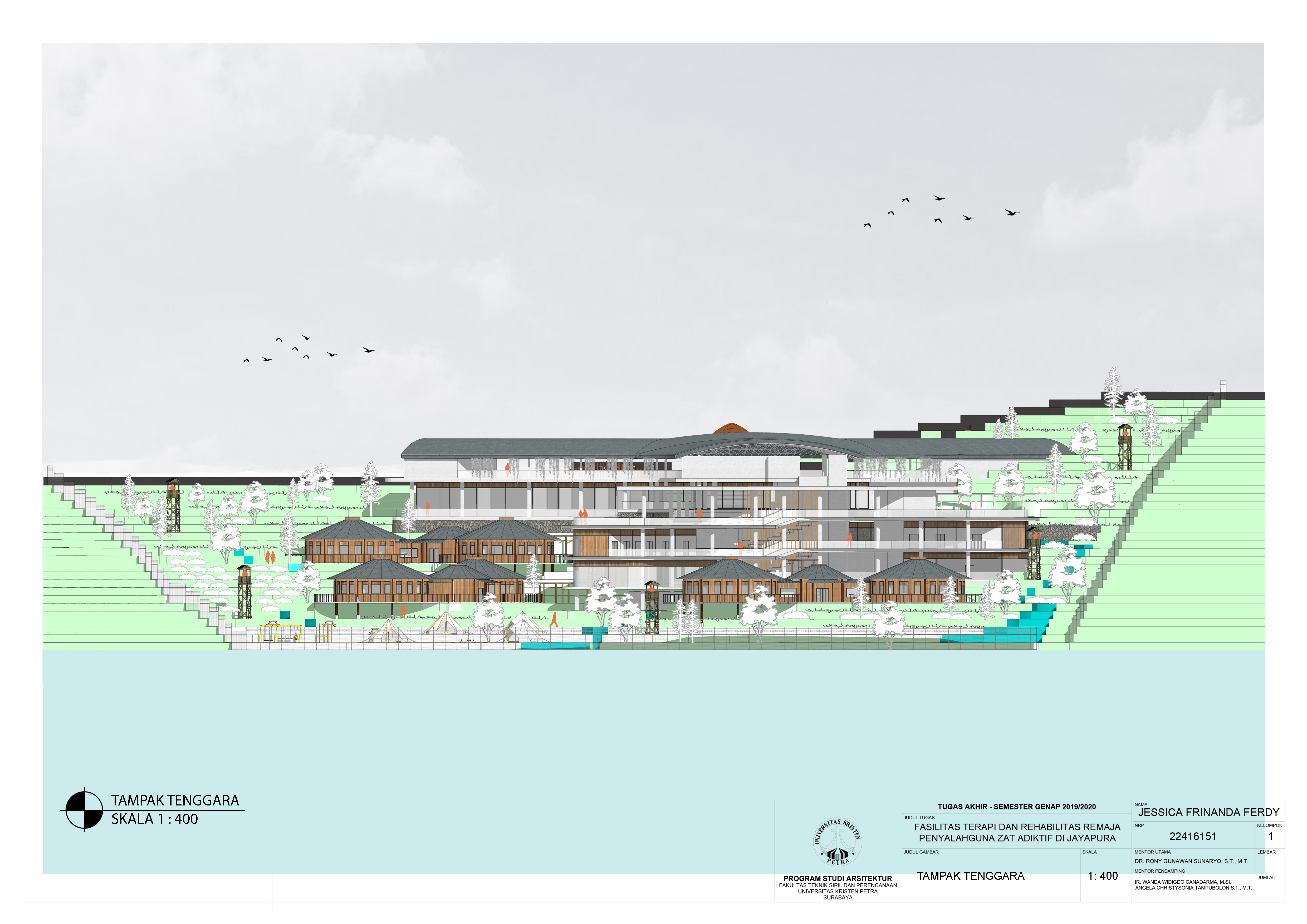 Library's collection Library's IT development CancelFasilitas ini dirancang dengan tujuan utama yaitu sebagai wadah penyembuhan bagi remaja penyalahguna zat adiktif di wilayah Papua dengan memanfaatkan konteks alam natural yang ada di Papua. Penyalahguna zat adiktif cenderung memiliki kondisi kesehatan mental yang rendah dibandingkan manusia pada umumnya, sehingga hal ini ditanggapi dengan mendesain menggunakan pendekatan perilaku dengan konsep fasilitas rehabilitasi melalui penyembuhan alam natural dengan pendalaman karakter ruang. Pembagian zoning pada massa utama di lakukan secara vertikal berdasarkan jenis aktivitasnya. Kemudian pada area ruang luar dan massa residen pembagian zoning dilakukan secara horizontal dengan memisahkan zona berdasarkan kondisi psikologis ekstrim dan psikologis non ekstrim. Area ruang luar didesain dengan pengolahan lanskap yang beragam sesuai dengan brbagai stimulasi yang ditimbulkan pada tiap zona. Tiap ruangan pada fasilitas ini dirancang untuk memanfaatkan alam semaksimal mungkin dalam hal pencahayaan, penghawaan serta visual dengan mengedepankan alam natural sebagai bagian dari penyembuhan. Oleh karena itu, Fasilitas Terapi dan rehabilitas remaja penyalahguna zat adiktif ini merupakan bangunan yang aman dan menyenangkan sekaligus menenangkan bagi para remaja dalam menjalankan proses penyembuhan mereka dan memulihkan kondisi mental yang menurun.