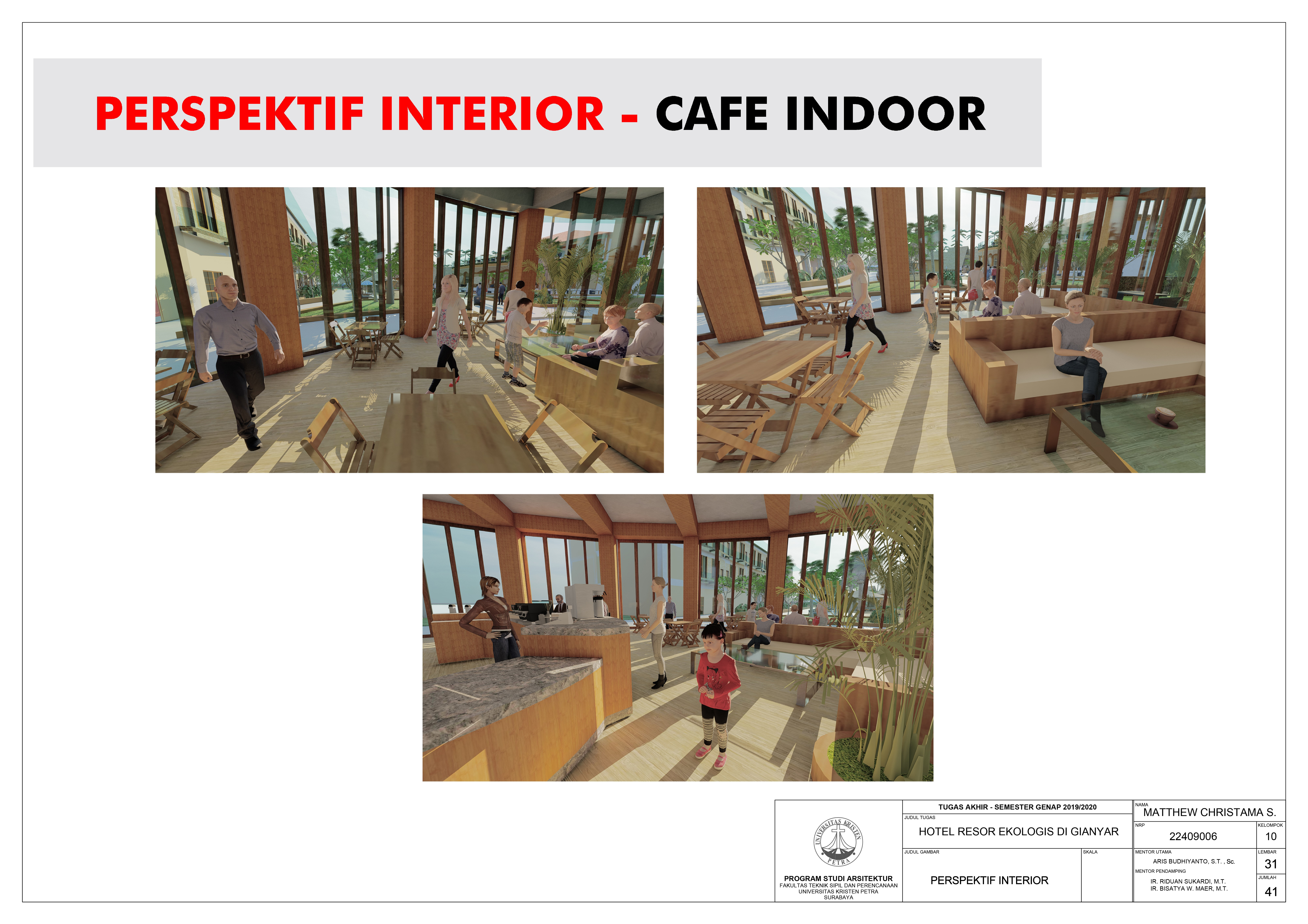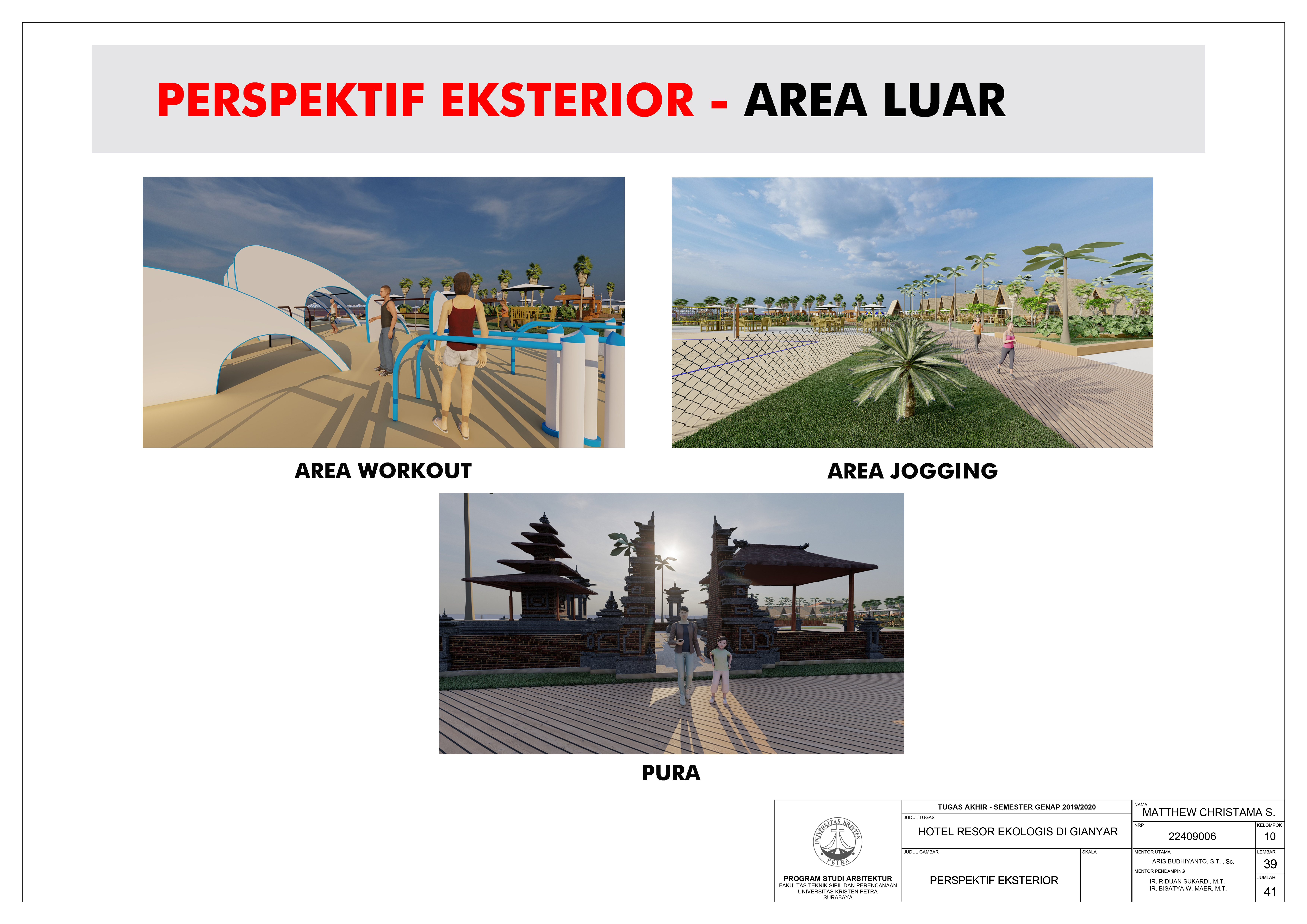Library's collection Library's IT development CancelTulisan ini merupakan bagian proyek Tugas Akhir Karya Desain di Jurusan Arsitektur Universitas Kristen Petra. Hotel Resor Ekologis di Gianyar merupakan fasilitas rekreasi yang bertujuan meningkatkan minat para wisatawan dalam maupun luar negeri untuk berkunjung ke kota Bali dan memajukan kepariwisataan di kota Bali dengan menerapkan konsep desain prinsip bangunan ekologis menurut Heinz Frick. Desain fasilitas rekreasi dilakukan dengan mengangkat permasalahan desain tentang merancang resor yang ramah terhadap aktifitas manusia secara aman, nyaman, dan mempertimbangkan dampak terhadap lingkungan sekitar atau berkelanjutan. Resor ini dilengkapi dengan berbagai fasilitas seperti fasilitas parkir, fasilitas pengelola, fasilitas penerima, fasilitas olahraga, fasilitas kamar, fasilitas komersial, dan fasilitas servis. Suasana dalam ruang menampilkan kesan alami dengan menggunakan material alami dan penghawaan alami sehingga menghasilkan ruang yang nyaman untuk aktifitas manusia.
