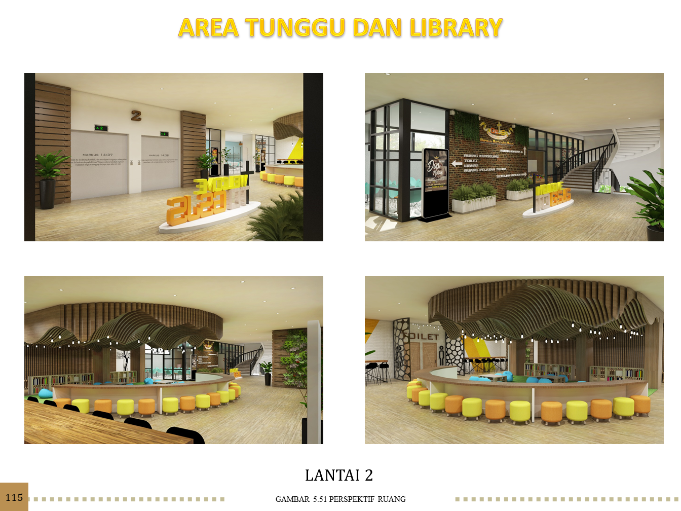 Library's collection Library's IT development CancelManusia memiliki kebutuhan yang harus dipenuhi, salah satunya kebutuhan rohani. Kebutuhan rohani dapat dipenuhi dengan cara menjalin hubungan dengan Tuhan, dan pergi ke gereja. Gereja adalah bangunan atau tempat ibadah untuk menyembah Tuhan, khususnya untuk masyarakat yang beragama kristen, katholik. Gereja merupakan tempat dimana para jemaat bisa mendekatkan diri ke Tuhan (hubungan intim). Oleh karena itu dibutuhkan gereja yang dapat membuat jemaatnya merasakan kehadiran Tuhan datang. Perancangan ini bertujuan untuk menciptakan ruang ibadah yang nyaman dan para jemaat dapat merasakan hadirat Tuhan didalam Gereja Satu Jam Saja (GSJS). Menggunakan 7 metode Design Thinking yaitu understand, observe, point of view (POV), ideate, prototype, test, dan business modal. Hasil dari perancangan ini berupa ruang ibadah yang nyaman dan dapat memenuhi kebutuhan rohani jemaat. Selain ruang ibadah terdapat juga fasilitas lainnya seperti, ruang berdoa, kelas untuk sekolah minggu, dan terdapat banyak wadah untuk jemaat menjalankan aktivitas gereja.