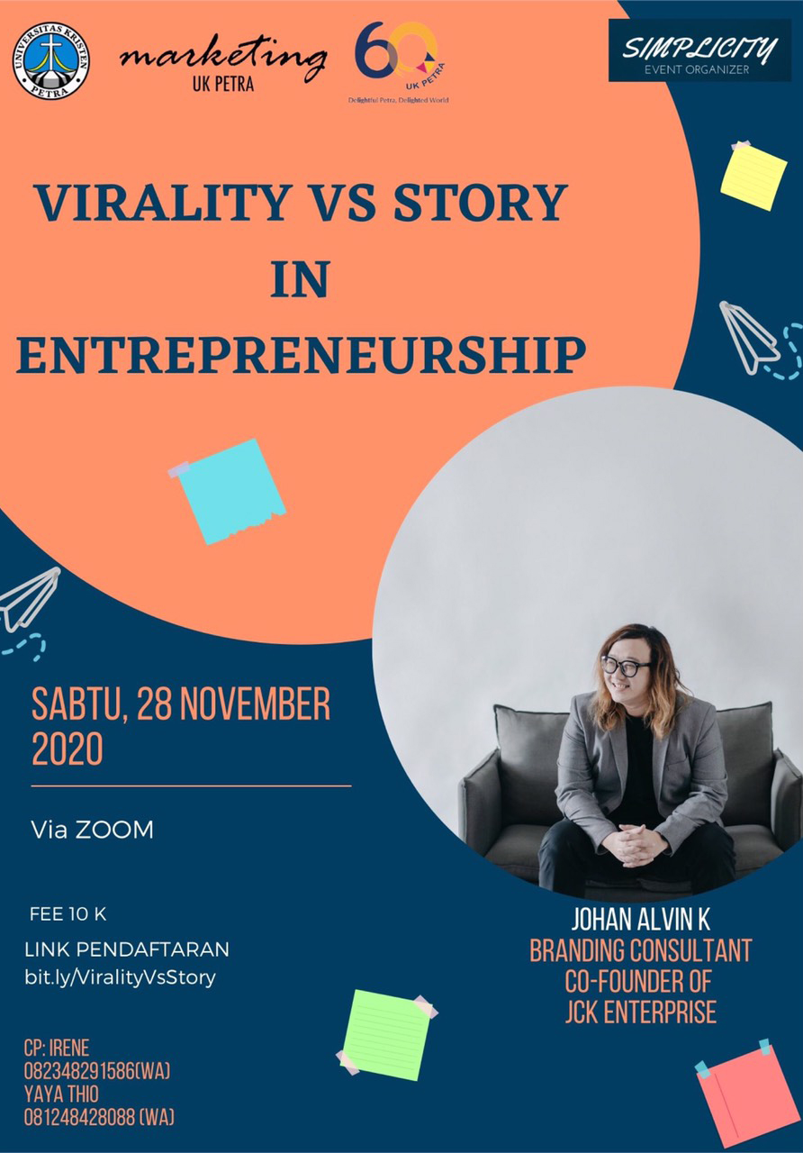 Library's collection Library's IT development CancelProgram Manajemen Pemasaran UK Petra Surabaya, mengadakan webinar dengan topik "Virality vs story in entrepreneurship". Acara ini menggunakan aplikasi Zoom, dengan narasumber Johan Alvin K. Dan diadakan pada tanggal 28 November 2020. Dengan biaya pendaftaran Rp.10.000,-