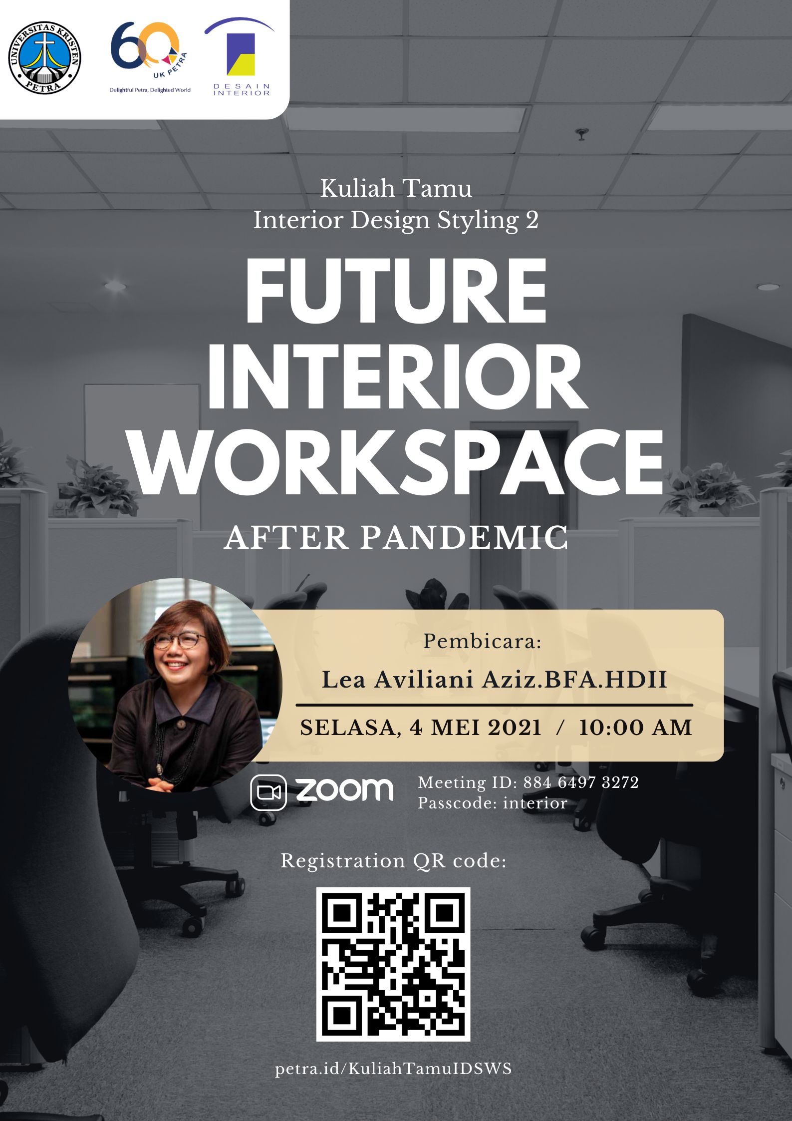 Library's collection Library's IT development CancelProgram Studi Desain Interior Universitas Kristen Petra Surabaya pada tanggal 4 Mei 2021 mengadakan kuliah tamu dengan topik: " future interior workspace after pandemic" dengan narasumber Lea Aziz. Acara ini diselenggarakan secara online dengan menggunakan aplikasi Zoom.