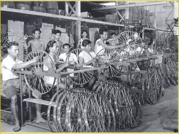 Para pekerja sedang membalance roda - roda di Pabrik sepeda Hima di Surabaya pada tahun 1930-1940