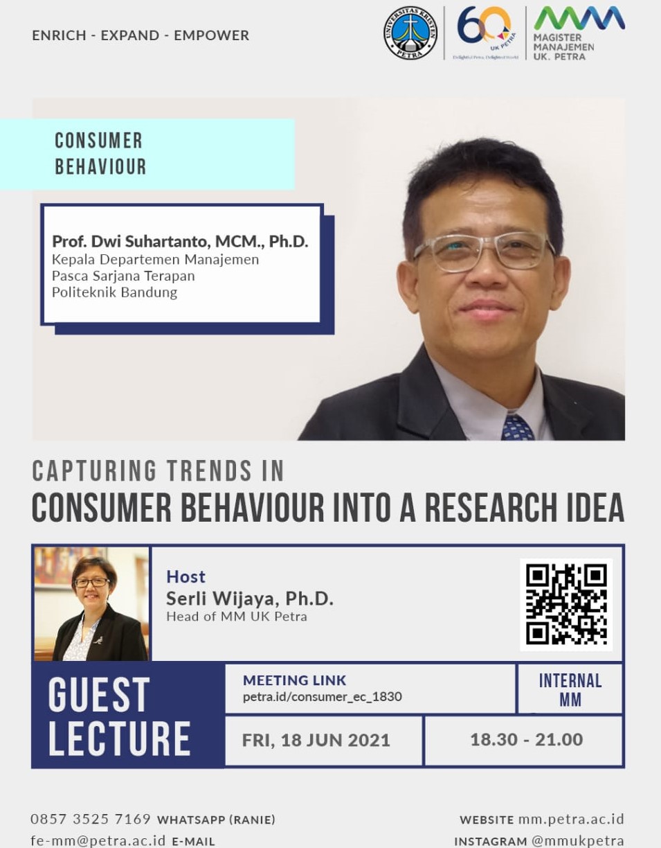Library's collection Library's IT development CancelPada Jumat, 18 Juni 2021 Program Studi Magister Manajemen UK Petra Mengadakan kuliah tamu dengan topik: capturing trends in consumer behaviour into a research idea. Dengan narasumber Prof. Dwi Suhartanto, MCM.,Ph.D., dan sebagai host Serli Wijaya Ph.D., Acara ini berlangsung secara online.