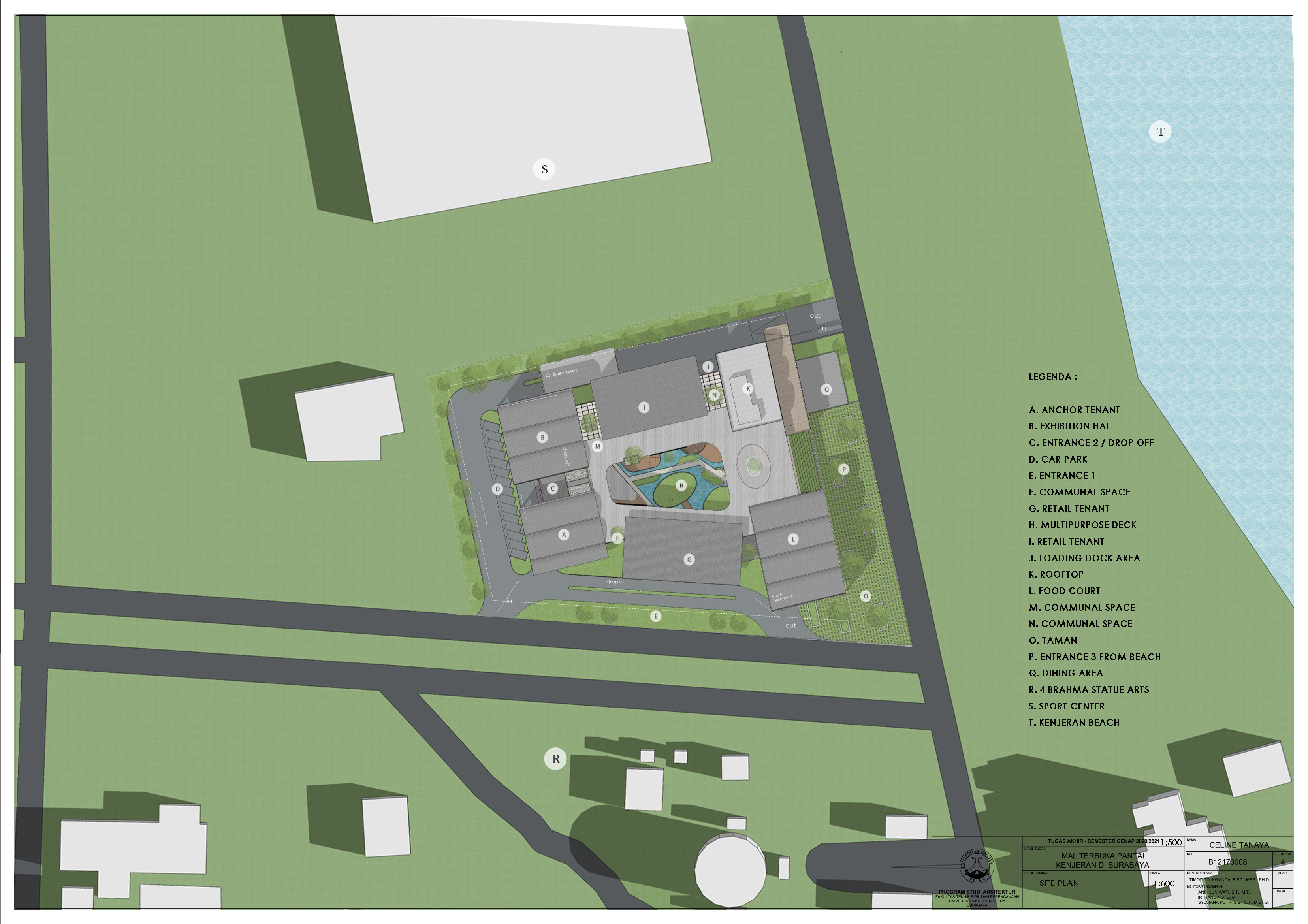 Library's collection Library's IT development CancelPerancangan Mal Terbuka Pantai Kenjeran di Surabaya dilatarbelakangi oleh desain mal di Surabaya mirip dan didominasi dengan konsep tertutup, padahal pengunjung selalu mencari pengalaman baru dalam mal. Di samping itu, Pantai Kenjeran sebagai kawasan strategis masih belum diolah dan berkembang secara optimal. Oleh karena itu, tujuan perancangan Mal Terbuka Pantai Kenjeran di Surabaya dimaksudkan untuk melengkapi kebutuhan fasilitas perbelanjaan di area agar menjadi kawasan wisata yang terintegrasi, sekaligus menata sistem sirkulasi agar efektif dan terintegrasi. Masalah utama dalam perancangan ini adalah sistem, meliputi sistem sirkulasi yang efektif, sehingga pendekatan yang digunakan adalah pendekatan sistem, khususnya sirkulasi. Pendalaman karakter ruang diolah untuk menonjolkan karakter kawasan pantai yang menenangkan dan santai, serta navigasi ruang yang efektif melalui elemen arsitekturalnya dengan aplikasi teori wayfinding. Konsep yang dihadirkan adalah memperkuat karakter pantai yang santai dengan memasukkan elemen alam dan sirkulasi terbuka.