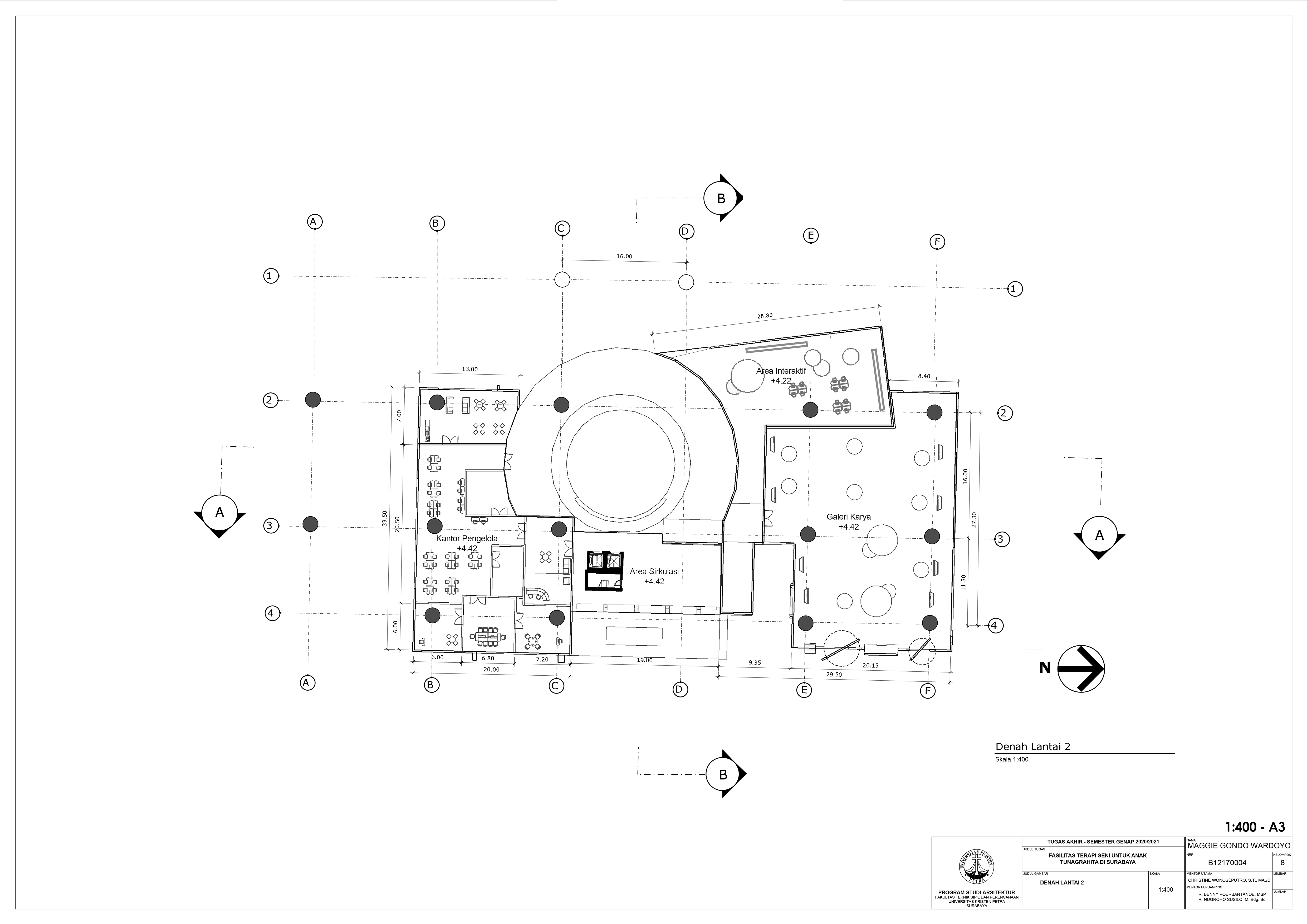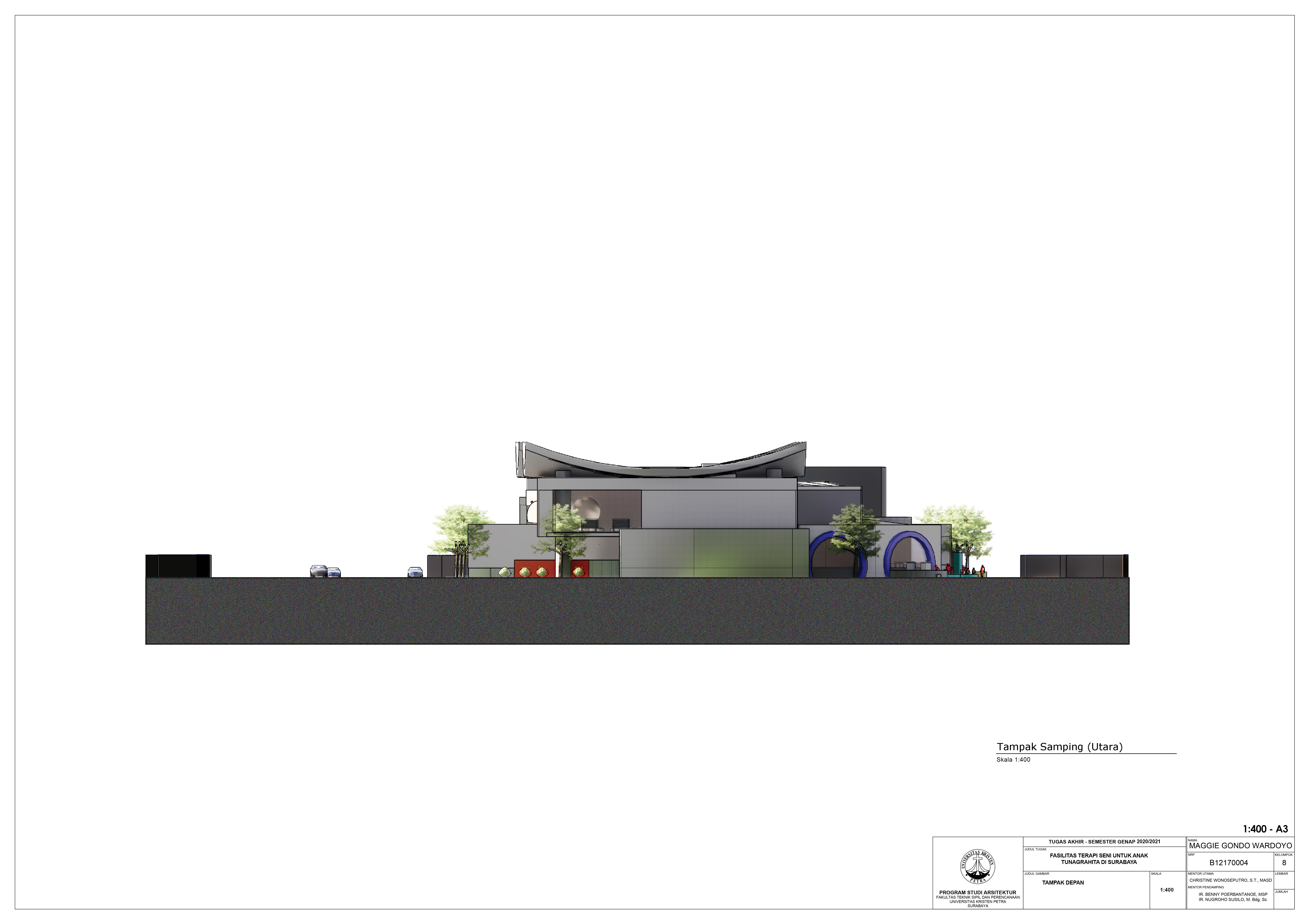Library's collection Library's IT development CancelTulisan ini merupakan bagian dari proyek Tugas Akhir Karya Desain di Program Studi Arsitektur Universitas Kristen Petra. Fasilitas Terapi Seni utnuk Anak Tunagrahita di Surabaya yang dirancang dengan pendekatan studi perilaku anak tunagrahita ini merupakan sebuah fasilitas umum yang bertujuan untuk memfasilitasi terapi seni untuk anak-anak tunagrahita di Surabaya. Desain fasilitas ini berdasarkan rumusan masalah bagaimana merancang sebuah fasilitas yang dapat memberikan nilai terapis dalam seni pada anak-anak tunagrahita di Surabaya. Fasilitas ini memiliki fungsi utama sebagai tempat terapi dalam bidang seni pada anak tunagrahita, dilengkapi dengan galeri karya anak, area interaktif maupun tempat bermain untuk memicu sensorik anak tunagrahita dan sebagainya. Konsep dasar dari perancangan ini adalah space for healing, dengan kata lain desain dan tata ruang dalam fasilitas disesuaikan dengan kebutuhan stimulasi anak tunagrahita. Adapun pendalaman yang digunakan adalah karakter ruang untuk menghasilkan kebutuhan stimulasi untuk setiap kategori anak tunagrahita berdasarkan DSM-5.