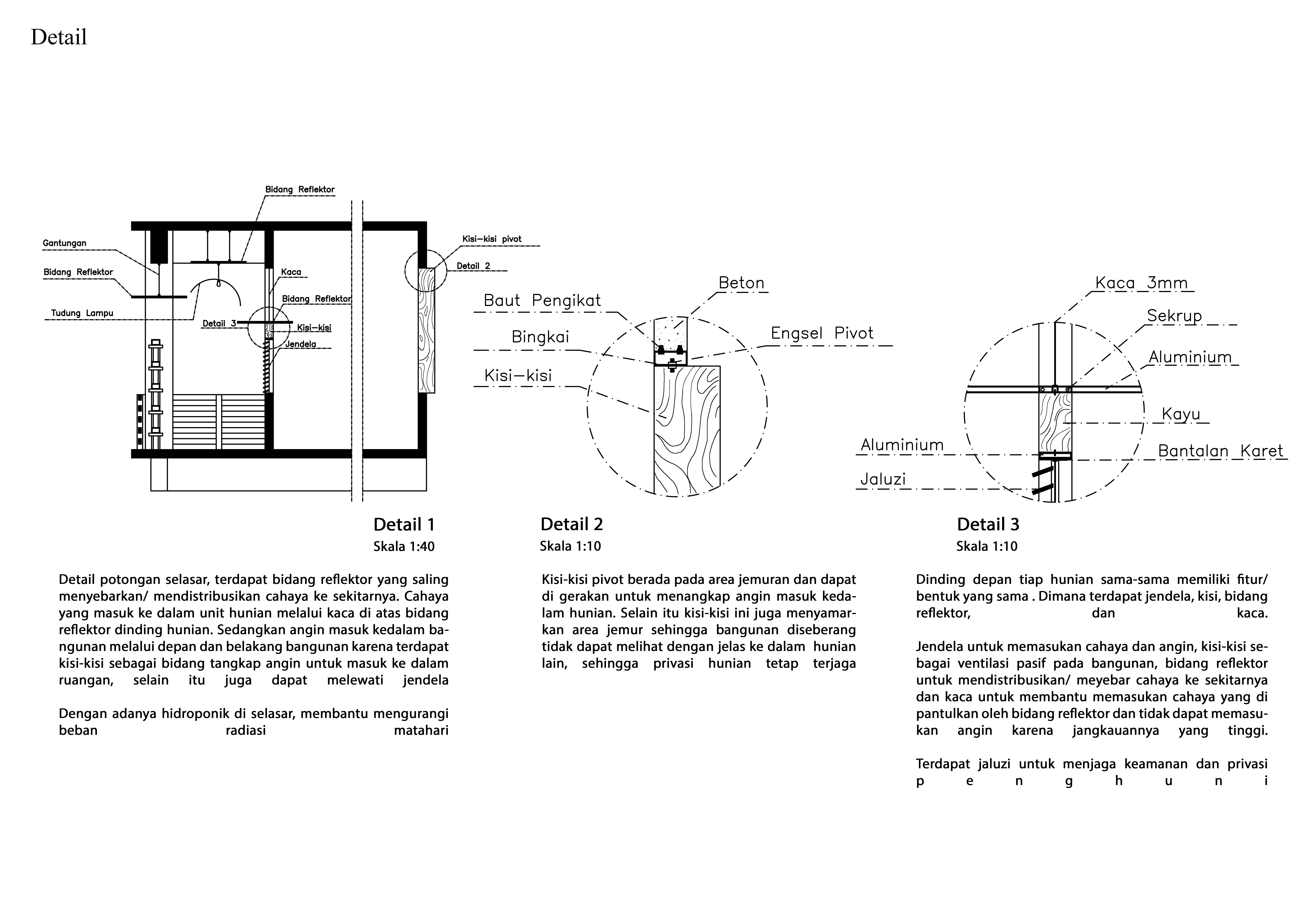 Library's collection Library's IT development CancelRumah Susun sebagai hunian bagi masyarakat yang tidak mempunyai tempat tinggal di daerah perkotaan. Pemerintah Kota Surabaya mempunyai program kerja 100-0-100 untuk memenuhi akses layanan akses air, memberantas kawasan kumuh dan sanitasi layak, sehingga Kota Surabaya dapat menjadi lebih baik kedepannya dalam penataan kota. Masyarakat yang menempati rumah susun adalah masyarakat berpenghasilan rendah. Karena penghasilan yang rendah akhirnya mereka mencari tempat tinggal yang sesuai dengan kemampuan ekonomi mereka. Lingkungan yang mereka tempati memiliki tingkat kelayakan dibawah rata-rata. Hunian dengan luasan yang minim, menampung banyak orang, tidak tersediannya jaringan yang baik dan lingkungan yang tidak bersih. Dengan adanya rumah susun ini, diharapkan dapat memenuhi kebutuhan hunian bagi para masyarakat tersebut, dengan menyediakan hunian yang mencukupi kebutuhan gerak mereka, sistem utilitas dan sanitasi yang baik, aman dan nyaman. Selain memberikan fasilitas hunian bagi mereka, rumah susun ini juga memberikan aktivitas produktif bagi masyarakat tersebut, yaitu fasilitas bertani dengan sistem hidroponik dan akuaponik. Dari aktivitas produktif tersebut mereka dapat memenuhi kebutuhan pangan mereka sendiri dan dapat meningkatkan perekonomian mereka, sehingga kualitas hidup mereka dapat meningkat. Untuk menekan biaya energi atau operasional yang ditanggung oleh para penghuni, rumah susun ini di desain hemat energi. Hemat energi pada bangunan di terapkan pada beberapa aspek yang mudah untuk dilakukan dan tidak memakai biaya konstruksi yang mahal.