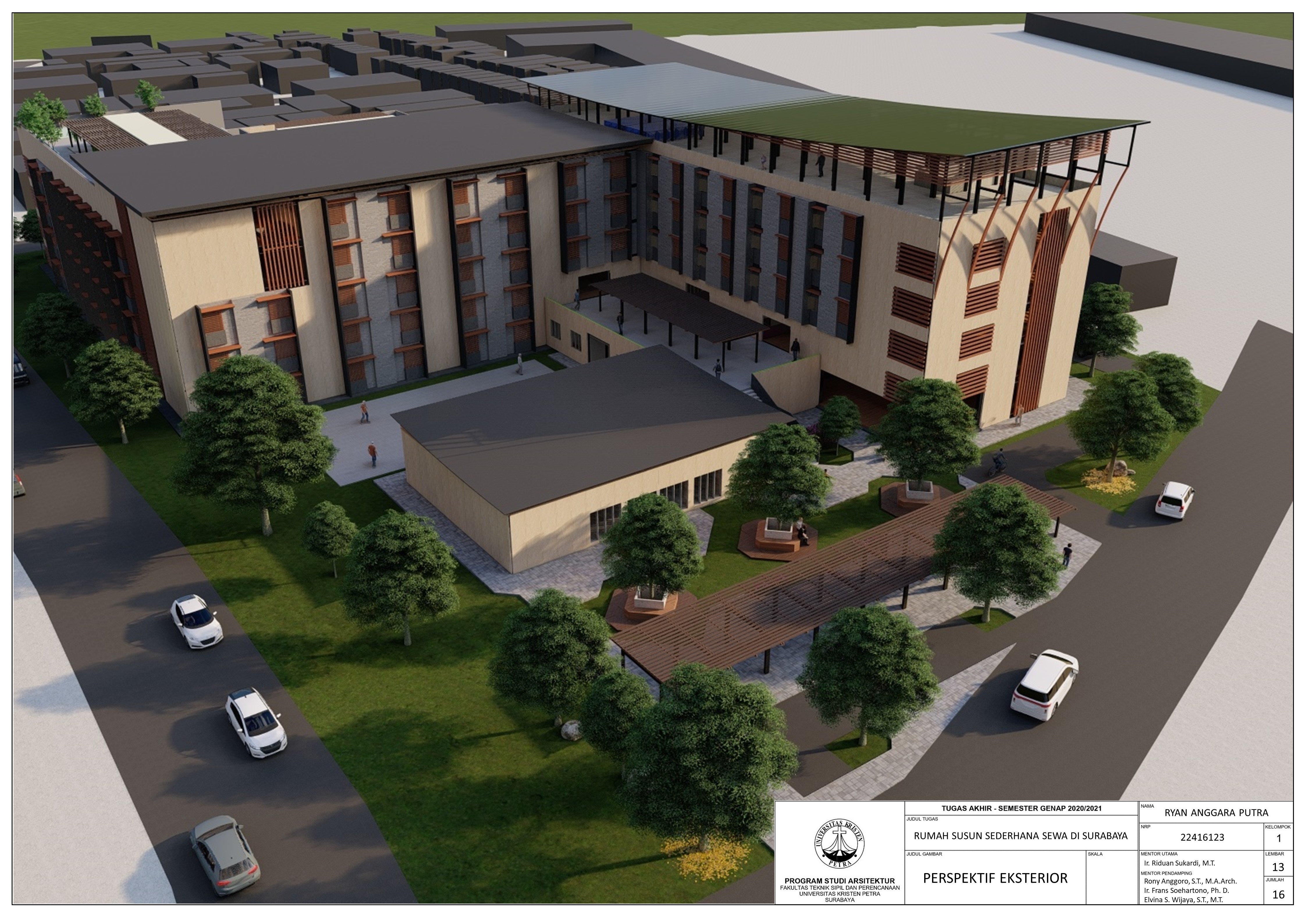 Library's collection Library's IT development CancelRumah Susun Sederhana Sewa merupakan rumah susun yang memberlakukan sistem sewa untuk masyarakat yang berpenghasilan rendah. Rumah susun ini akan memperkenalkan teknologi konstruksi modern yaitu konstruksi modular, sehingga pembangunannya lebih cepat dan lebih ramah lingkungan jika dibandingkan dengan konstruksi biasa. Rumah susun ini dirancang di kota Surabaya, karena kota ini merupakan kota kedua terbesar di Indonesia setelah kota Jakarta, dan merupakan kota metropolitan terbesar di provinsi Jawa Timur. Oleh karena itu, kota Surabaya ini merupakan kota yang padat akan penduduknya, sehingga kota ini memiliki kekurangan dalam segi kepemilikan rumah maupun tanah kosong untuk masyarakat berpenghasilan rendah. Mereka akan cenderung membeli rumah atau tanah dipinggiran kota, sehingga akan membuat mereka terpaksa untuk mengendarai kendaraan bermotor untuk pergi kerja. Jika terlalu banyak yang melakukan hal tersebut, maka jalan pada kota akan sering padat pada pagi hari (pergi kerja) dan pada sore-malam hari (pulang kerja), bahkan terjadi pada siang hari (istirahat). Oleh karena itu, rumah susun modular ini akan menjadi salah satu pemecah masalah seperti, memperpendek jarak tempuh para pekerja dengan cara memberikan rumah tinggal pada area kerja, sehingga dapat mengurangi jumlah pengemudi di jalan.