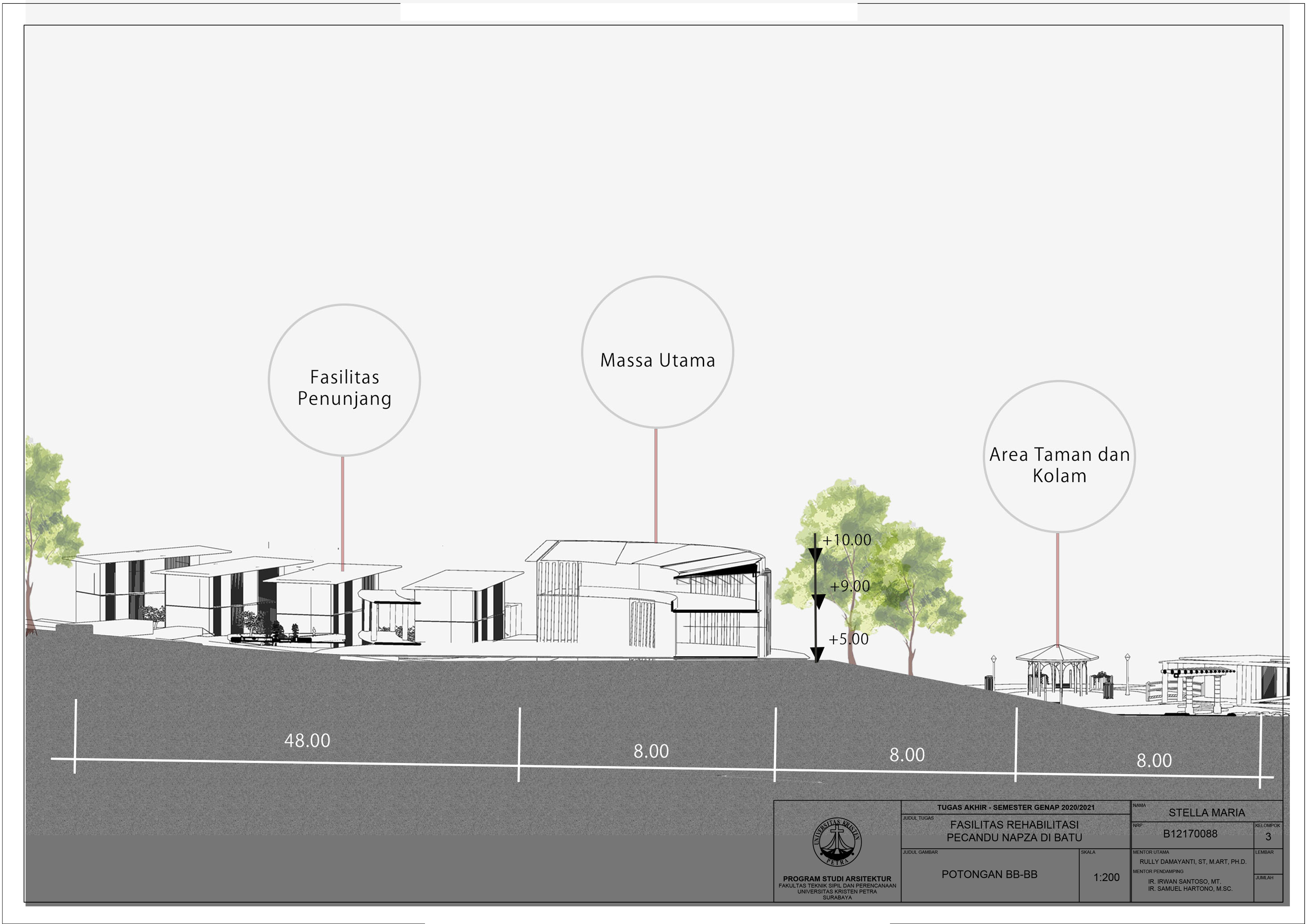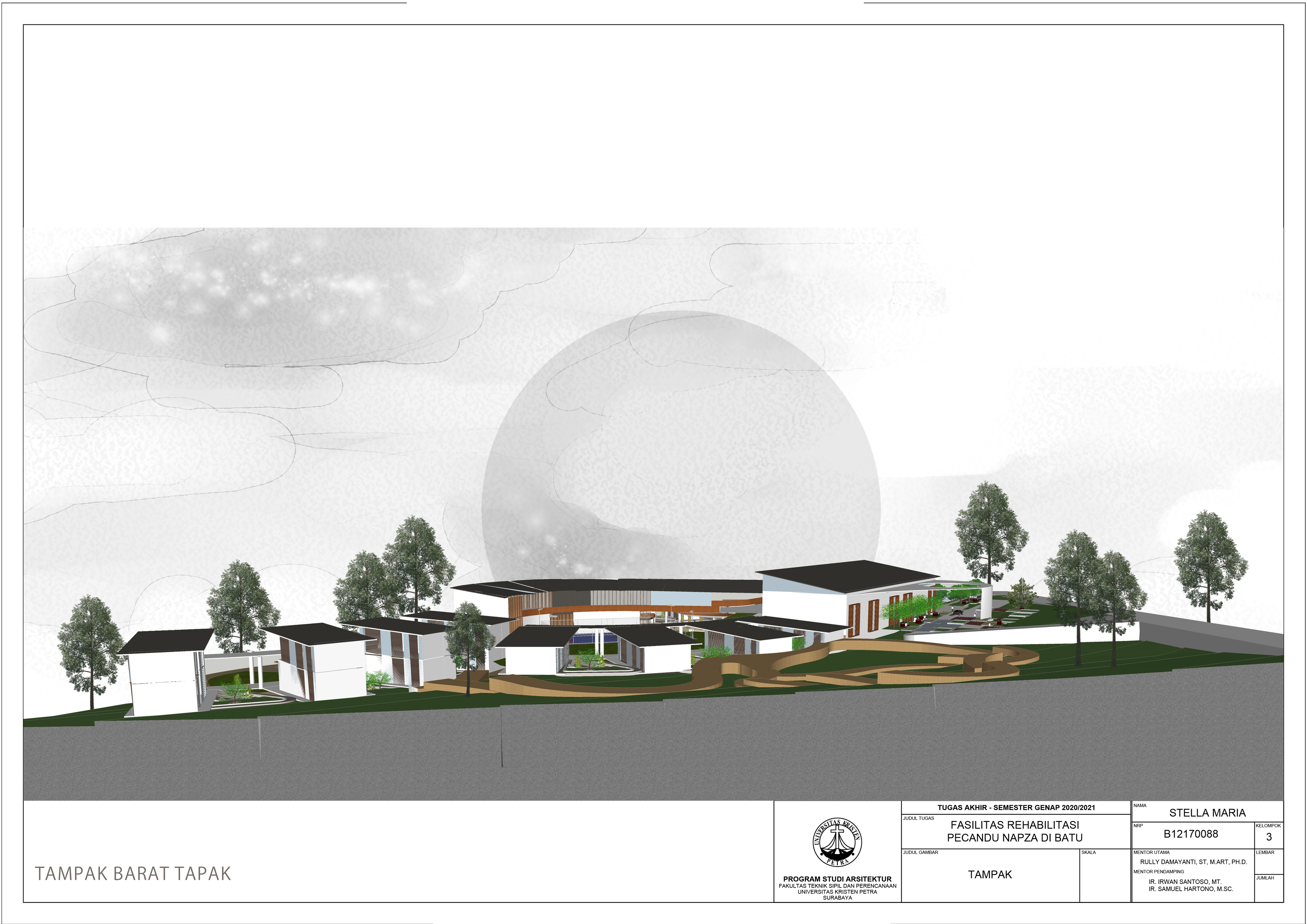 Library's collection Library's IT development CancelFasilitas Rehabilitasi Pecandu Napza di Batu merupakan fasilitas yang mewadahi para pecandu Napza terutama untuk kalangan remaja dan dewasa. Kota Batu sendiri merupakan kota dengan pengguna Napza tertinggi kedua se-Jawa Timur. Fasilitas Rehabilitasi Pecandu Napza di Batu akan menjadi tempat yang mempersiapkan mantan pecandu Napza untuk pulih dan bisa diterima kembali di kalangan masyarakat tanpa adanya pandangan negatif dari lingkungan sekitarnya. Dalam penerapannya projek ini memiliki konsep human connects to nature dimana Biofilik akan mewadahi proses penyembuhan secara sosialisasi (Therapeutic Community). Fasilitas ini akan dilengkapi fasilitas terapi yang dibedakan menjadi terapi Diad (untuk dua orang), terapi Triad (untuk tiga orang), penginapan tamu keluarga, penginapan rehabilitan, kamar tidur pengawas, ruang workshop, ruang bakat minat, kantor pengelola, lounge, minimarket, food stalls, dan amphitheatre. Pendekatan perilaku digunakan untuk menciptakan suatu ruang yang dapat memenuhi kebutuhan pengguna selama masa penyembuhan.