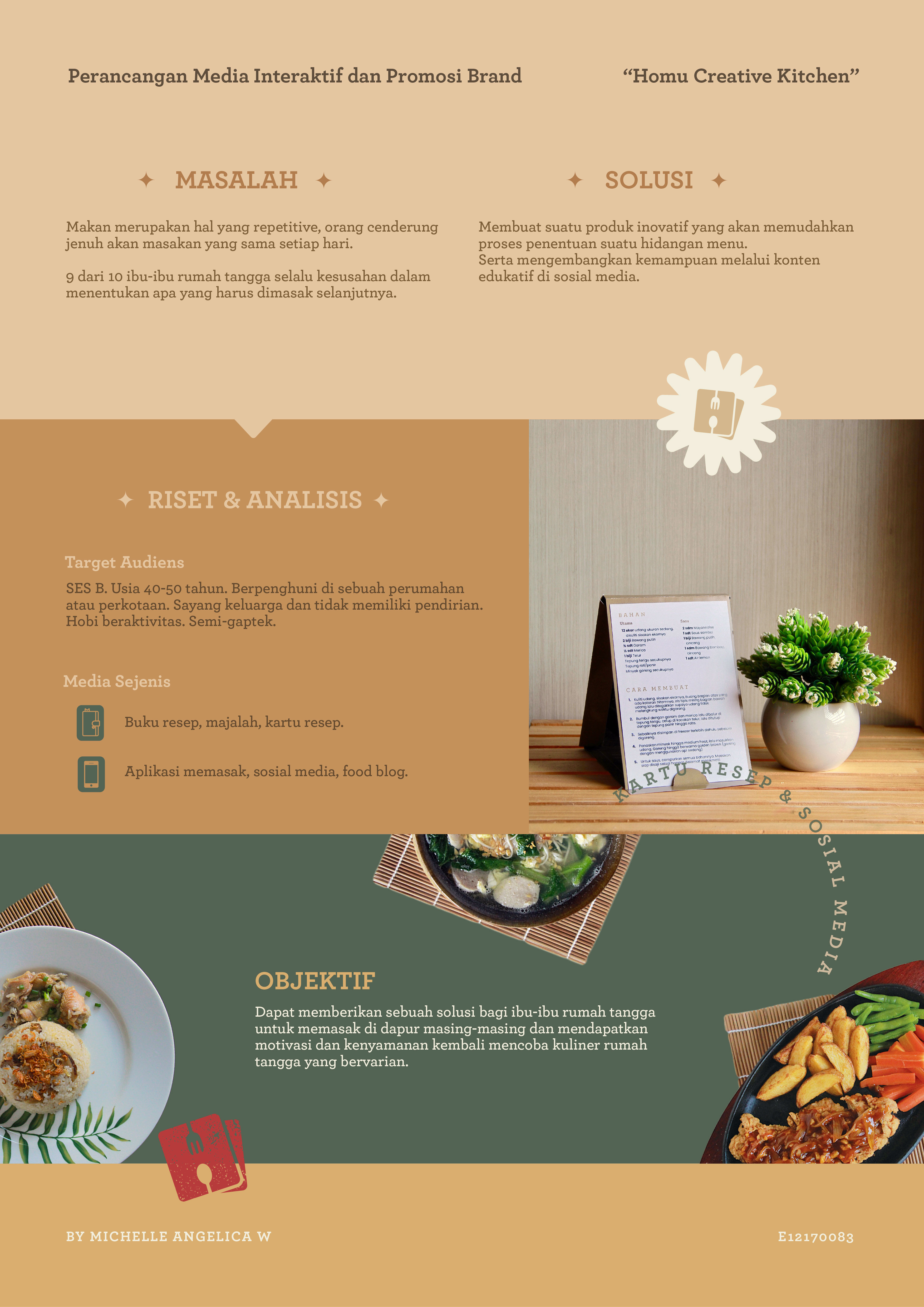 Library's collection Library's IT development CancelIbu-ibu rumah tangga sering mengalami kekhawatiran dalam menentukan menu hidangan bagi keluarganya, terutama buat yang belum terlalu paham dengan aktivitas di dapur. Mereka cenderung untuk lebih sering membeli makanan diluar, dimana hal tersebut lebih tidak sehat dan menghabiskan uang yang jauh lebih banyak. Oleh karena itu, lebih baik untuk membuat suatu media interaktif dengan membawakan tema homemade cullinary bagi ibu-ibu rumah tangga untuk setidaknya membantu menentukan suatu menu hidangan yang sebelumnya sedang mengalami dilema akan apa yang harus mereka masak, dengan objektif bagi mereka untuk mengurangi membeli masakan luar. Hal ini juga bertujuan agar mereka tetap bisa terus produktif di dalam rumah tangga masing-masing dengan metode dan cara yang kreatif, unik dan menambahkan experience yang menyenangkan bagi keluarga.