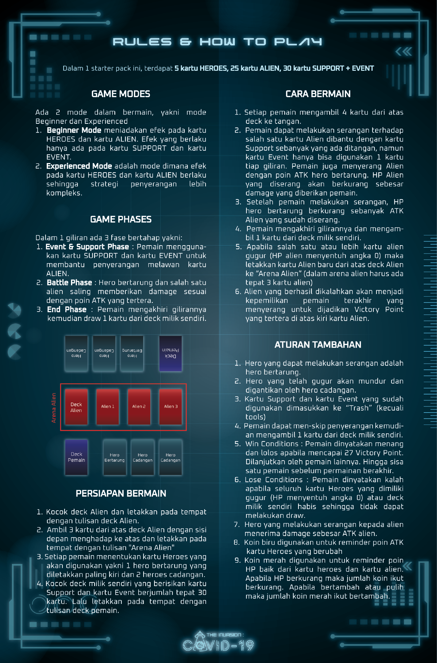 Library's collection Library's IT development CancelCOVID-19 berdampak besar di seluruh dunia. Paranoia dan kekhawatiran dialami semua orang termasuk pra-remaja. Pra-remaja terpaksa harus berdiam di rumah padahal mereka membutuhkan sosialisasi. Pra-remaja adalah masa di mana awal pubertas terjadi dan adanya tekanan konformitas yang kuat. Pra-remaja menjadi depresi, sensitif dan suka memberontak. Hal-hal ini membuat mereka menjadi kurang peduli untuk memahami COVID-19 dan bahayanya. Karena itu diperlukan suatu media yang menarik bagi pra-remaja, yakni Collectible Card Games (CCG). Tujuan penelitian adalah merancang dan mendesain kartu dari visual, gameplay dan story untuk menghasilkan CCG yang sesuai. CCG ini dibuat agar dapat mengedukasi pra-remaja mengenai COVID-19 dan new normal. CCG yang akan dirancang tidak hanya dijadikan sebagai media edukasi namun juga sebagai media hiburan. Karakter yang dibuat secara digital mengambil inspirasi dari para kontributor yang berjasa di masa pandemi, sebagai bentuk apreasiasi bagi para kontributor tersebut. Selain itu terdapat kartu alien yang merepresentasikan gejala atau dampak dari COVID-19. Kartu alien ini akan menjadi musuh dari kartu para kontributor atau kartu heroes. Metodologi penelitian yang digunakan adalah metodologi kualitatif melalui wawancara dan survei. Data yang didapatkan akan dianalisa dengan cara SWOT dan 5W+1H. Diharapkan, pra-remaja semakin memahami COVID-19 serta bisa mempersiapkan diri menghadapi new normal.