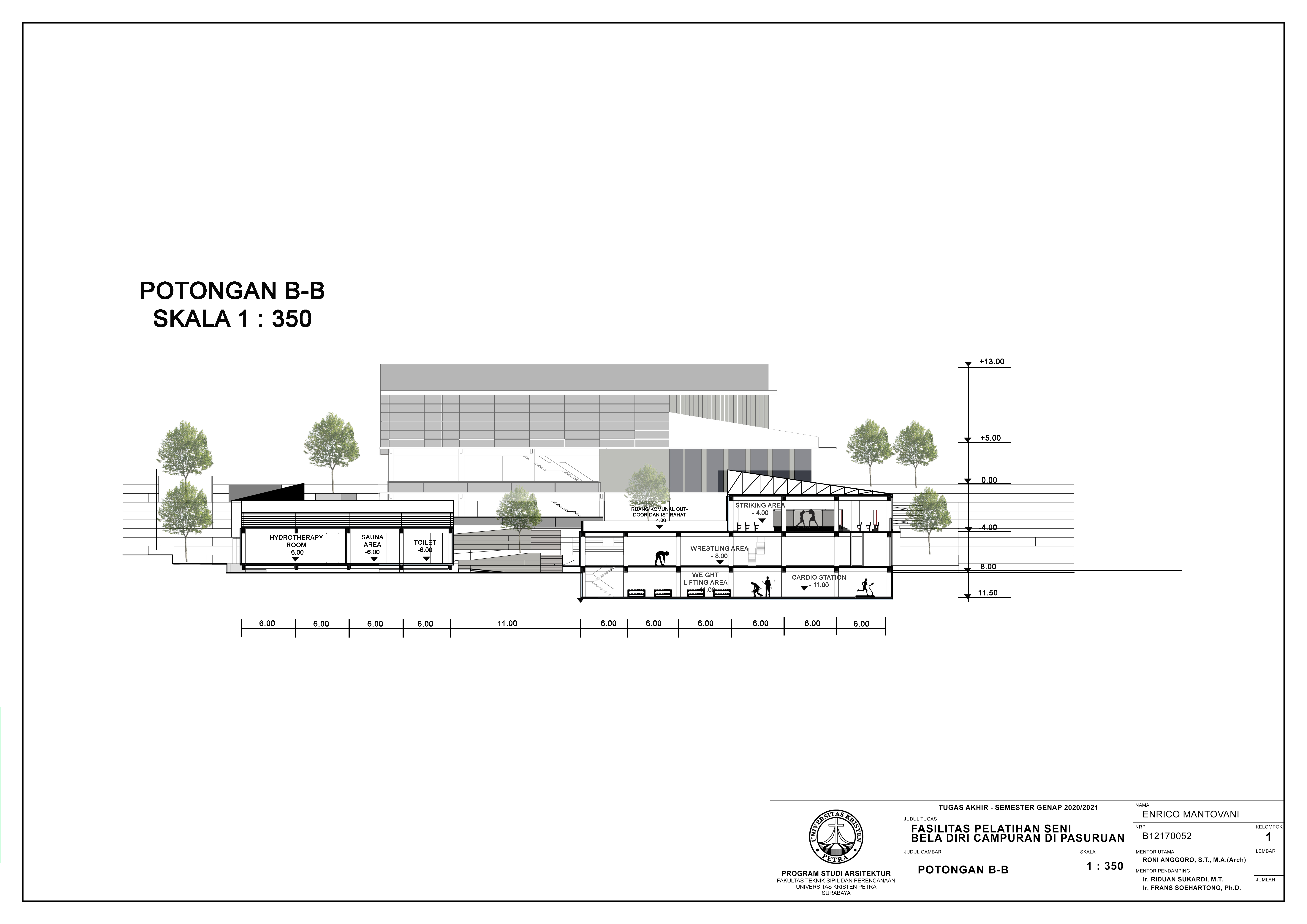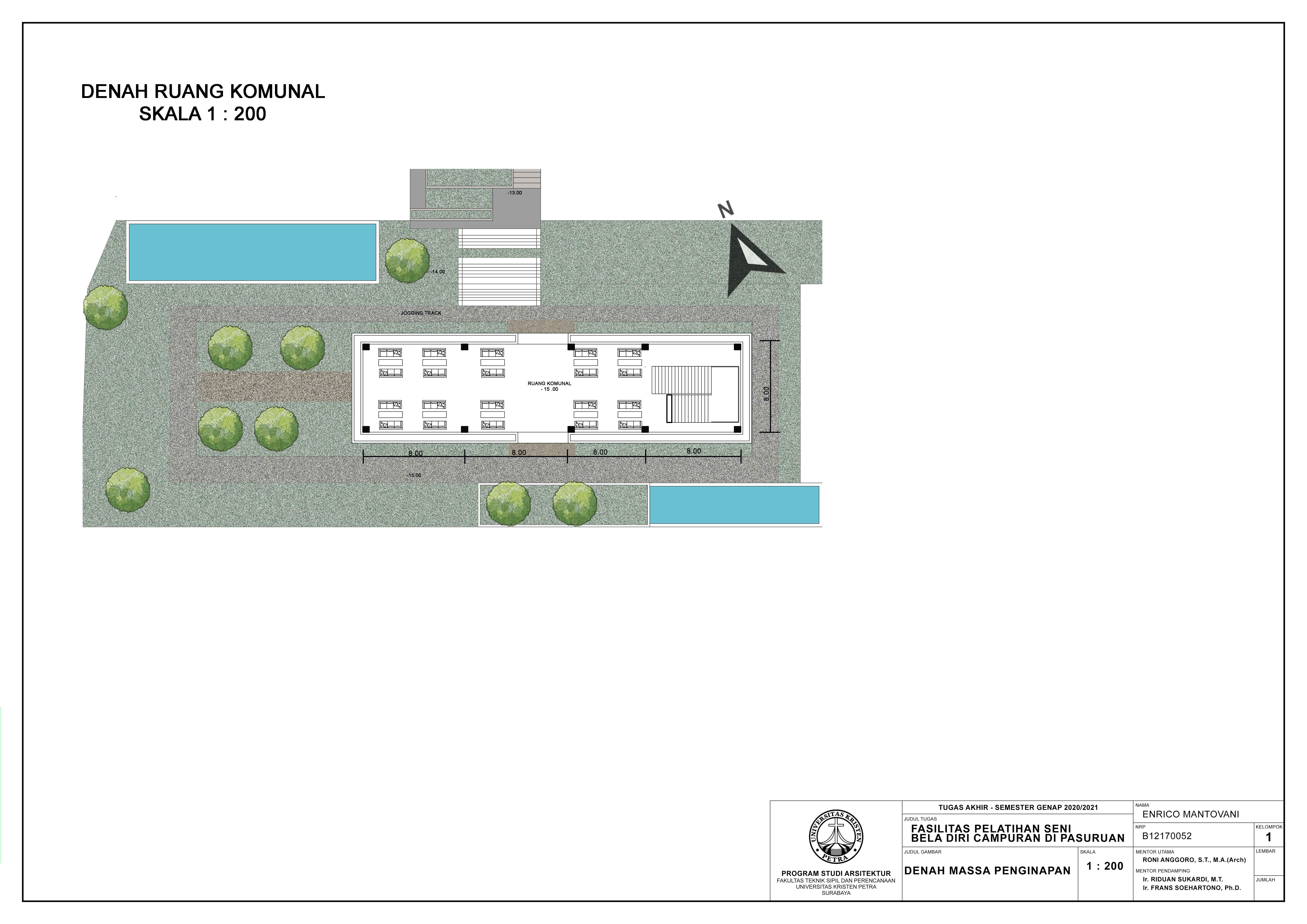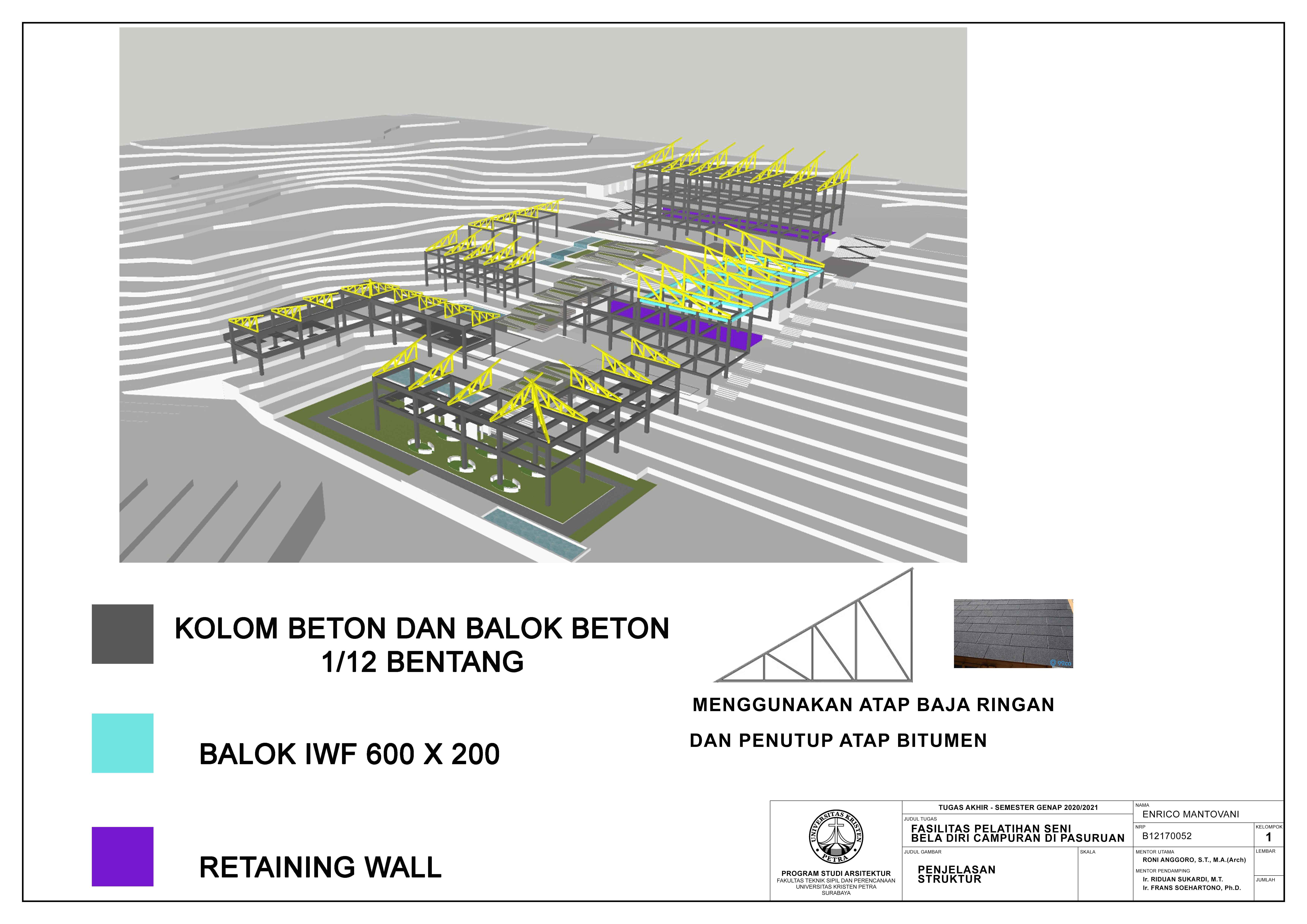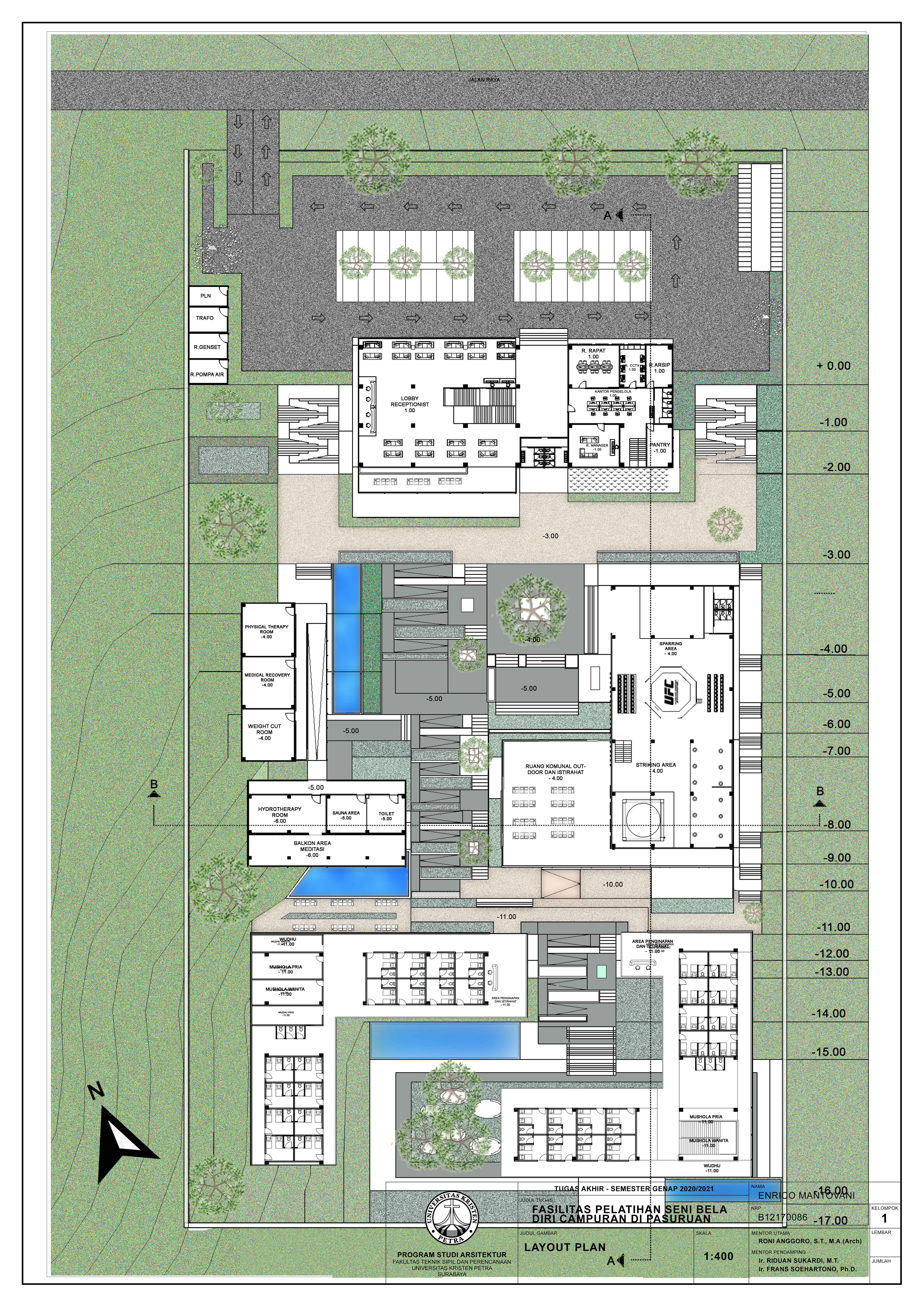 Library's collection Library's IT development CancelFasilitas Pelatihan Seni Beladiri Campuran di Pasuruan merupakan fasilitas yang mewadahi aktivitas dan berbagai macam kebutuhan peminat seni bela diri campuran di Pasuruan khususnya Jawa Timur. Fasilitas ini juga terbuka untuk umum, yang memberikan kesempatan bagi calon atlet-atlet muda, cabang olahraga bela diri campuran di Jawa Timur, untuk berlatih sebelum bertanding dan terapi pemulihan setelah bertanding. Fasilitas ini tidak hanya dilengkapi dengan fasilitas berlatih saja, namun juga tersedia fasilitas area therapy, fasilitas penginapan serta fasilitas pendukung lainnya bagi para atlet. Keunikan daro fasilitas ini adalah dengan memanfaatkan kondisi alam yang hijau dan juga luas dengan lahan berkontur curam membentuk area area ruang luar yang memberikan hubungan antar ruang luar dan ruang dalam yang mampu memberikan suasana untuk mengurangi tekanan mental serta sikologis dari para atlet. Desain fasilitas ini juga menyesuaikan dengan karakteristik dan perilaku para pengguna sehingga dapat meningkatkan performa berlatih dan beristirahat para atlet.