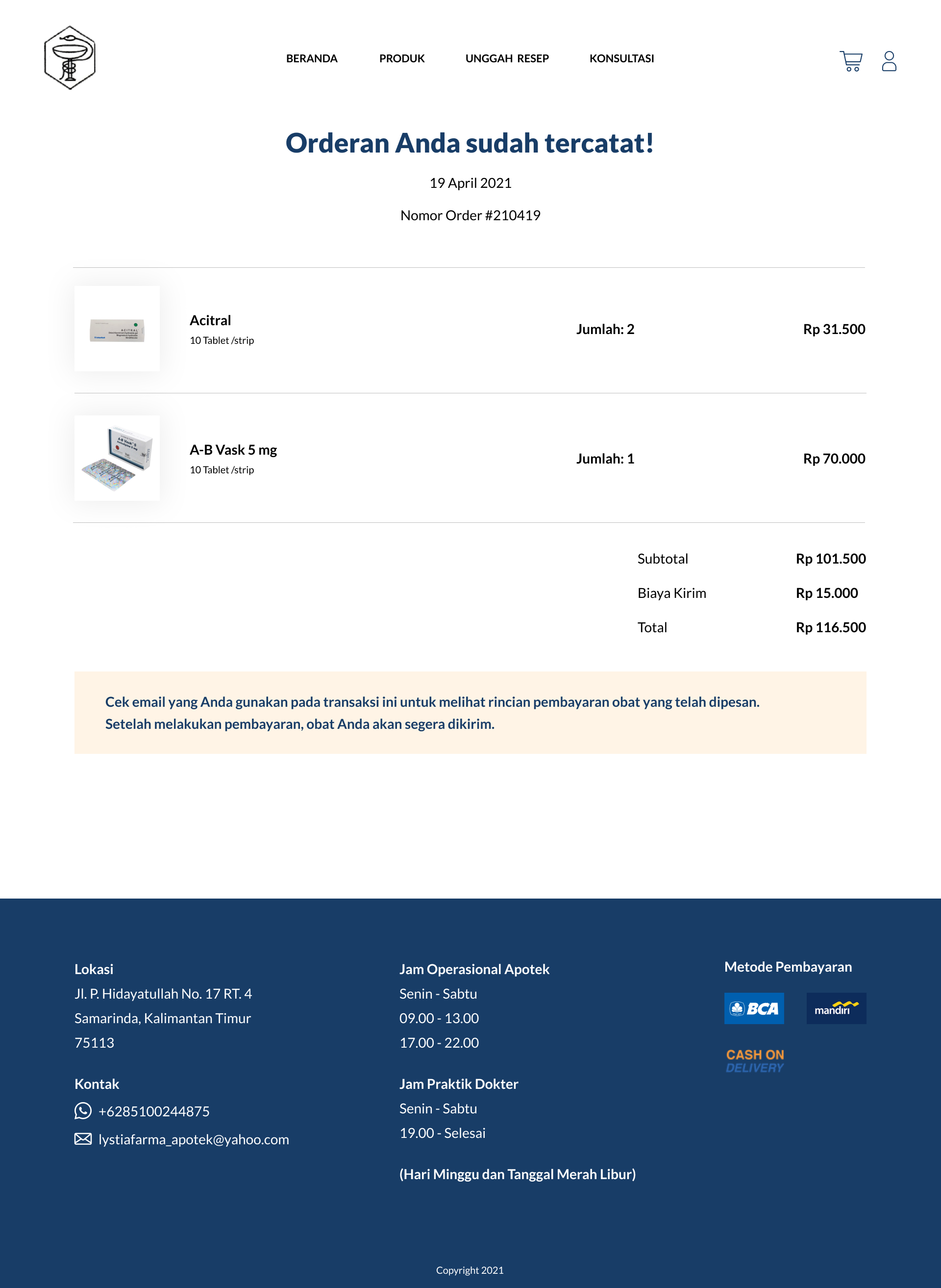 Library's collection Library's IT development CancelApotek Lystia Farma telah berdiri di Samarinda sejak 1997. Sejak awal berdiri hingga saat ini Apotek Lystia Farma selalu memberikan pelayanannya kepada masyarakat dengan bertemu secara langsung. Tetapi karena adanya pandemi yang membatasi kegiatan antar satu orang dengan yang lain, Apotek Lystia Farma tidak dapat memberikan pelayanannya secara optimal. Melalui perancangan website e-commerce ini diharapkan dapat membantu Apotek Lystia Farma meningkatkan kembali pelayanannya secara online. Pada website ini menampilkan produk obat-obatan hingga fasilitas konsultasi dengan dokter umum yang berpraktik di Apotek Lystia Farma. Masyarakat juga dapat bertransaksi secara langsung melalui websitenya.