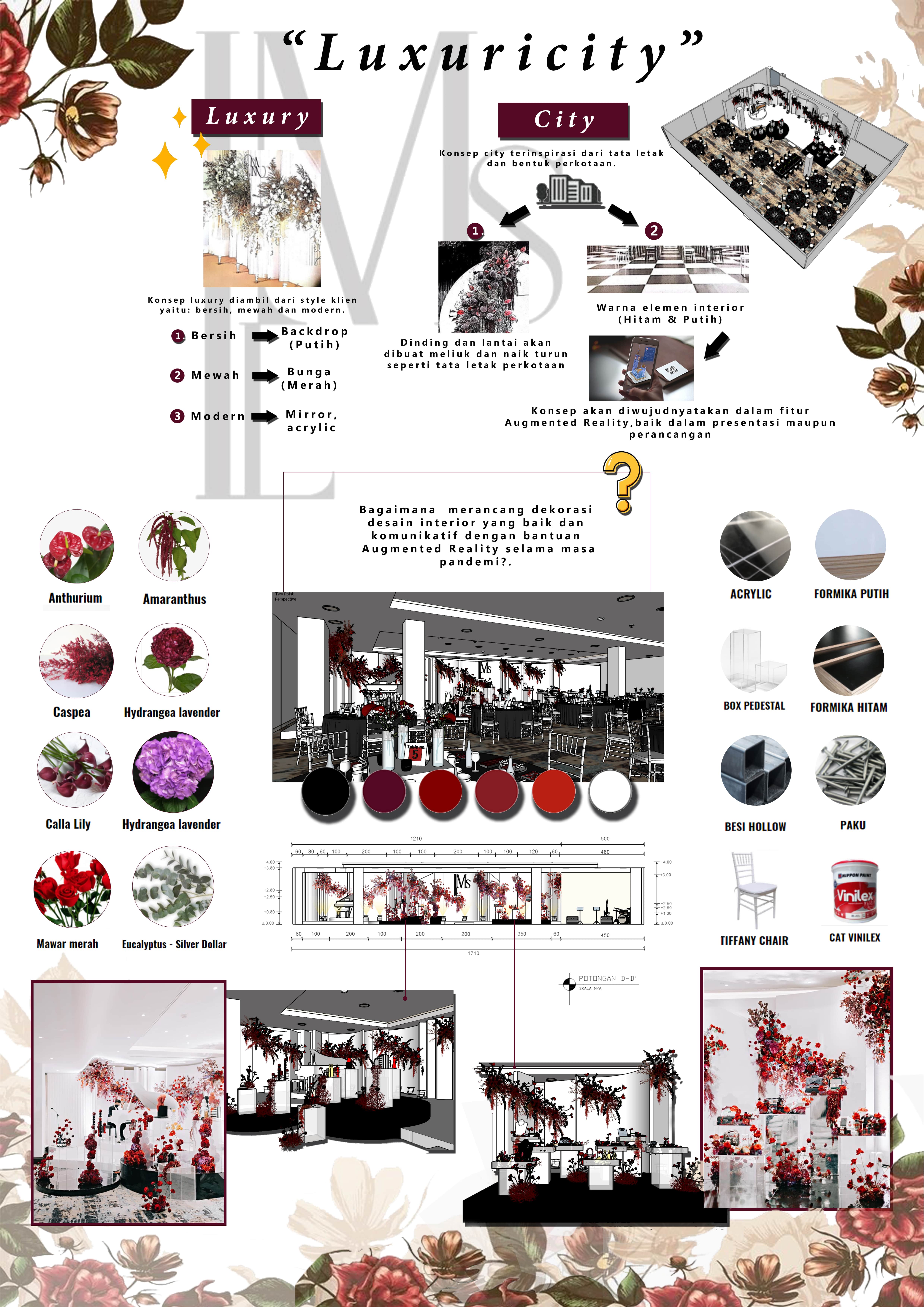 Library's collection Library's IT development CancelDi masa pandemi seperti sekarang ini, pemerintah menganjurkan semua instansi perusahaan untuk tidak melakukan pertemuan secara tatap muka. Hal ini tentu berdampak pada proses desain, di mana pada masa sebelum pandemi, konsep desain dapat dijelaskan dalam bentuk sketsa dan moodboard, namun sekarang hal tersebut sulit dilakukan, dikarenakan proses perancangan dan presentasi dilakukan secara online. Oleh karena itu, diperlukan alat bantu dalam memvisualisasikan dekorasi interior agar mudah dipahami oleh klien. Selain sebagai media presentasi yang baik, pengaplikasian AR juga dapat membantu dalam proses desain, misalnya dengan membuat rangka desain terlebih dahulu yang kemudian diproyeksikan ke dunia nyata dengan menggunakan aplikasi AR, sehingga desain yang dibuat di dalam komputer akan sama dengan (bentuk) desain akhir di dunia nyata. Dengan melibatkan aplikasi AR dalam proses desain dan presentasi, diharapkan rangkaian dekorasi interior yang dihasilkan sesuai dengan model tiga dimensi yang dipresentasikan oleh desainer kepada klien.