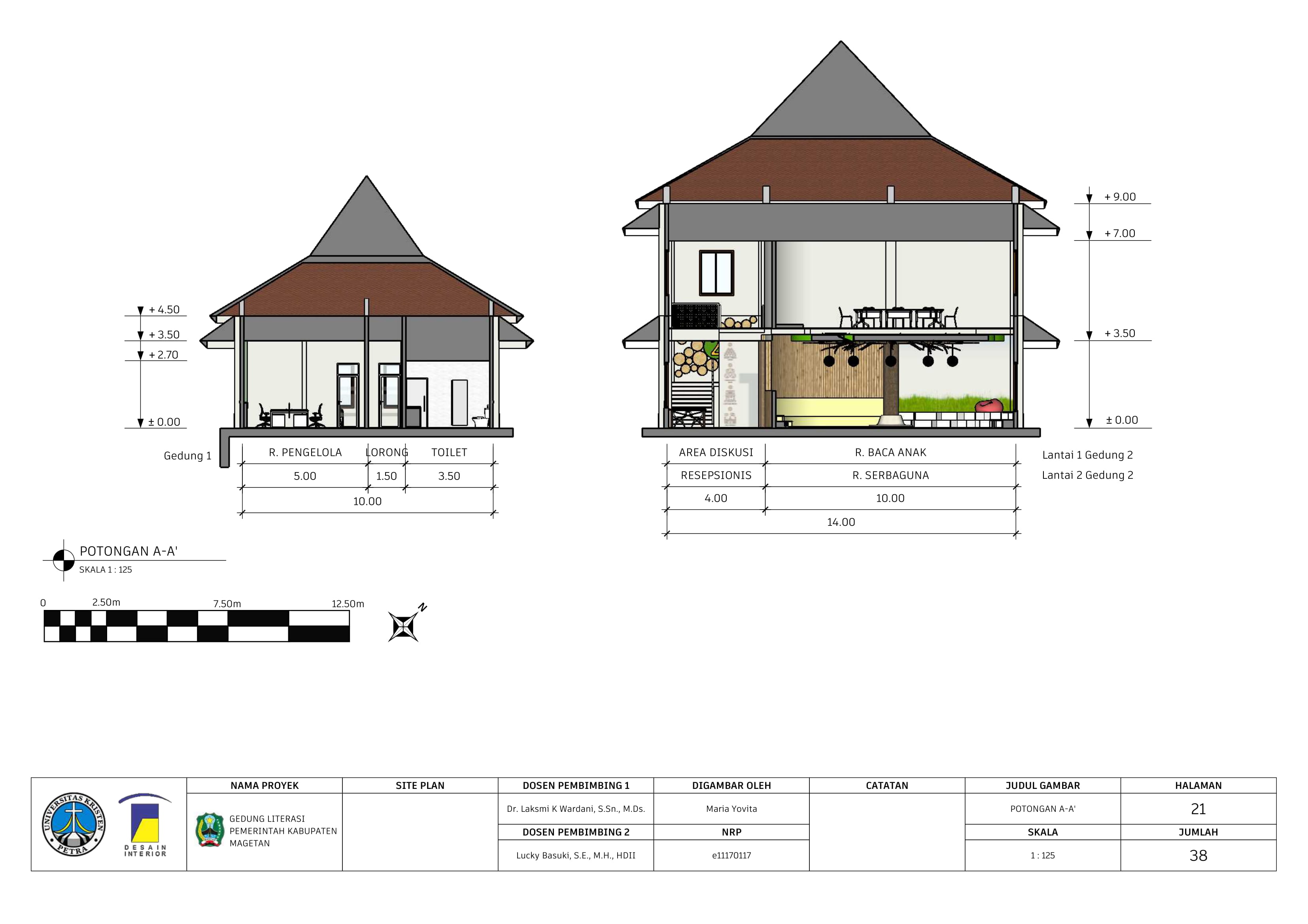 Library's collection Library's IT development CancelMagetan dicanangkan sebagai Kabupaten Literasi oleh Bupati Kabupaten Magetan. Hal ini mendorong masyarakat untuk lebih giat dalam melakukan literasi. Beberapa komunitas mulai aktif melakukan kegiatan bersama disetiap minggunya. Untuk memeberikan fasilitas agar komunitas dapat menghasilkan karya berikutnya, Bupati Kabupaten Magetan ingin menyediakan fasilitas khusus bagi masyarakat untuk melakukan literasi. Tujuan dari perancangan ini adalah merancang Interior Gedung Literasi sebagai wadah edukasi dan rekreatif bagi masyarakat Kabupaten Magetan. Metode perancangan yang digunakan adalah design thinking yang terdiri dari tiga tahapan besar yaitu inspiration, ideation, dan implementation. Hasil dari perancangan ini adalah sebuah Desain Interior Gedung Literasi Magetan dengan menggunakan pendekatan Human Centered Design dan Regionalisme. Penulis berharap melalui perancangan ini dapat mewujudkan Gedung Literasi sebagai salah satu objek EcoEdu-Wisata yang sesuai dengan perkembangan zaman namun tetap menunjukan nilai lokal daerah Magetan.