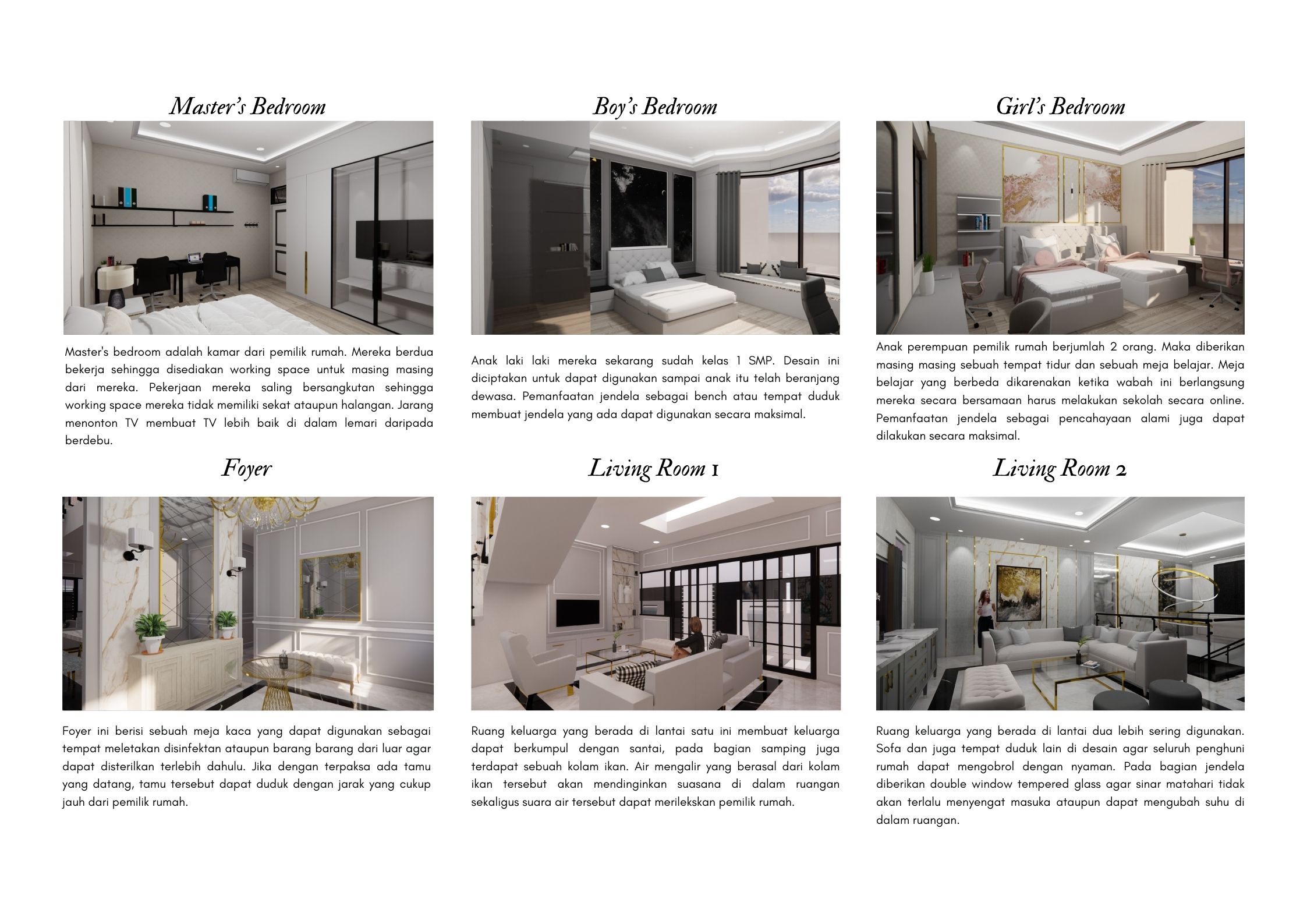 Library's collection Library's IT development CancelPada jaman modern seperti ini hunian modern merupakan gaya desain yang paling banyak dicari. Selain itu saat ini (2021) dunia telah berusaha melawan sebuah wabah virus Covid-19 dan juga membuat masyarakat diharuskan mengubah beberapa gaya hidupnya sehingga terciptalah sebuah era baru yang dikenal sebagai era new normal. Proyek ini merupakan sebuah proyek interior residential yang diberikan oleh Harvest Interior. Implementasi konsep eco design pada proyek desain ini memiliki tujuan yaitu untuk mengurangi penggunaan sumber daya dan juga menghasilkan sebuah desain yang mendukung era new normal yang saat ini sedang berlangsung. Memungkinkan memanfaatkan bukaan dan juga sirkulasi udara yang baik serta kefektifitasan pola sirkulasi penghuni rumah. Pelaksanaan proyek menggunakan metode design thinking. Dari pengerjaan proyek tersebut dapat disimpulkan bahwa memaksimalkan ventilasi atau bukaan yang ada dapat melancarkan sirkulasi dalam ruangan, untuk perputaran udara secara maksimal dapat juga digunakan exhaust fan dan juga kawat nyamuk pada ventilasi yang ada, penggunaan produk elektronik seperti lampu hemat energi dan juga AC inverter, serta peletakan lemari pakaian di dekat pintu masuk ataupun kamar mandi adalah beberapa hal yang perlu diperhatikan.