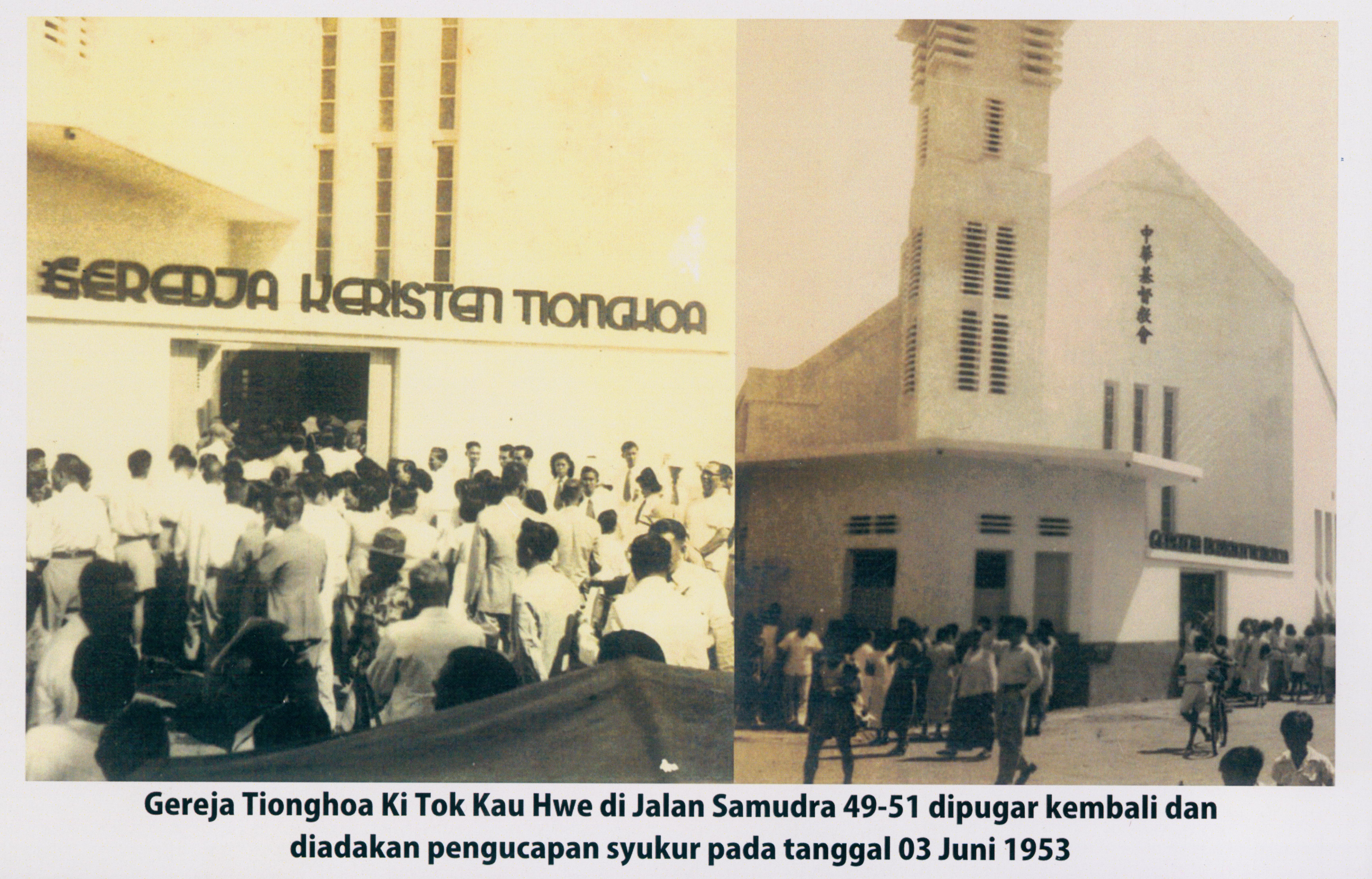 Suasana ucapan syukur renovasi gedung Gereja THKTKH Jalan Samudra, Surabaya No. 49-51 pada tanggal 3 Juni 1953.