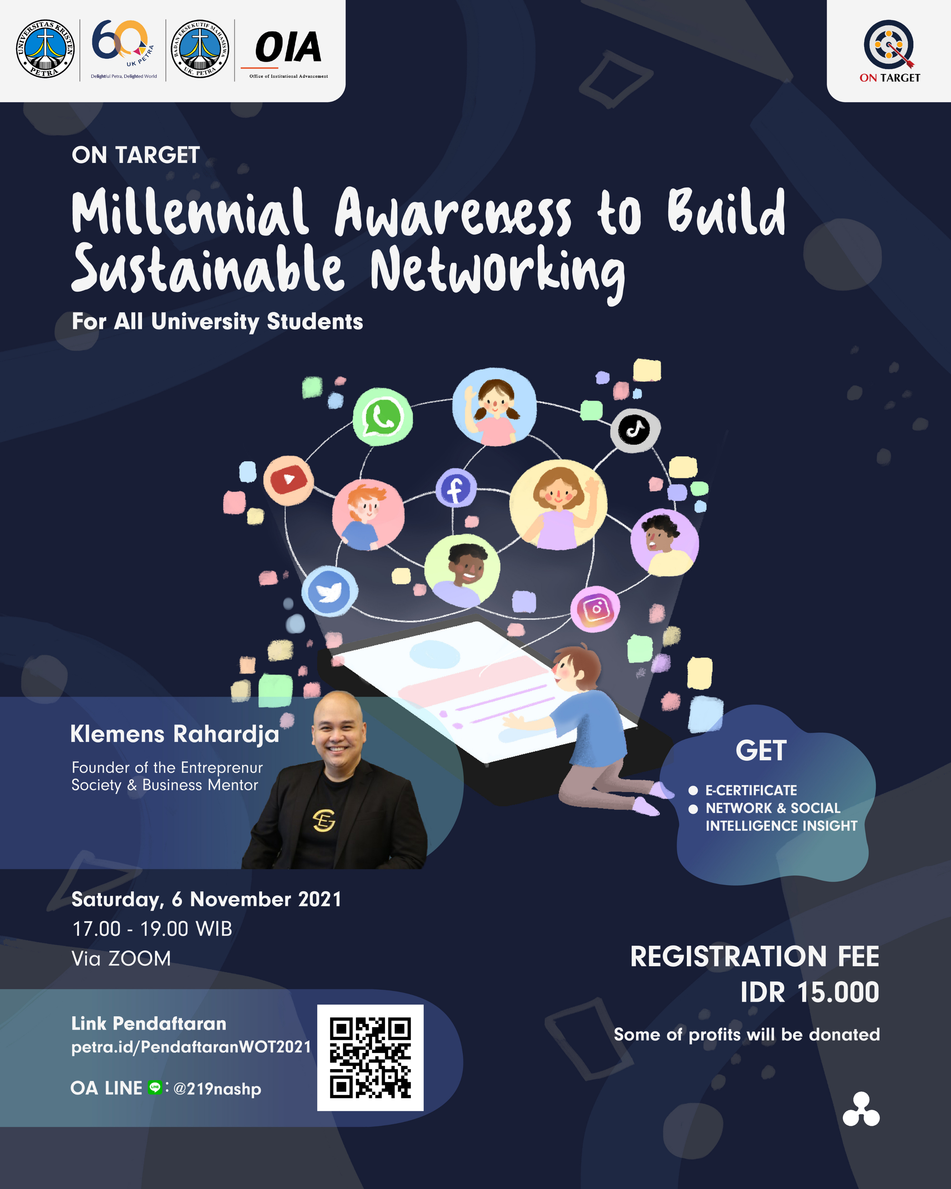 Library's collection Library's IT development CancelBadan Eksekutif Mahasiswa UK Petra Surabaya pada tanggal 06 November 2021, jam 17.00 -19.00 WIB, mengadakan acara webinar on target: millenial awareness to build sustainable networking. Dengan narasumber Klemens Rahardja, biaya pendaftaran Rp. 15.000,- acara ini diselenggarakan secara daring melalui aplikasi Zoom.
