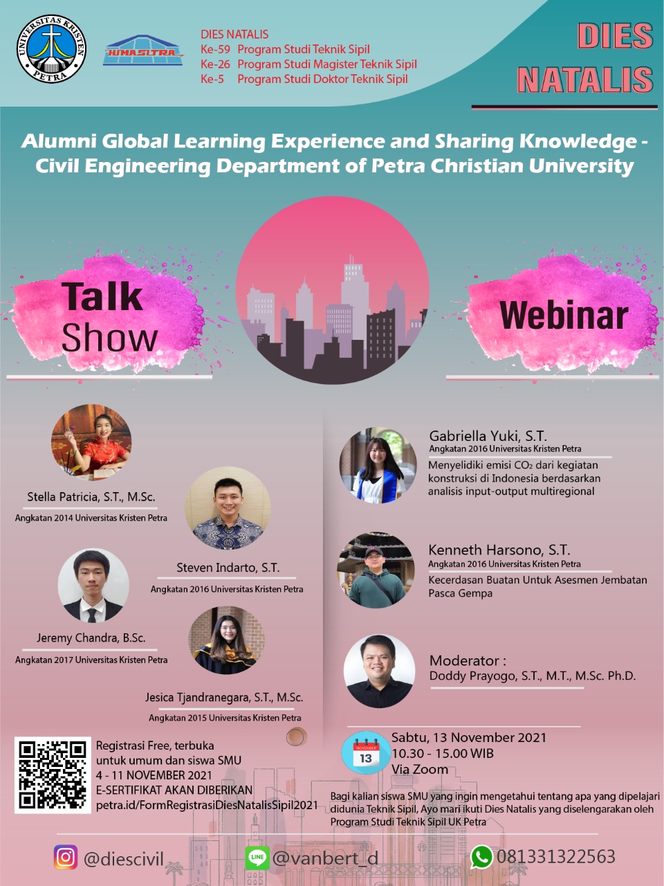 Library's collection Library's IT development CancelDalam rangak memeriahkan dies natalis program studi Teknik Sipil UK Petra, serangkaian acara webinar dan talkshow akan diadakan oleh Fakultas Teknik Sipil dan Perencanaan. Acara tersebut dilaksanakan pada tanggal 13 November 2021 jam 10.00 - 15.00 WIB. Dan diadakan secara daring melalui aplikasi Zoom. Pendaftaran dibuka pada tanggal 04 - 11 November 2021 dan terbuka untuk umum.