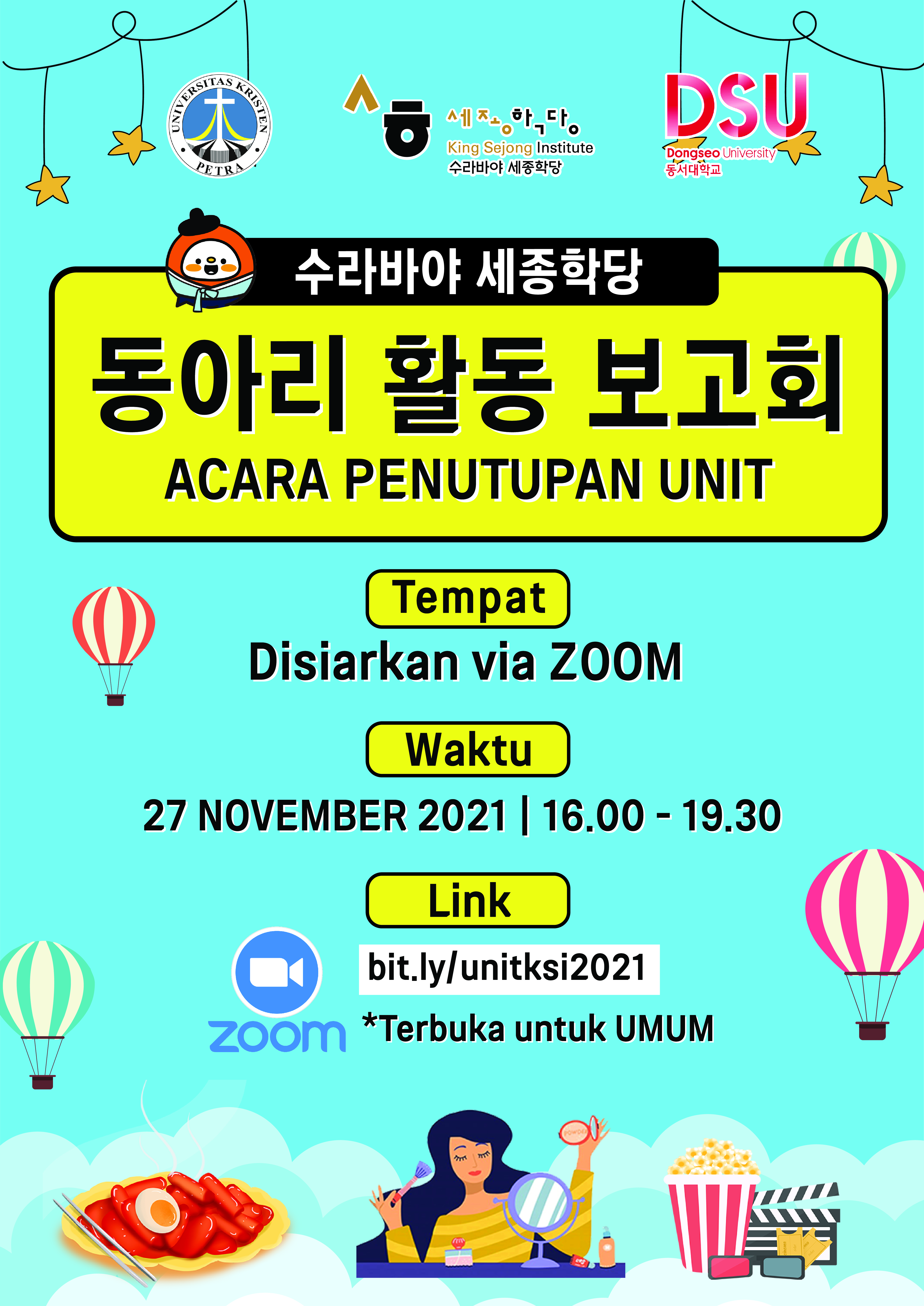 Library's collection Library's IT development CancelPada tanggal 27 November 2021 jam 16.00 - 19.30 WIB, King Sejong Institute mengadakan serangkaian acara didalam menutup tahun pelajaran 2021. Acara ini akan berlangsung secara online dengan aplikasi Zoom.
