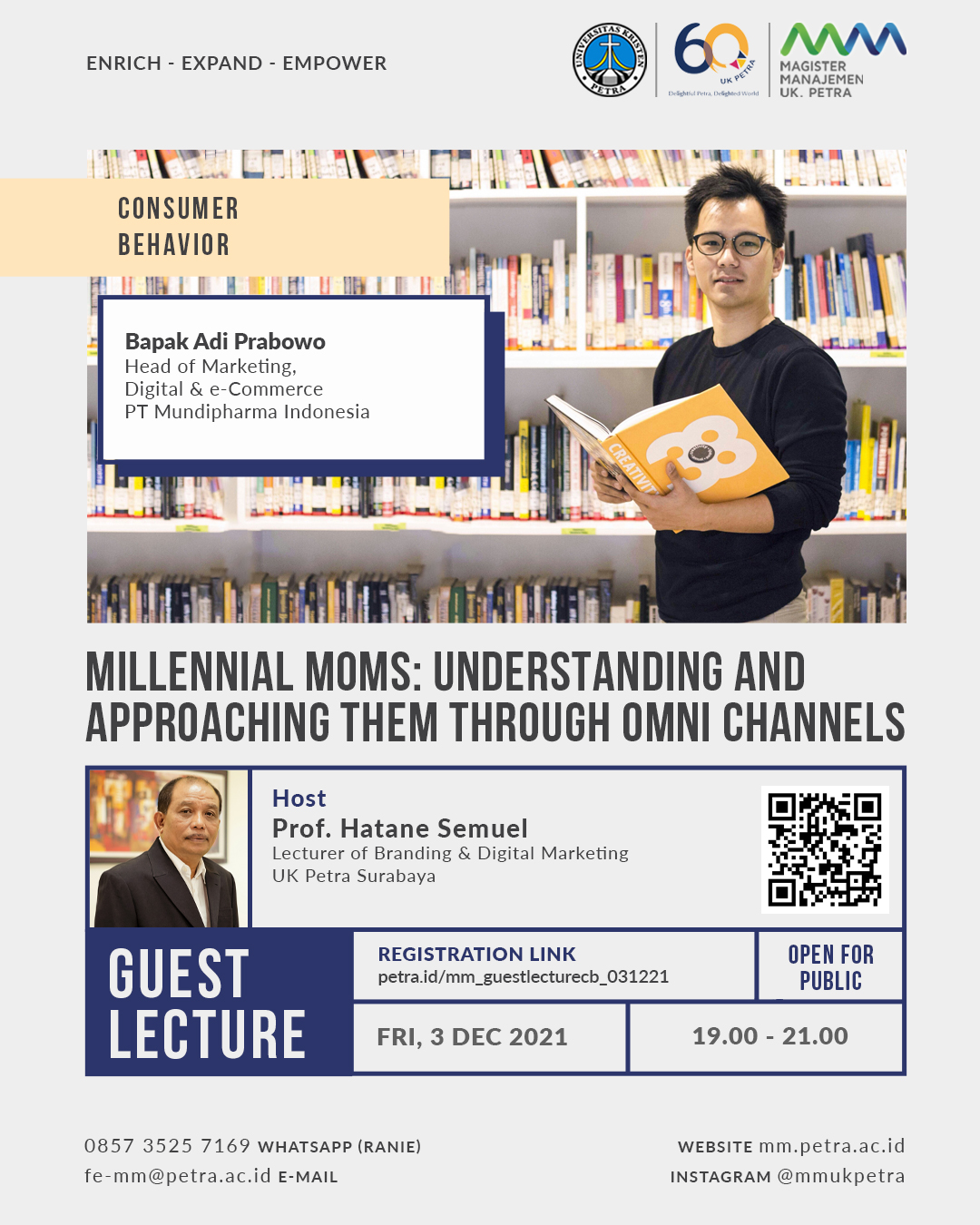 Library's collection Library's IT development CancelPada tanggal 03 Dessember 2021 jam 19.00 - 21.00 WIB program studi Magister Manajemen UK Petra mengadakan acara kuliah tamu "consumer behavior: millennial moms understanding and approaching them through omni channels". Dengan narasumber bapak Adi Prabowo dan sebagai host adalah Prof. Hatane Semuel.