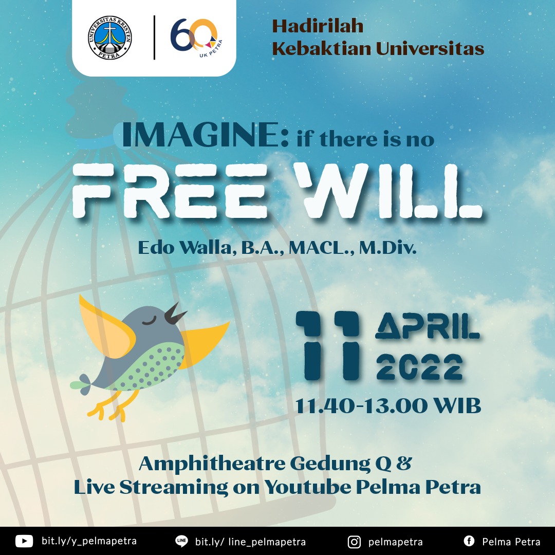 Library's collection Library's IT development CancelPada tanggal 11 April 2022 jam 11.40 - 13.00 WIB, akan diadakan kebaktian universitas setiap hari Senin. Dengan mengangkat tema imagine if there is no free will (bayangkan jika tidak ada kehendak bebas), menghadirkan bapak Edo Walla sebagai pengkhotbah. Acara ini disiarkan langsung melalui channel Youtube Pelma Petra.