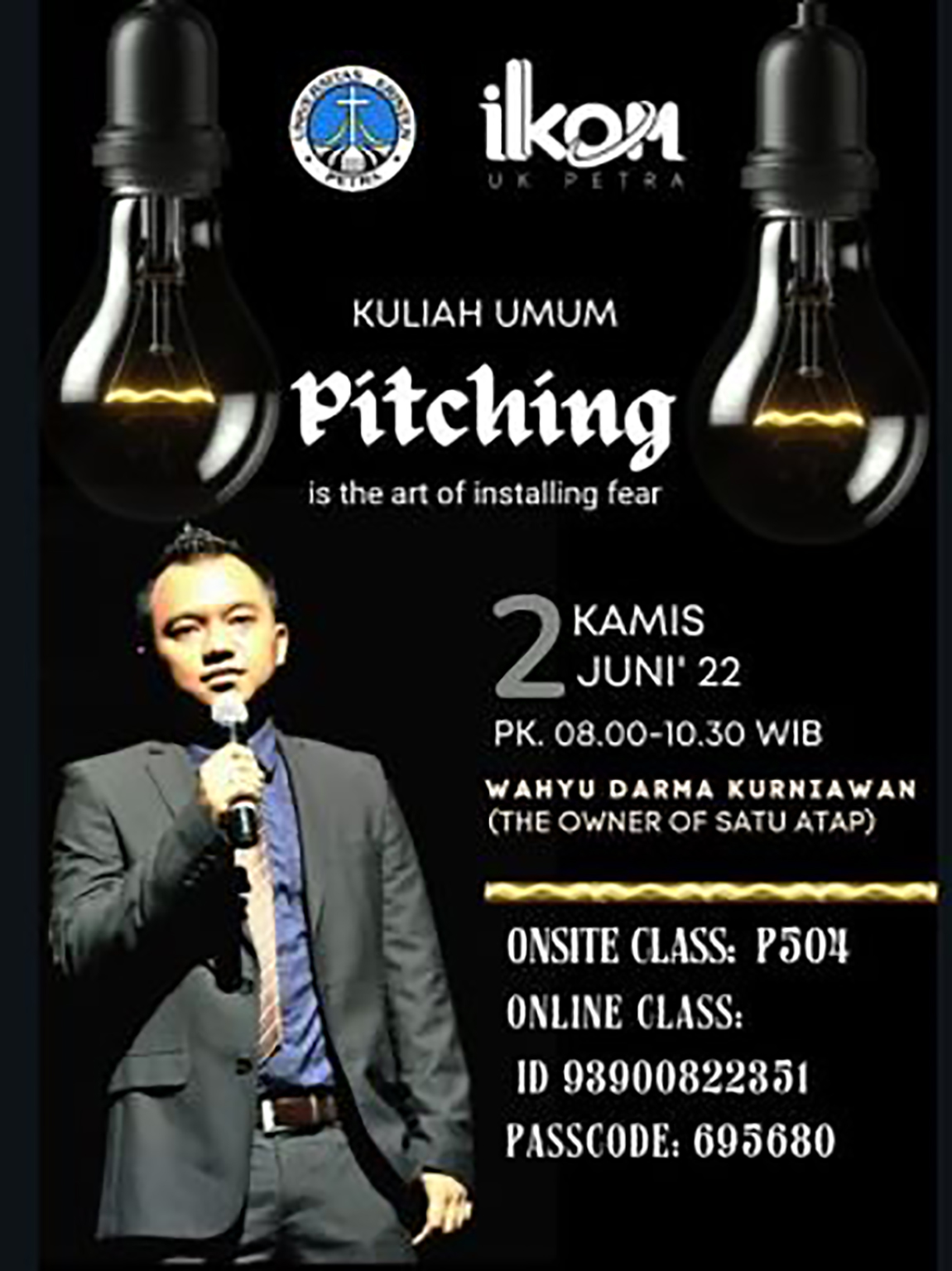 Library's collection Library's IT development CancelProgram Studi Ilmu Komunikasi UK Petra mengadakan kuliah umum dengan tema Pitching dengan narasumber bapak Wahyu Darma Kurniawan. Acara ini dilaksanakan pada tanggal 02 Juni 2022 jam 08.00 - 10.30 WIB.