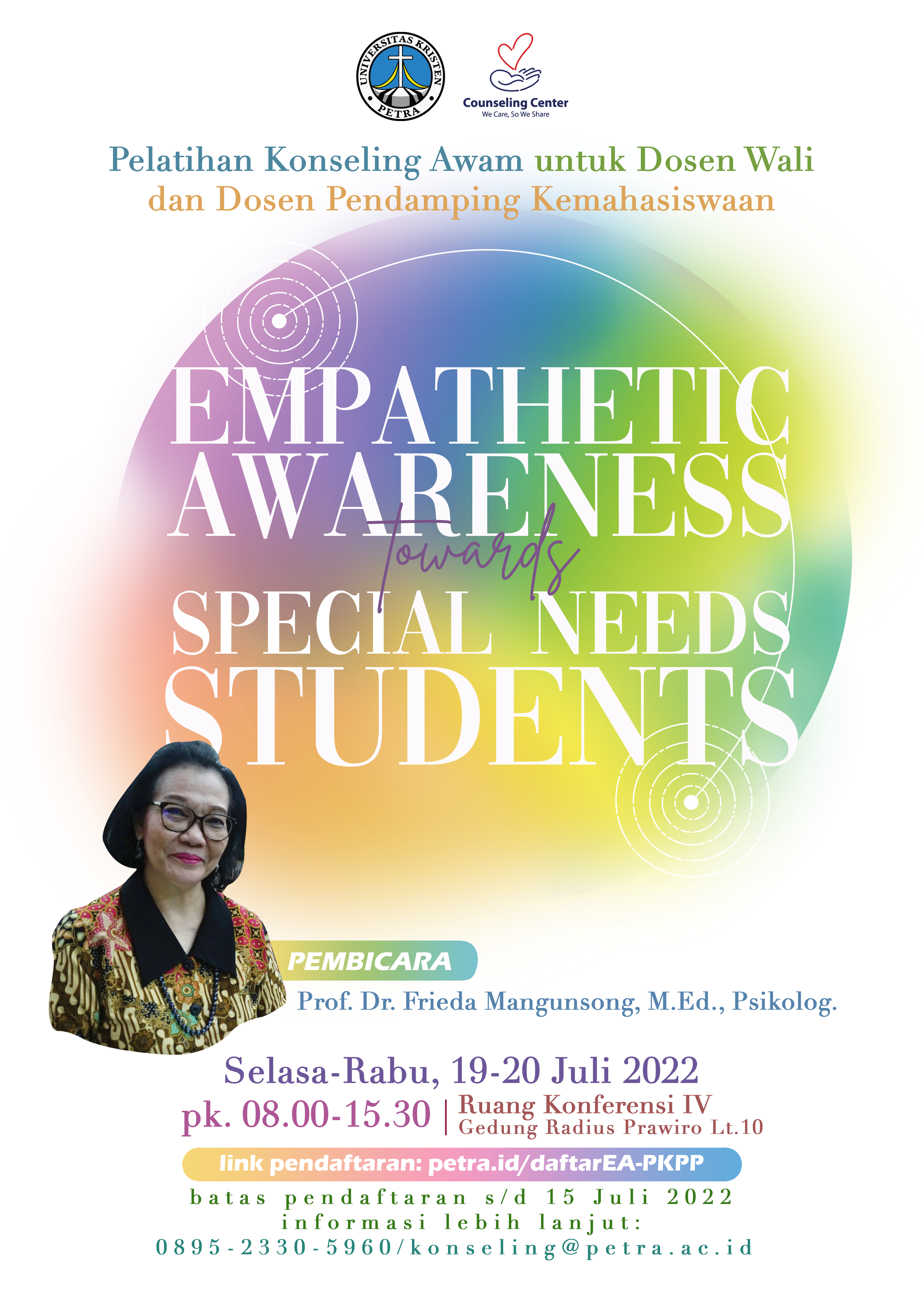 Library's collection Library's IT development CancelPelatihan konseling awam untuk dosen wali dan dosen pendamping kemahasiswaan secara khusus tentang bagaimana memberikan PFA (pertolongan pertama psikologis) bagi mahasiswa yang berkebutuhan khusus/memiliki problem psikologis. Acara ini diadakan oleh Pusat Konseling dan Pengembangan Pribadi UK Petra pada tanggal 19-20 Juli 2022 Jam 08.00 - 15.30 WIB bertempat di Ruang Konferensi IV gedung Radius Prawiro lantai 10. Dengan menghadirkan Prof. Dr. Frieda Mangunsong, M.Ed.,Psikolog.