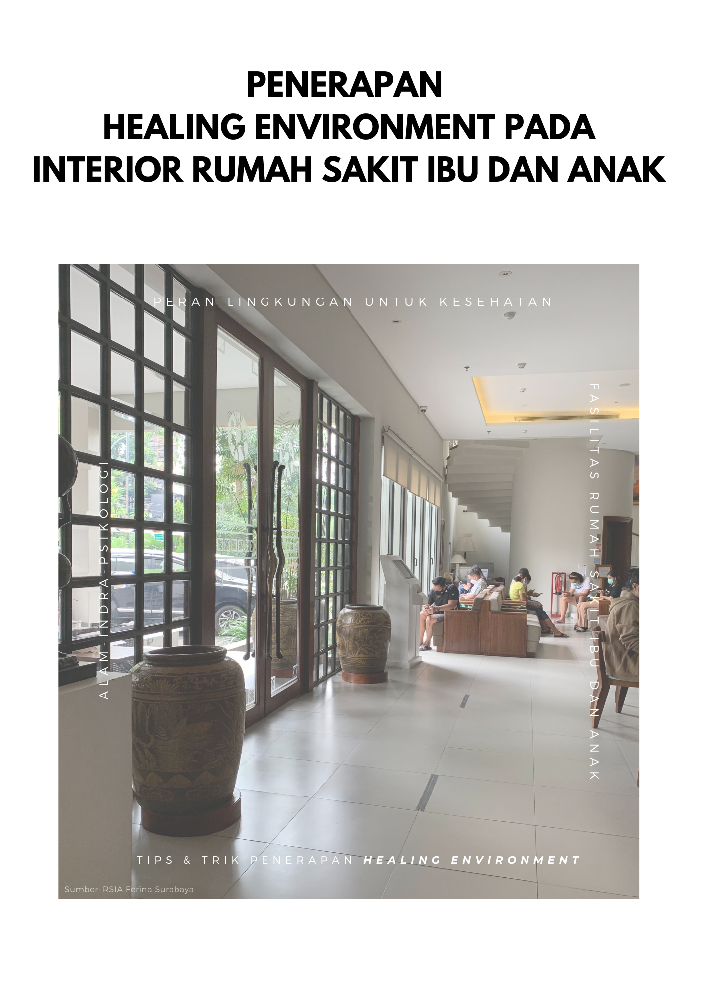 Library's collection Library's IT development CancelKota Surabaya merupakan kota dengan angka kepadatan penduduk terbanyak di Provinsi Jawa Timur yaitu sebesar 2.904.751 jiwa pada tahun 2020. Salah satu faktor pertumbuhan penduduk yang meningkat yaitu adanya angka kelahiran yang cukup tinggi. Hal ini tentunya berpengaruh pada peningkatan jumlah ibu hamil, sehingga diperlukan fasilitas yang layak dalam melakukan proses persalinan. Pendekatan healing environment merupakan salah satu bentuk desain yang memperhatikan lingkungan sebagai faktor yang dapat mempengaruhi penyembuhan pasiennya. Dalam penelitian ini terdapat 2 pokok masalah yang dibahas, yaitu bagaimana prinsip-prinsip healing environment diterapkan pada bangunan RSIA Ferina dan apakah RSIA Ferina telah memiliki desain bangunan yang mengaplikasikan pendekatan healing environment.