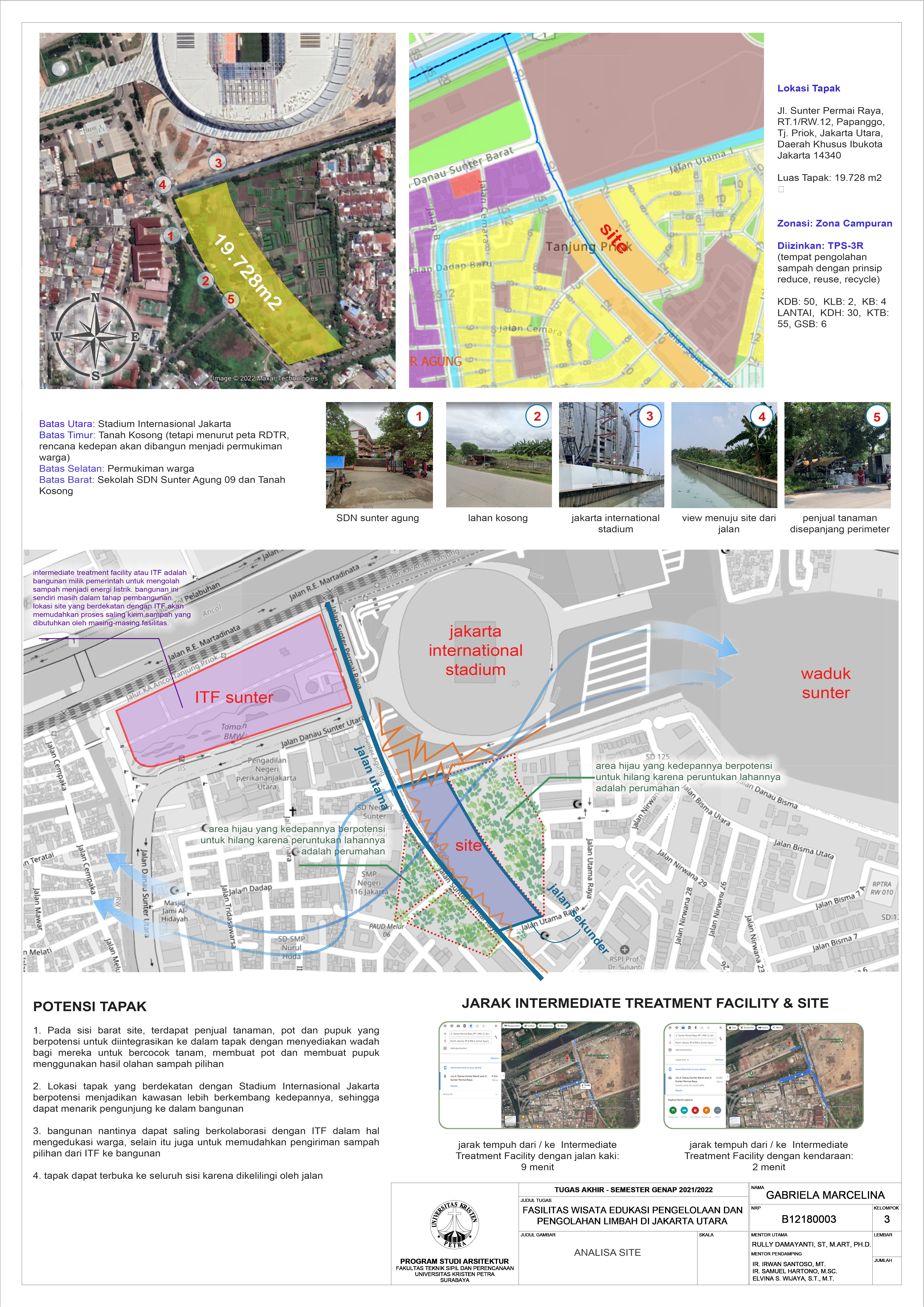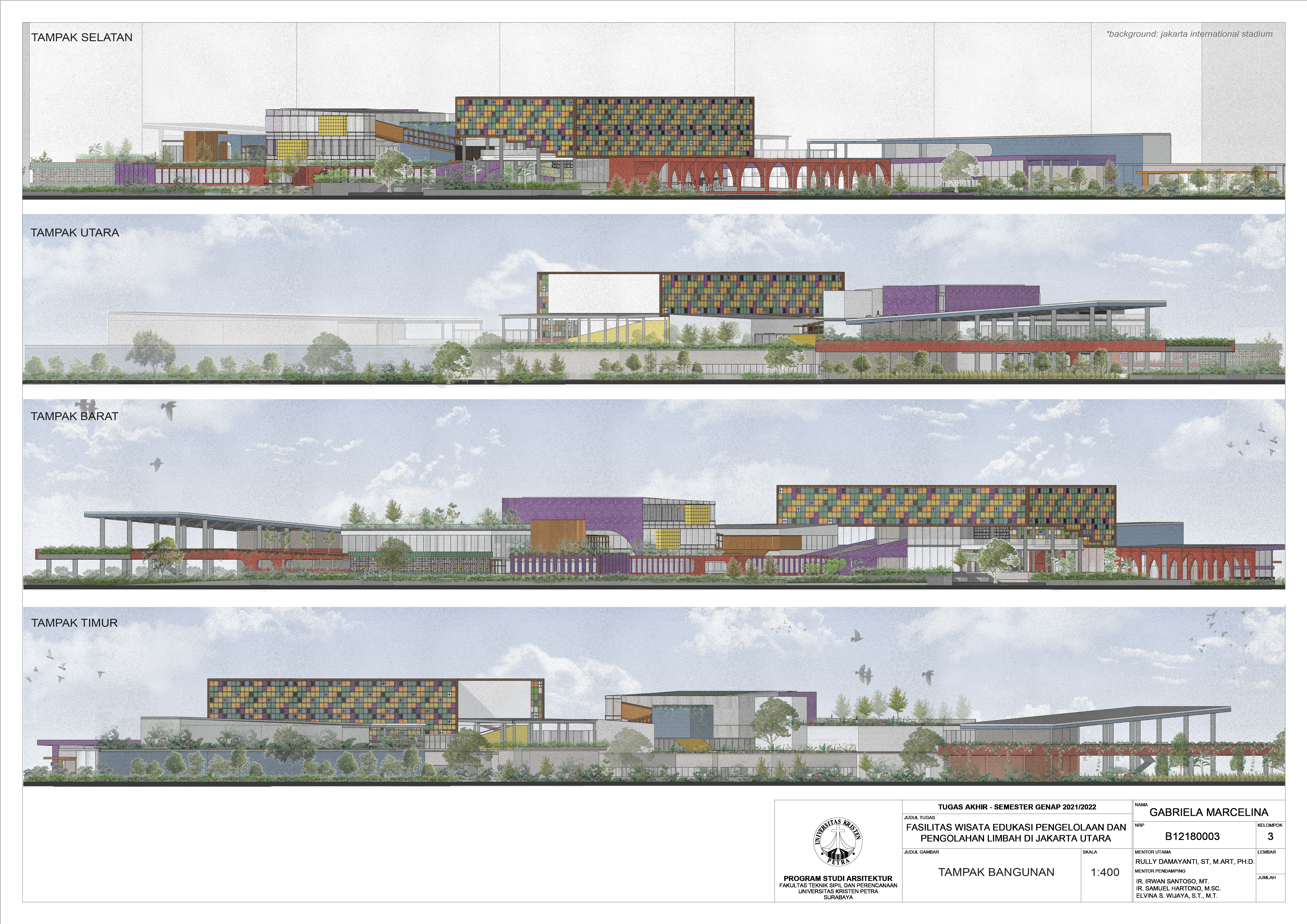 Library's collection Library's IT development CancelFasilitas Wisata Edukasi Pengelolaan dan Pengolahan Limbah merupakan sebuah fasilitas untuk mengelola dan mengolah limbah-limbah pilihan, sekaligus sebagai tempat untuk edukasi dan wisata bagi seluruh masyarakat Indonesia khususnya warga kota Jakarta. Pada fasilitas ini, limbah-limbah pilihan seperti limbah plastik, kertas, ampas kopi, cangkang telur, daun kering, plastik multilayer dan puntung rokok diolah menjadi produk baru dan bernilai. Misalnya diolah menjadi panel eksterior dan interior, paving block, roster, piring, gelas, vas bunga, dan sebagainya. Dikarenakan adanya latar belakang sistem pengelolaan dan pengolahan limbah di kota Jakarta yang kurang transparan, menyebabkan masyarakat menjadi kurang sadar akan urgensi limbah saat ini sehingga seringkali tidak menerapkan prinsip reduce, reuse dan recycle. Masalah desain utama yang diangkat adalah perlunya transparansi dalam sistem pengelolaan dan pengolahan limbah di dalam bangunan, agar dapat memaksimalkan proses edukasi bagi para pengunjung. Sehingga konsep utama fasilitas adalah transparansi untuk transformasi, dimana diperlukan transparansi agar setiap pengunjung dapat bertransformasi dengan melihat, mengenal dan memahami keseluruhan proses dan aktivitas di dalam fasilitas. Maka, pendekatan yang diambil adalah sistem sirkulasi agar dapat menjawab konsep transparansi antara pengguna, karyawan, pengelolaan dan pengolahan limbah.