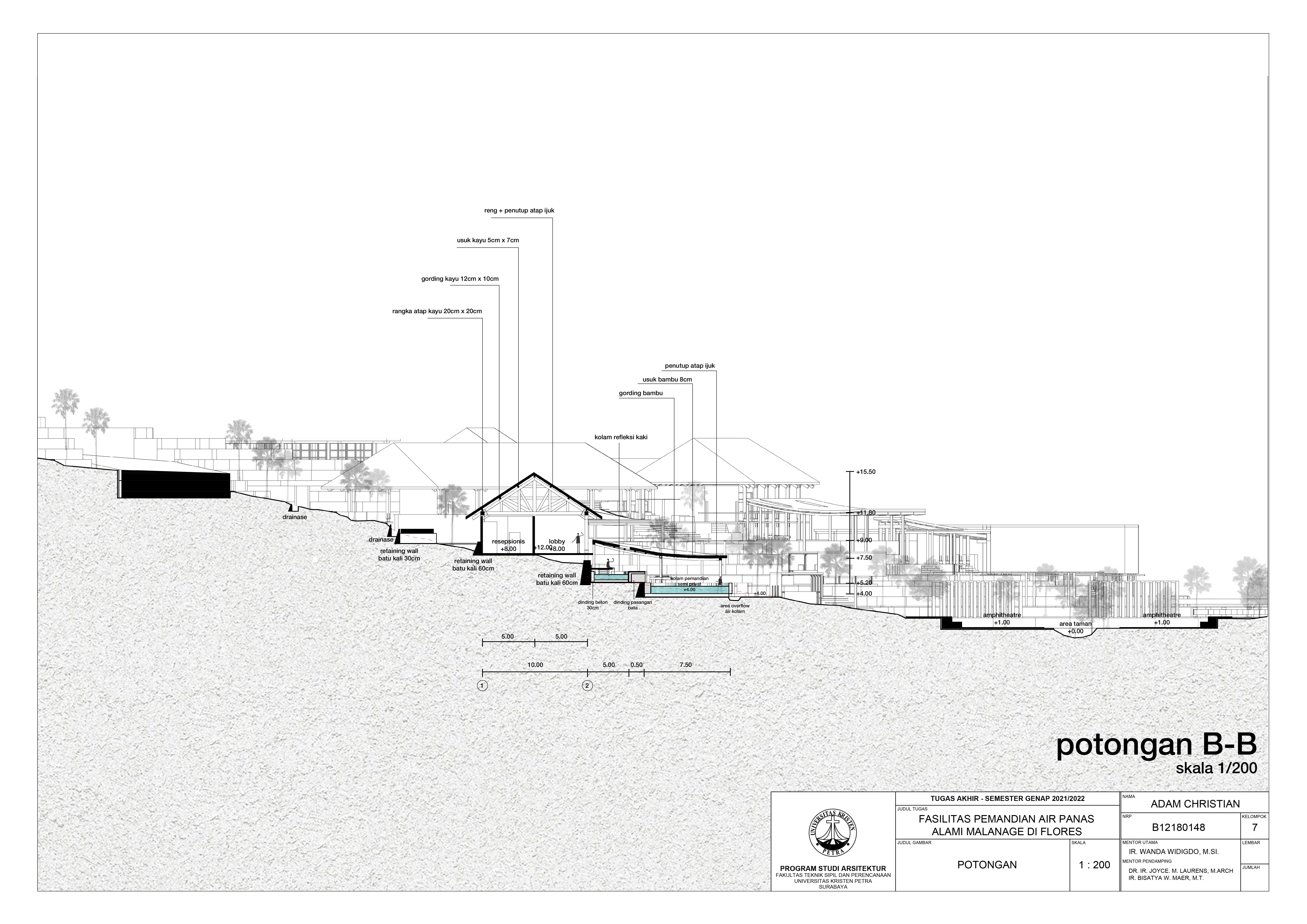 Library's collection Library's IT development CancelKawasan pemandian air panas alami Malanage di Flores memiliki potensi alam yang unik dengan adanya pertemuan 2 aliran sungai yang menghasilkan 3 temperatur air; panas-hangat-dan dingin, yang mengalir di antara pepohonan dan batuan. Minimnya fasilitas penunjang dalam eksisting site membuat kawasan pemandian tersebut memiliki potensi pengembangan dalam masa mendatang. Pendekatan ekosistem dapat memanfaatkan lingkungan sekitar sebagai salah satu elemen dalam desain untuk menciptakan ruang-ruang interaksi antar manusia dengan alam sekitarnya. Intensi desain perancangan diutamakan sebagai fasilitas relaksasi dengan aktivitas Balneoterapi untuk pengunjung yang dapat dilakukan pada sungai dan kolam buatan yang didukung oleh jumlah area terbuka yang luas pada bangunan