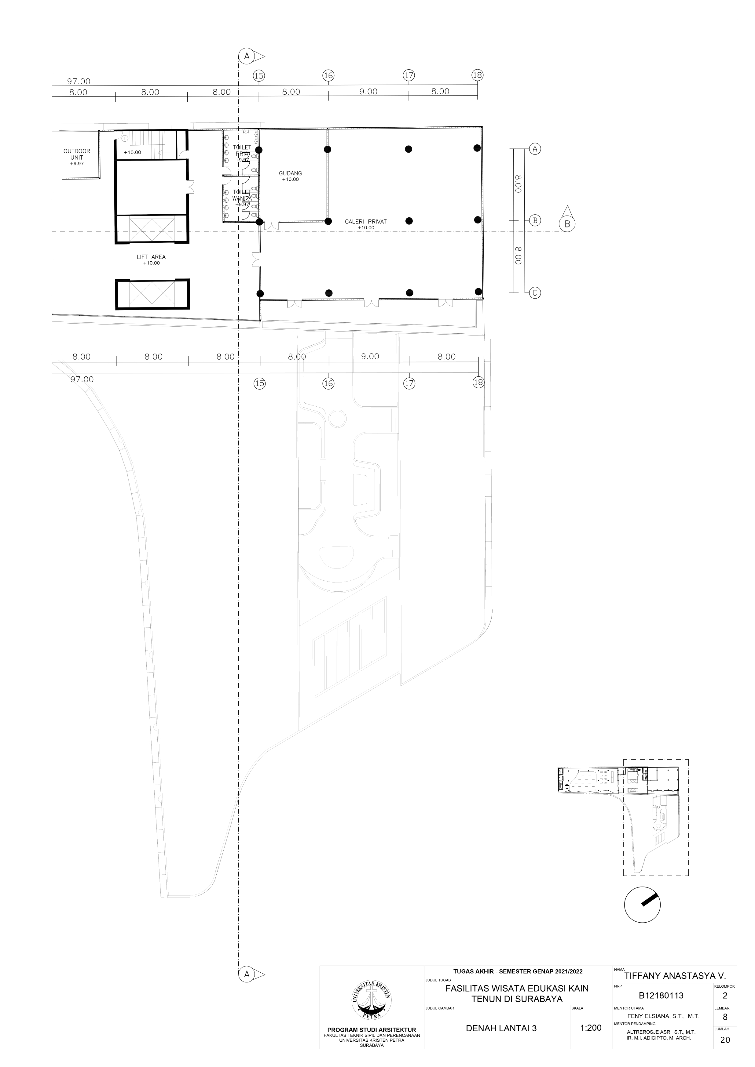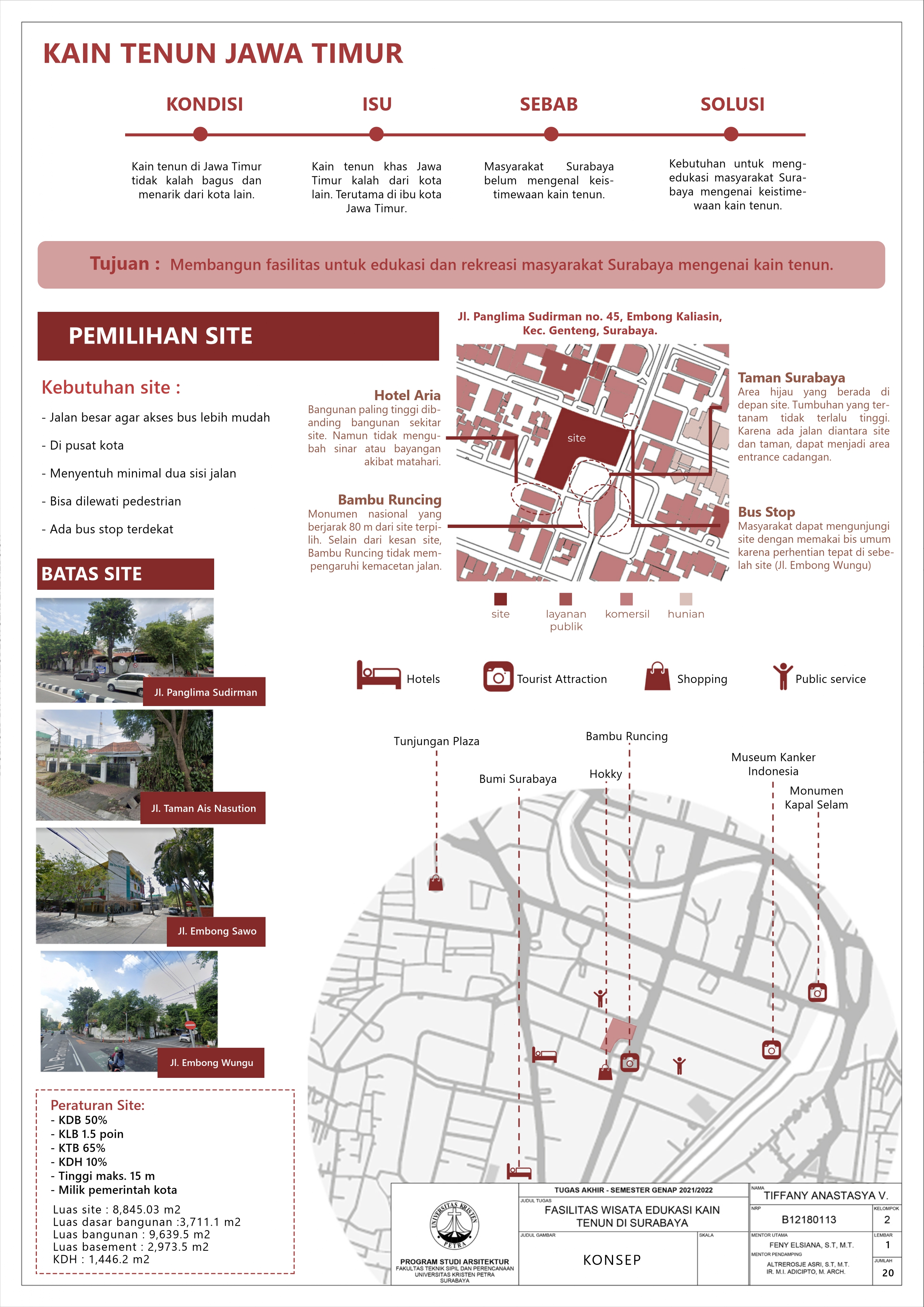 Library's collection Library's IT development CancelWisata tenun merupakan tempat rekreasi di mana pengunjung dapat melihat proses dan hasil pembuatan kain tenun. Sampai saat ini, industri tenun di Indonesia masih menjadi daya tarik wisata lokal maupun internasional. Namun kegiatan wisata ini belum tersorot di ibu kota Jawa Timur, yaitu Surabaya. Maka dari itu, tugas ini merencanakan Fasilitas Eduwisata Kain Tenun di Surabaya. Lokasi yang terpilih adalah di Jl. Panglima Sudirman no. 45. Fasilitas ini dapat menjadi kegiatan rekreasi baru di Surabaya. Dalam rangka merevitalisasi kecintaan penduduk Surabaya akan kain tenun Jawa Timur, fasilitas dibangun dengan pendalaman sequence dan teori behavior setting dimana proses desain akan memperhatikan bagaimana ruang akan membentuk perilaku dan perasaan pengunjung akan kain tenun. Program aktivitas dalam fasilitas ini seperti studi tur, pameran, dan kelas menenun dapat memberikan pengalaman yang tak terlupakan bagi pengunjung. Fasilitas Wisata Edukasi Kain Tenun dengan pendekatan spasial dapat menonjolkan keistimewaan budaya kain tenun Jawa Timur kepada masyarakat.